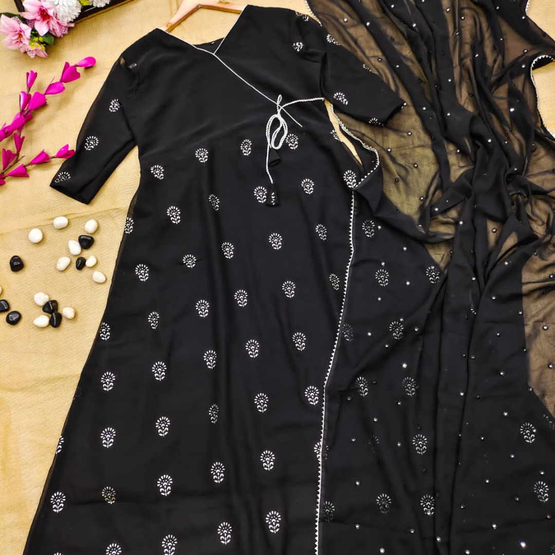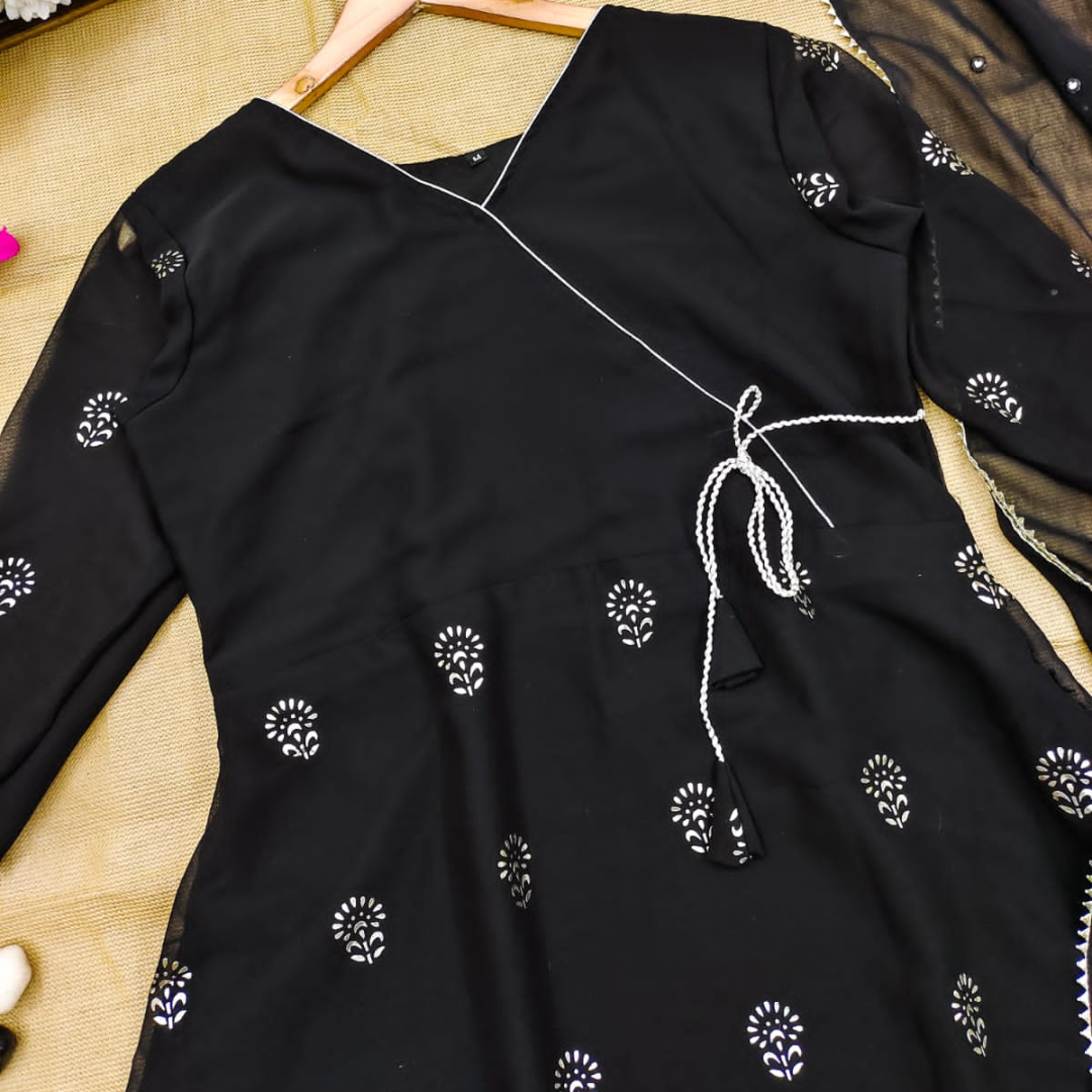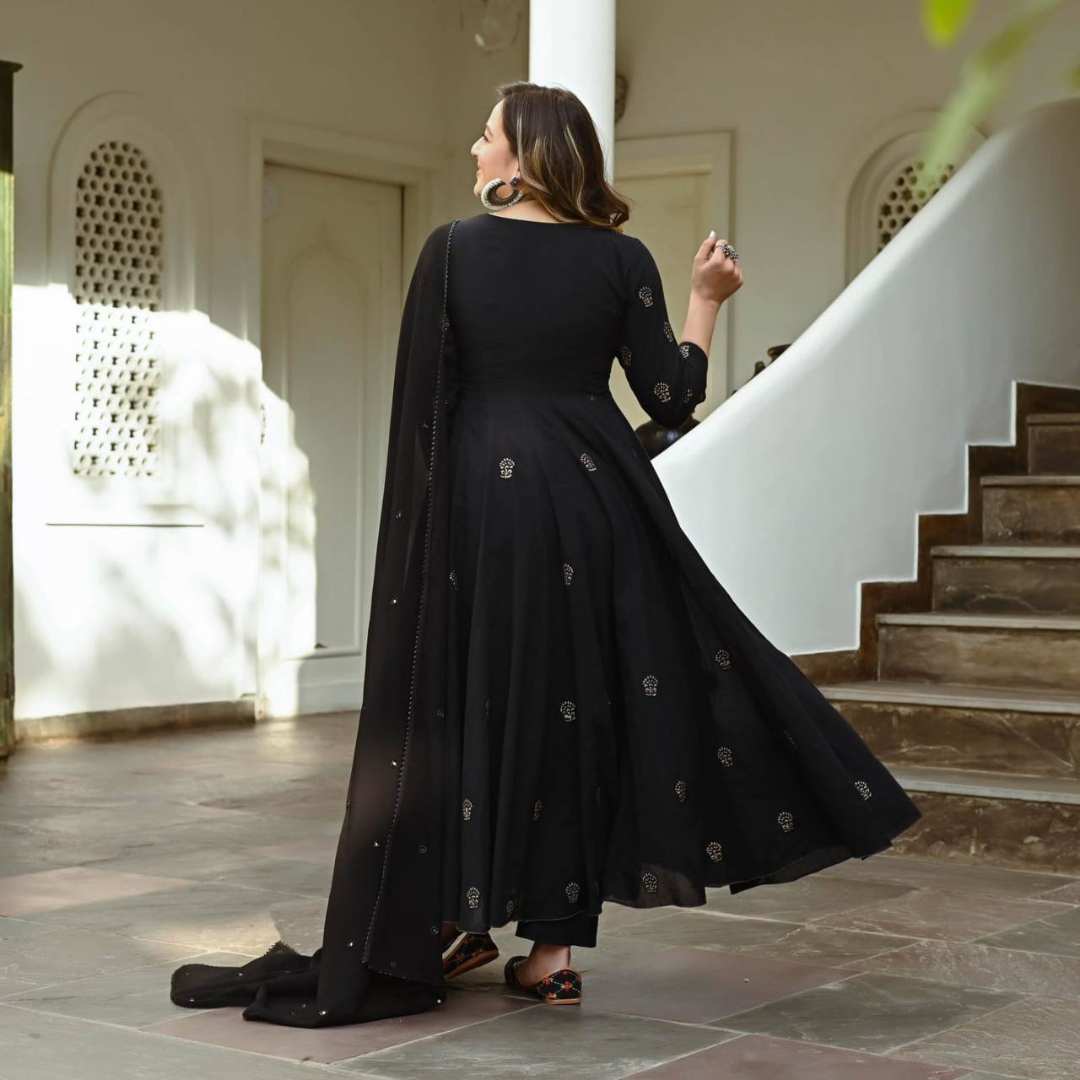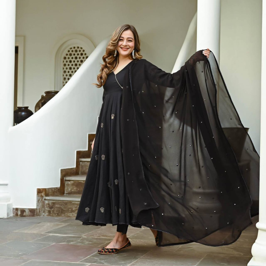 Hello lovely ladies ๐ black is never out of fashion this beautiful Leather print anarkali with a 9mm dupptta is a perfect n elegant outfit for the coming parties ๐๐