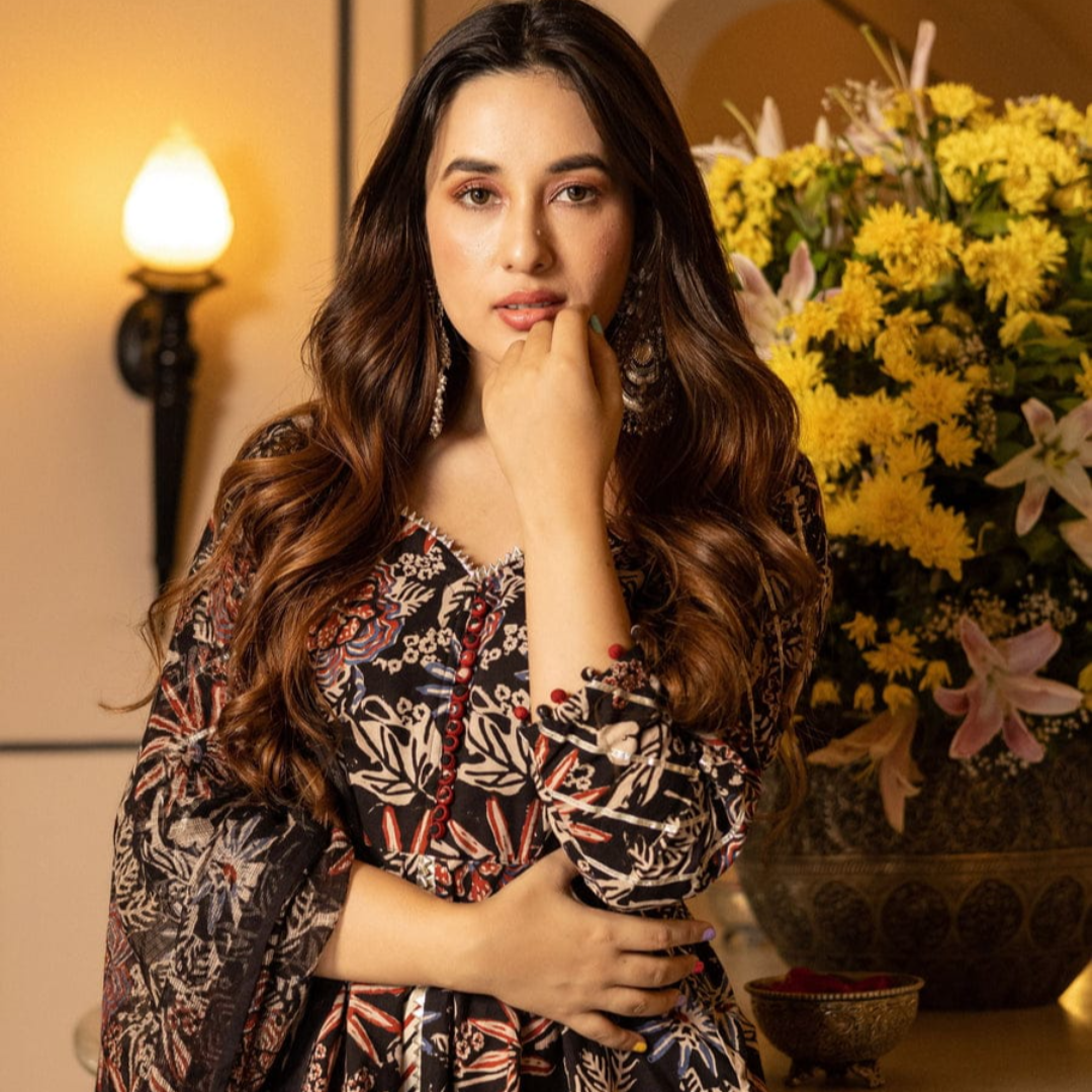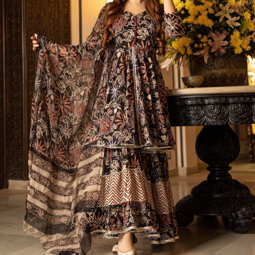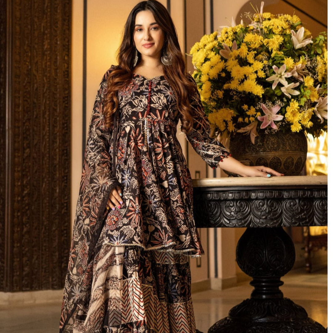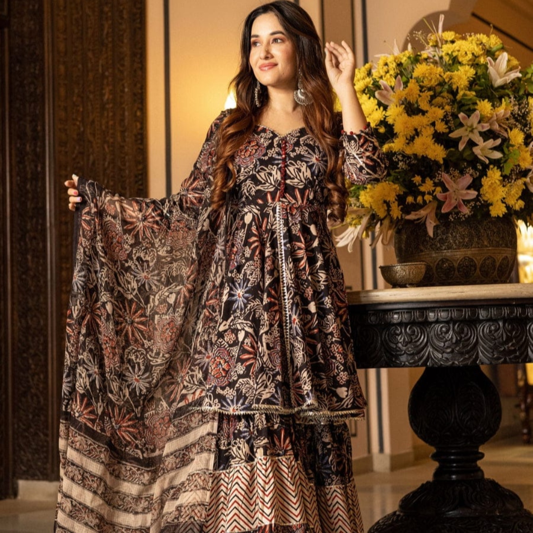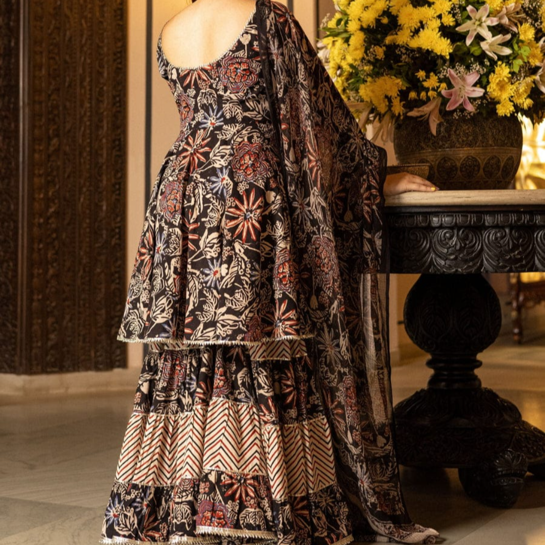 This beautiful Aranya Handblock Gotapatti Sharara Set. A designer kurta, wide flared sharara, and a complementing dupatta, the set is beautifully detailed with gota lace for that extra drama and a lot more fun