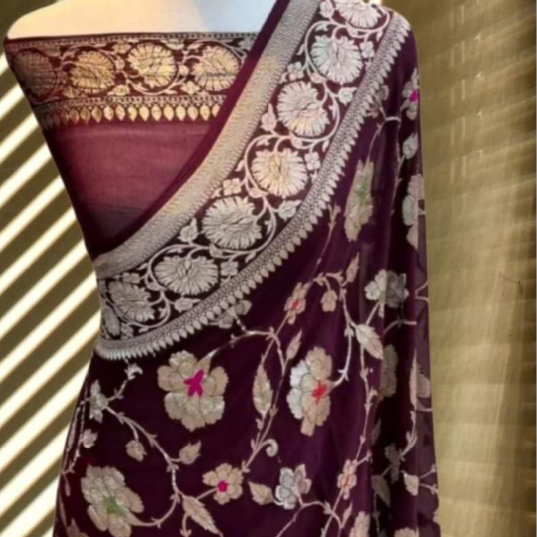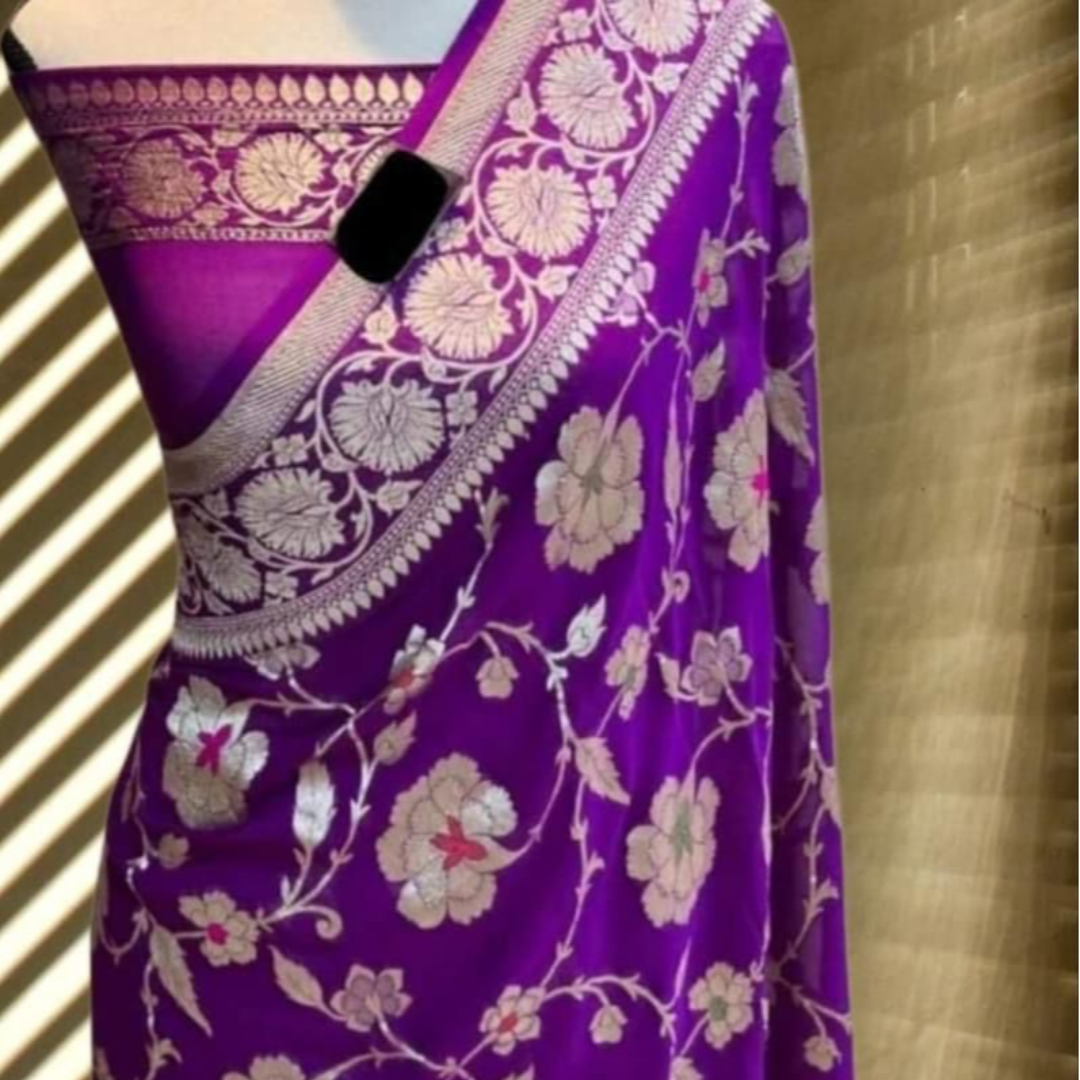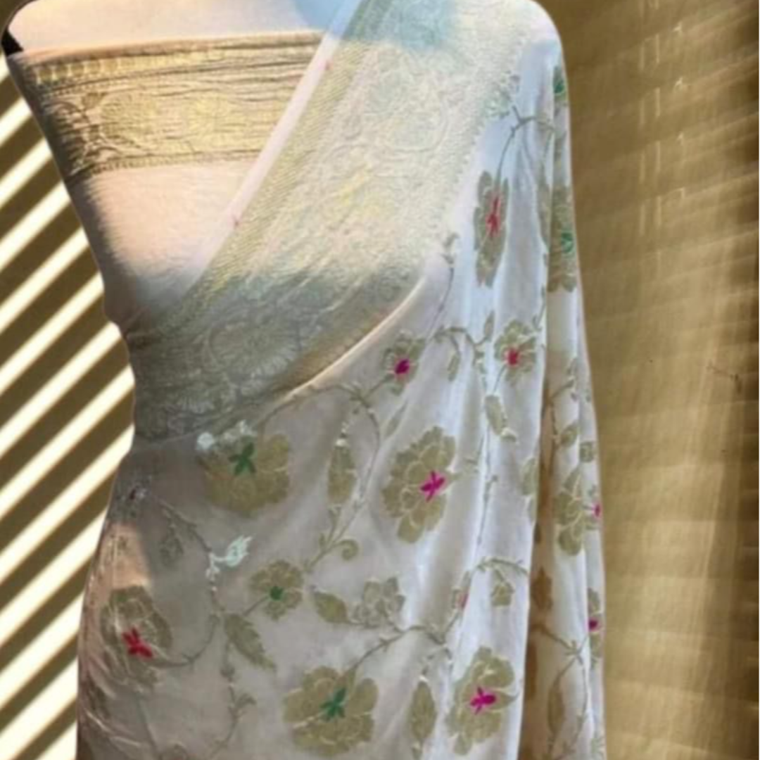 The beautiful gold zari weaving on soft, smooth, flowing pure Banarasi Khadi Georgette Silk sarees is apt for the festival and wedding seasons. 👗🧵