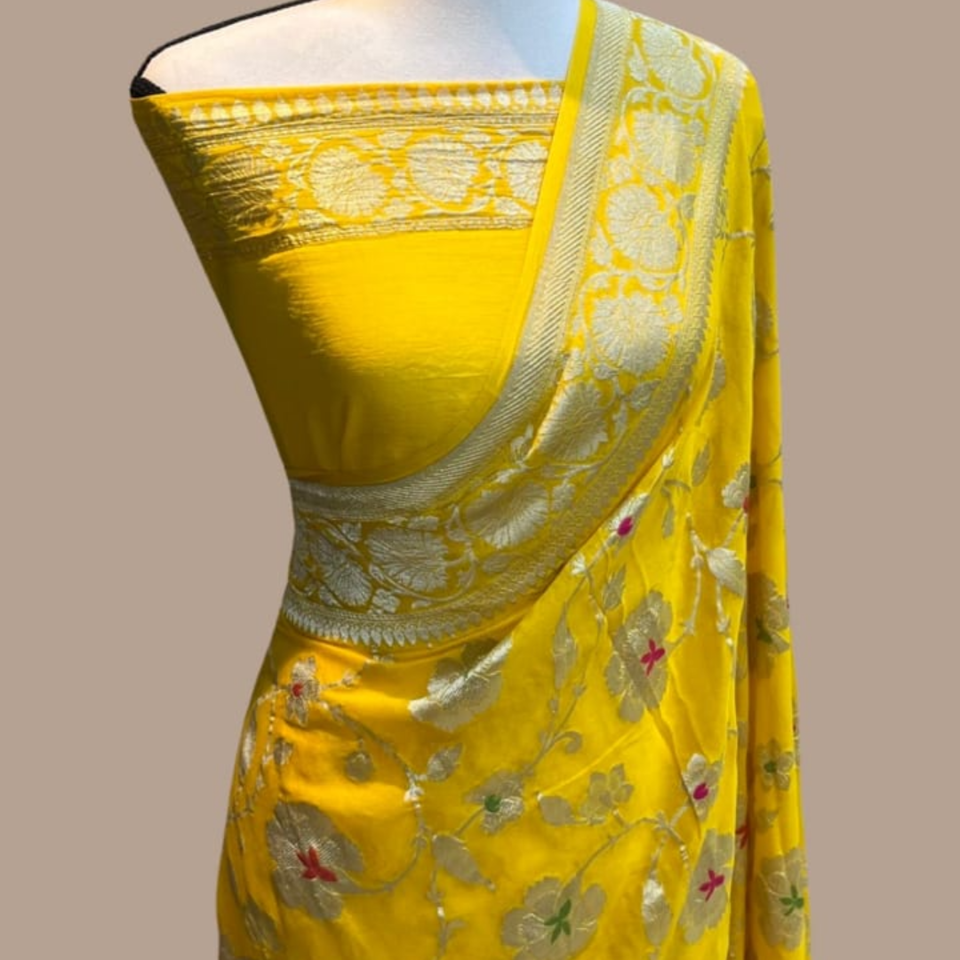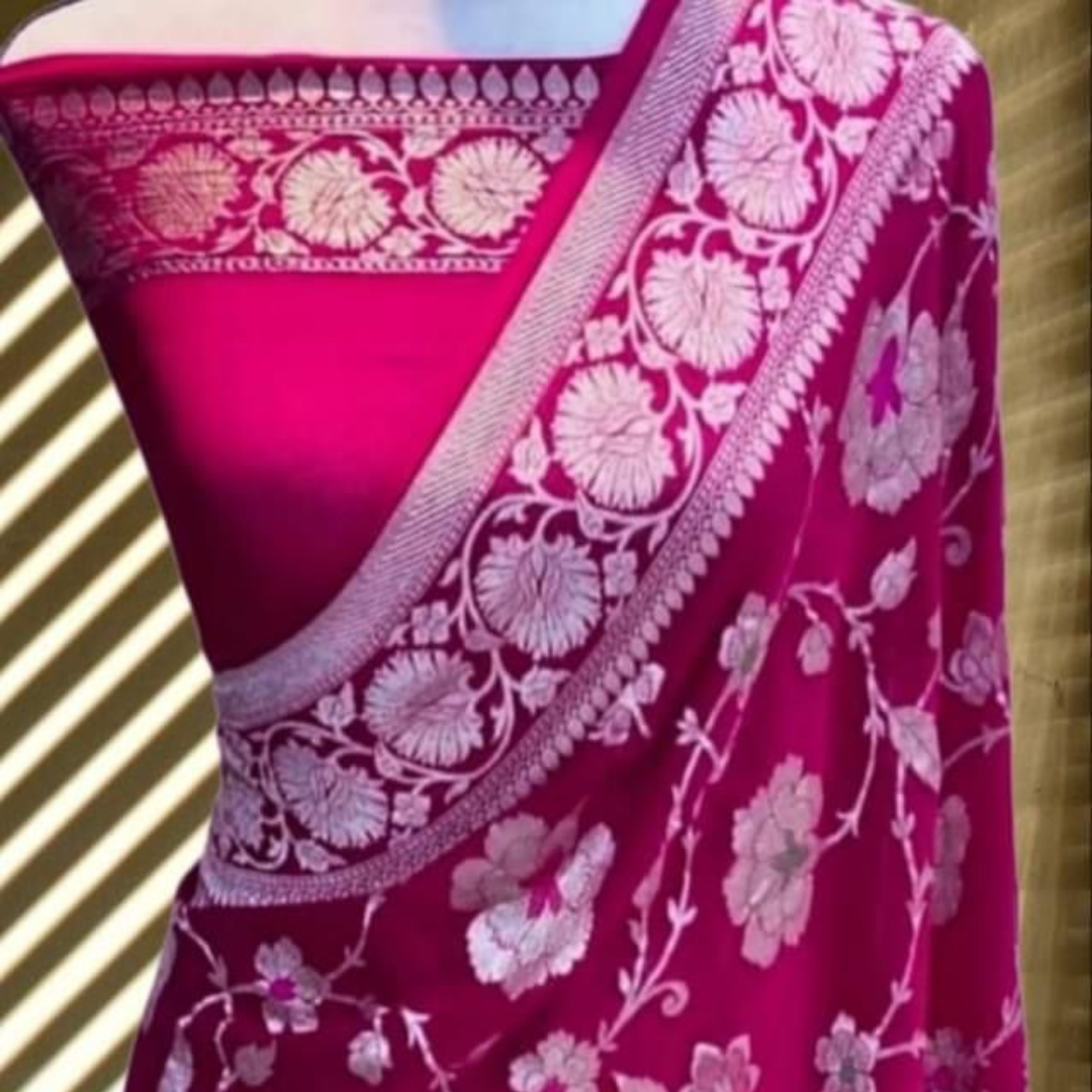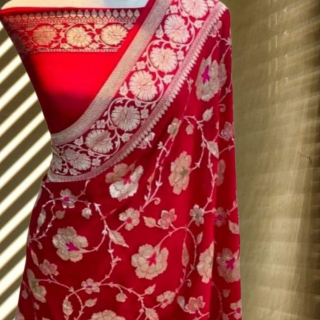 The beautiful gold zari weaving on soft, smooth, flowing pure Banarasi Khadi Georgette Silk sarees is apt for the festival and wedding seasons. 👗🧵