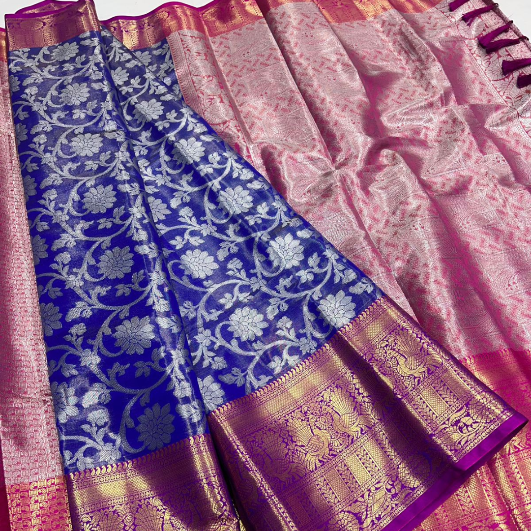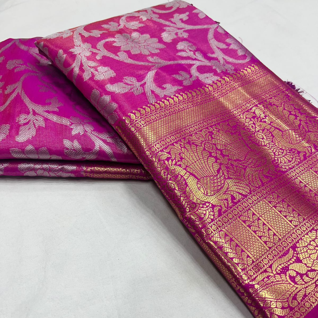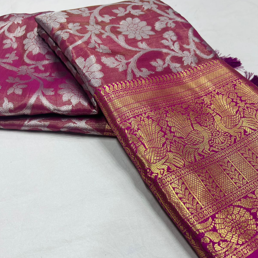 Fabric: Banarasi Tissue silk with Rich pallu, full body woven embossed design along with rich look blouse attached with the Saree