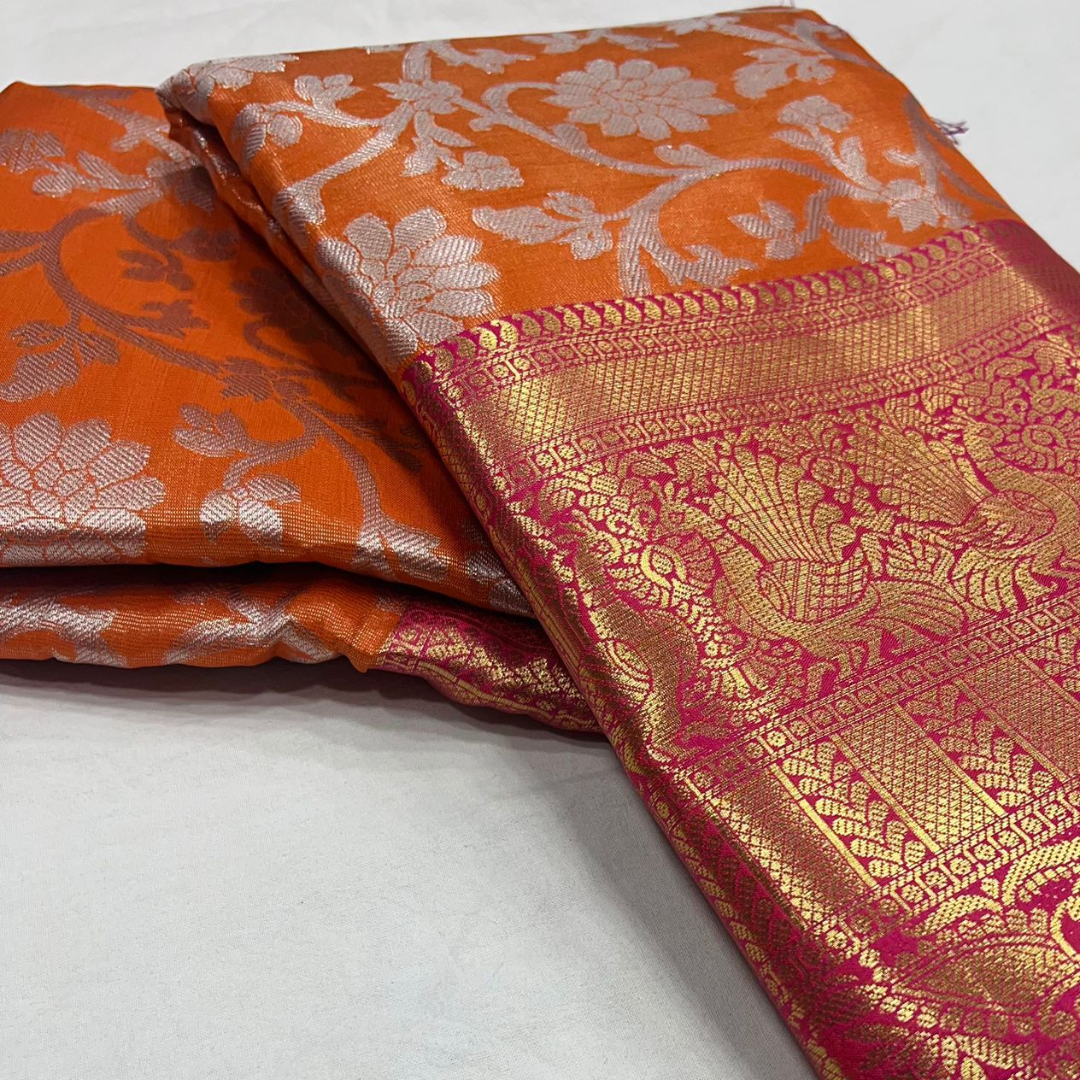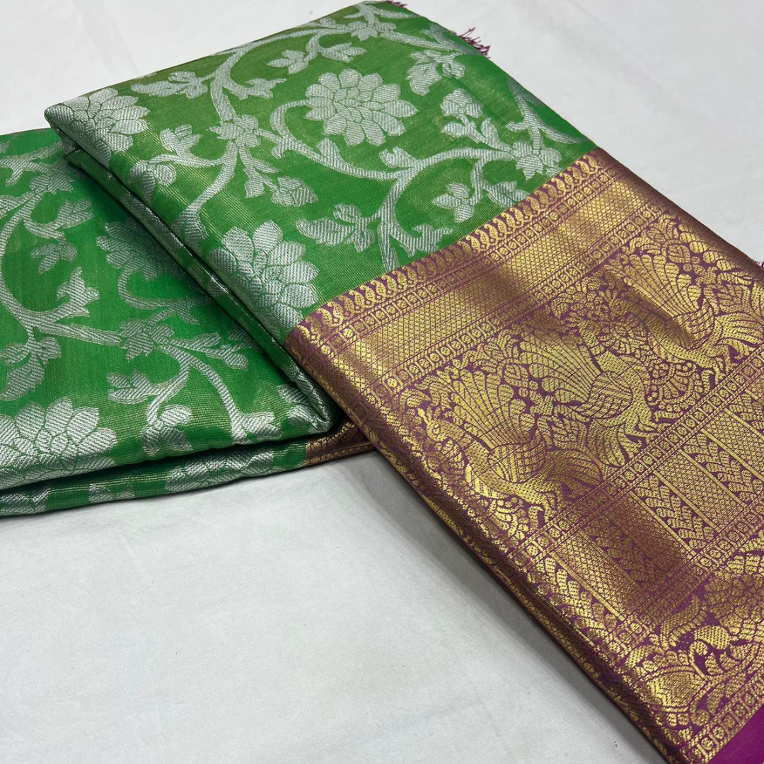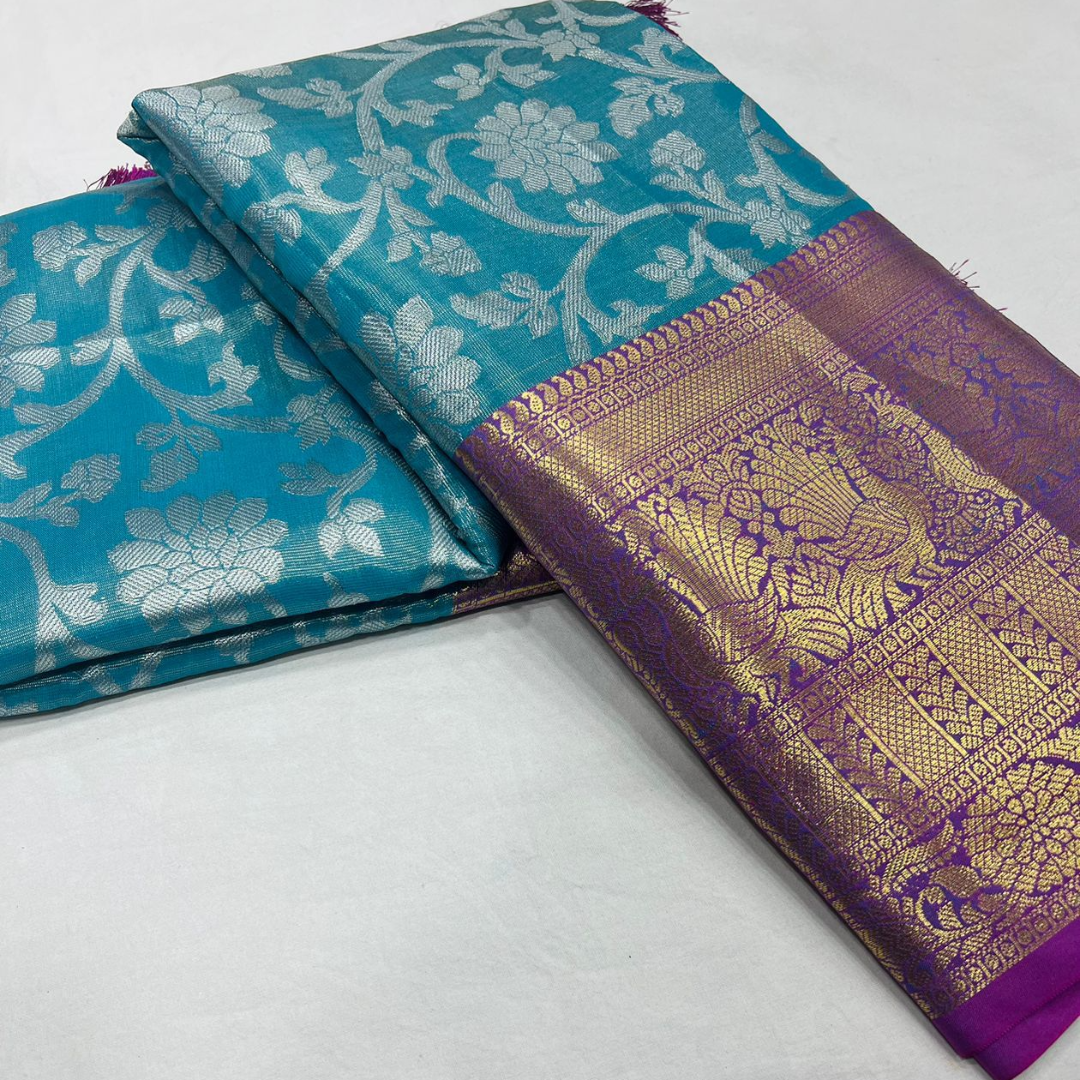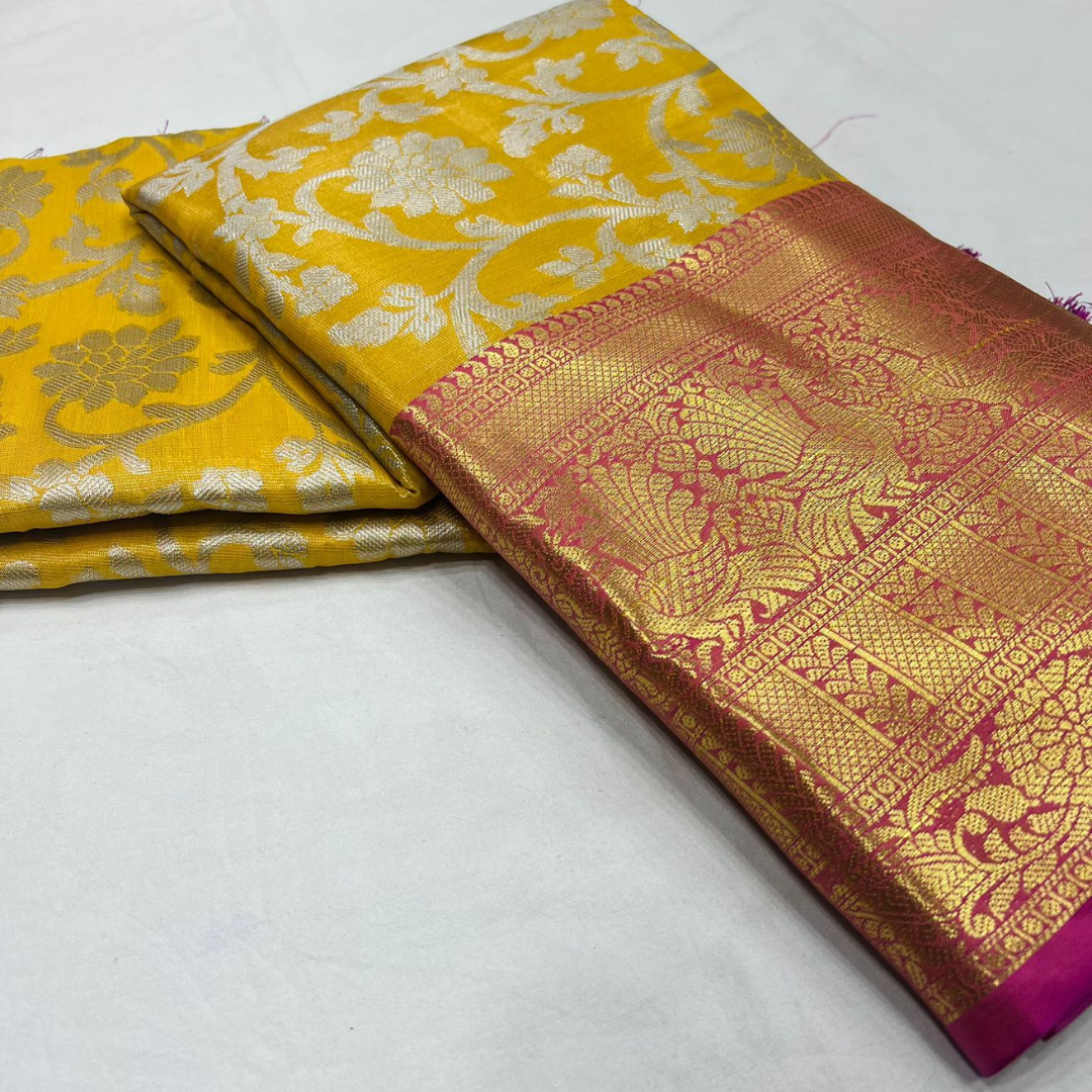 Fabric: Banarasi Tissue silk with Rich pallu, full body woven embossed design along with rich look blouse attached with the Saree