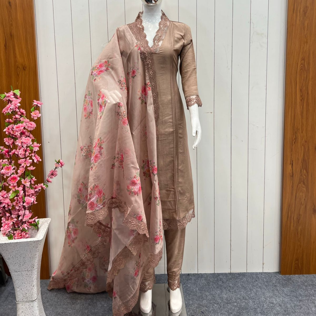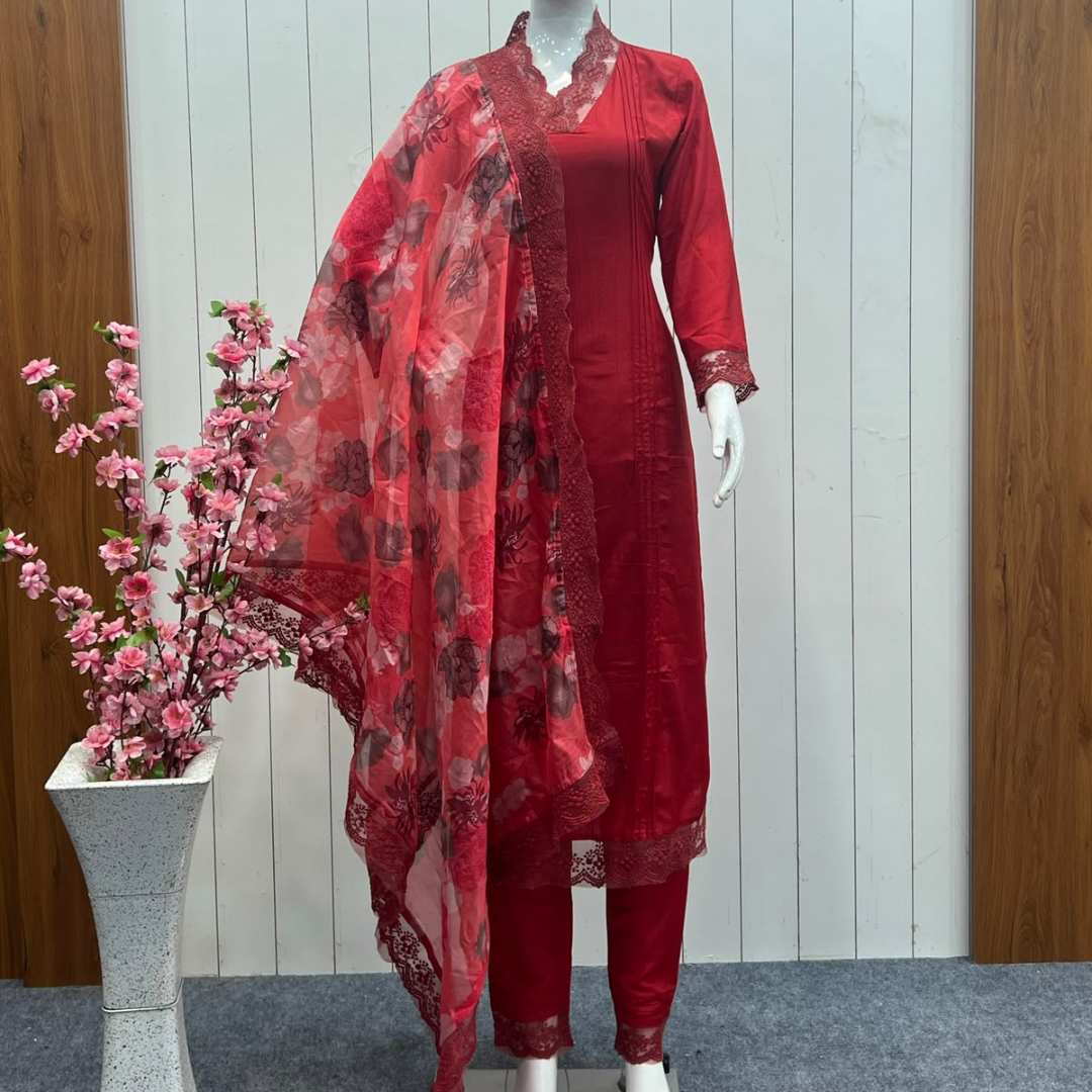 Beautiful kurta three piece set fancy cutwork lace detail on sleeves and necline with duppta set