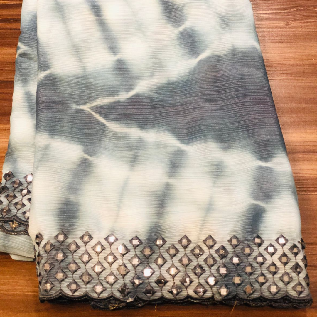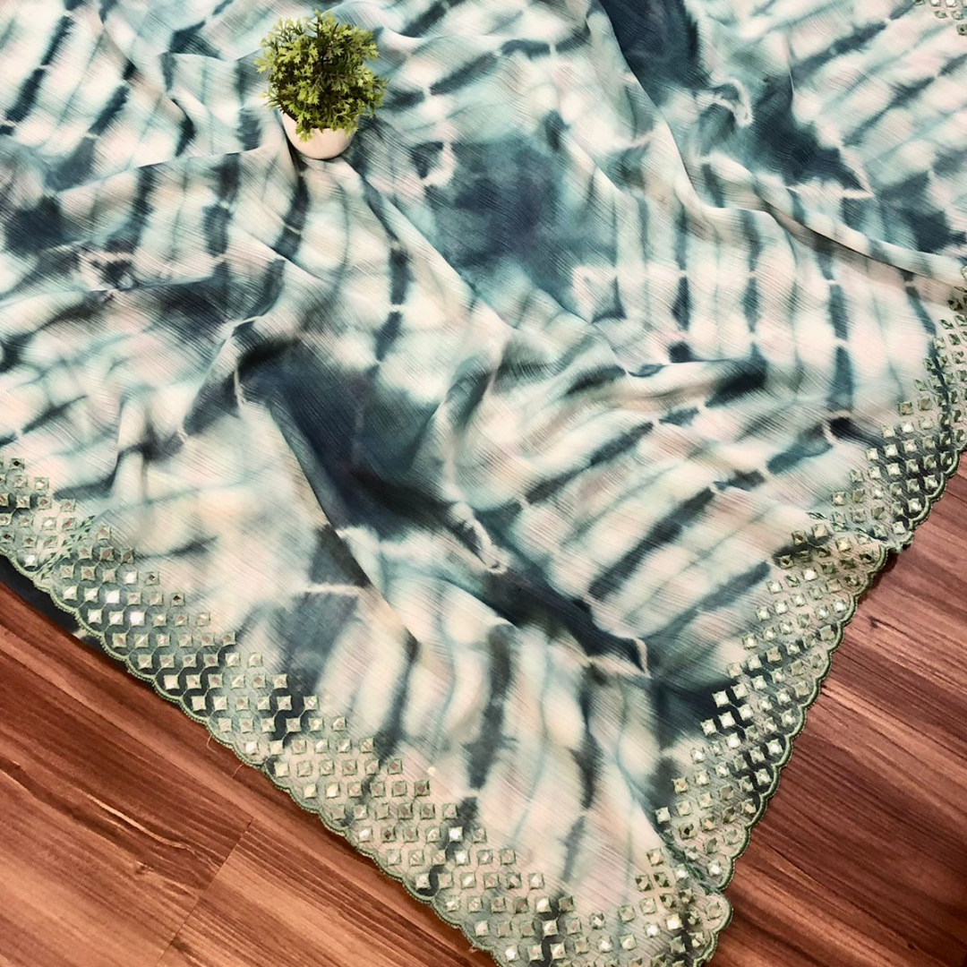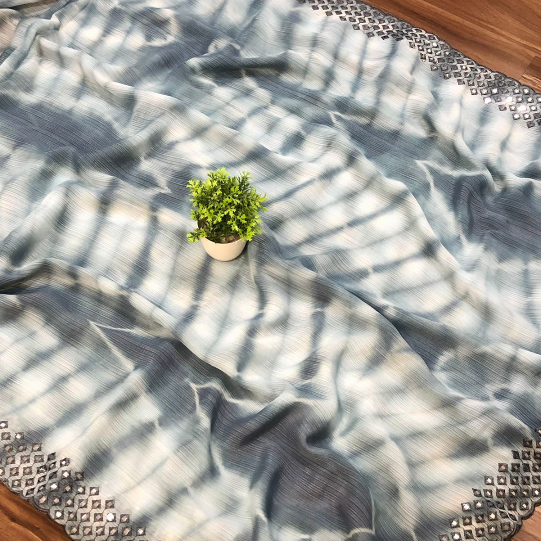 Pure and very soft Lite weight fancy Georgette chex sarees with all-over shibori print and all-over foil mirrors C-pallu work.