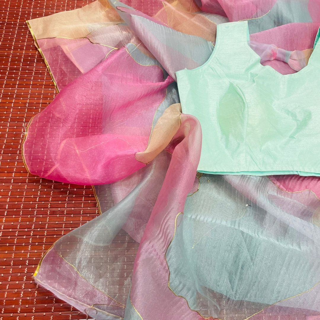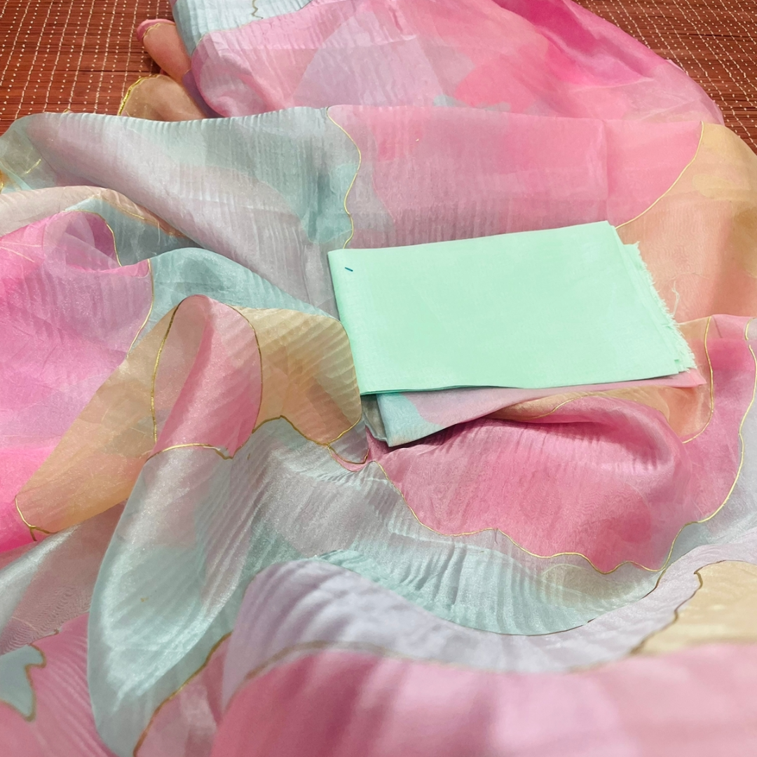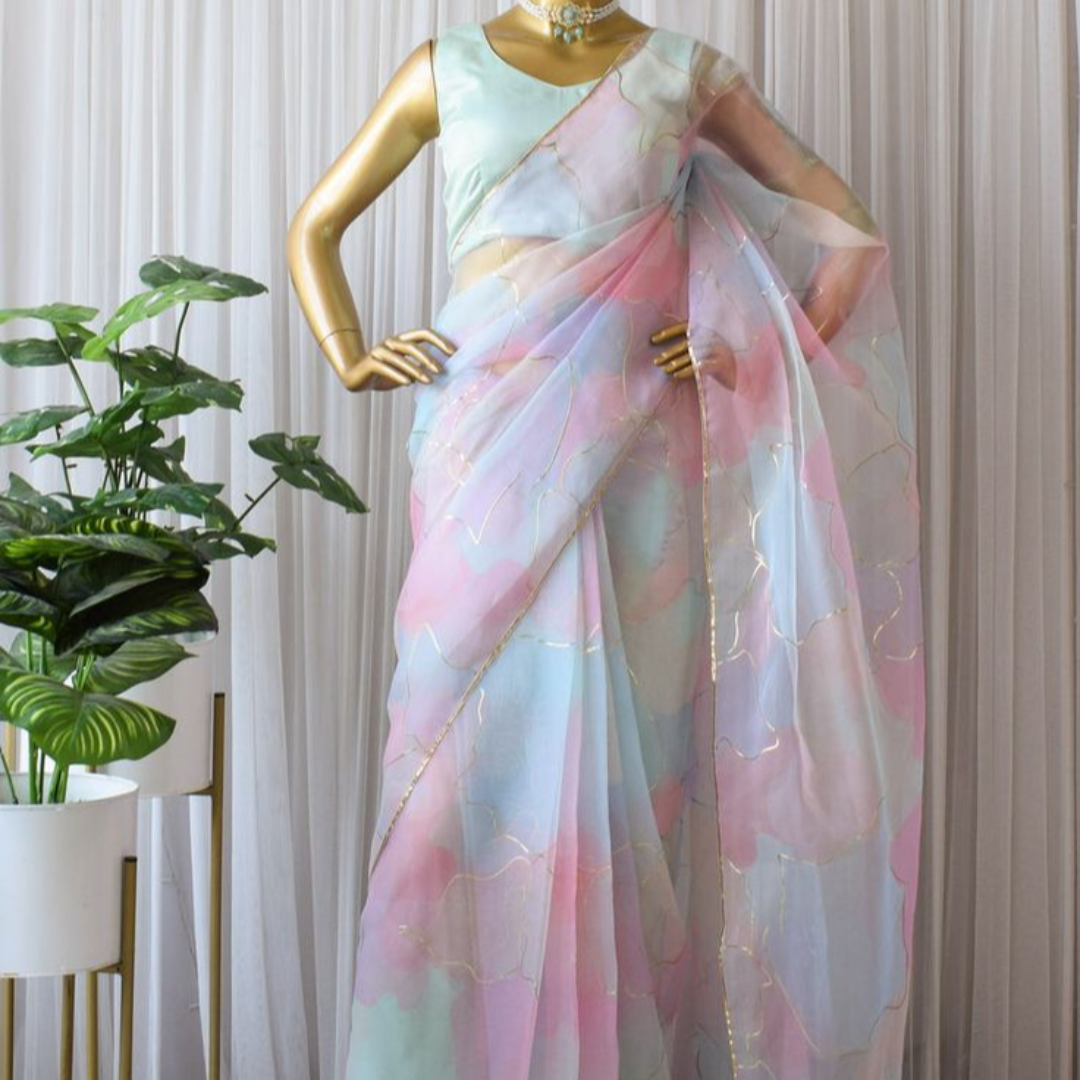 Top :- Classy Orgenza Digital Print In Rainbow With DueDrop Golden shine And Four Side gotta Lace Border