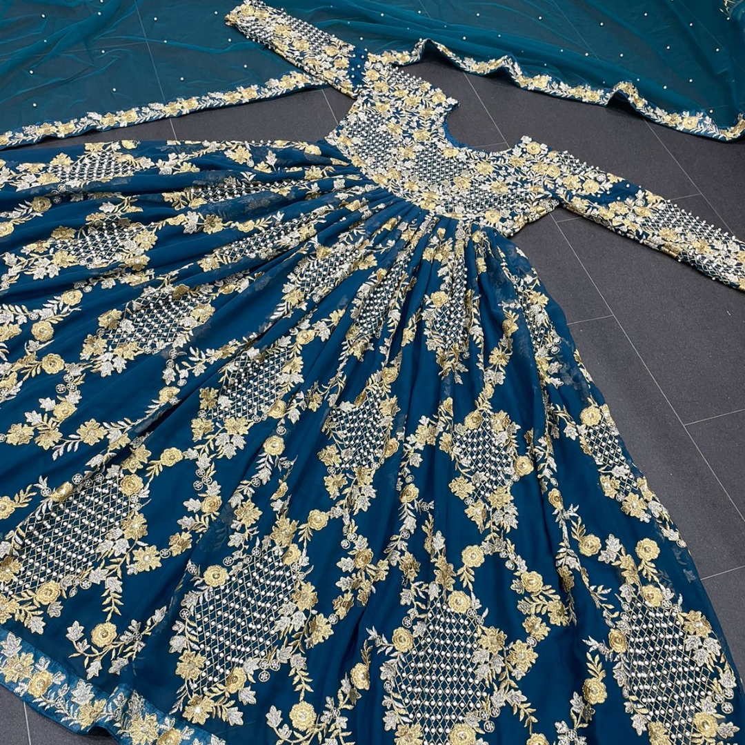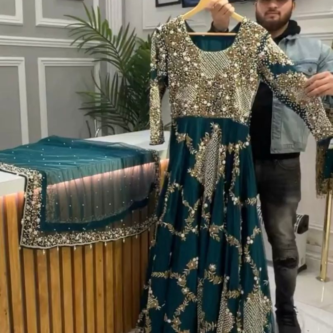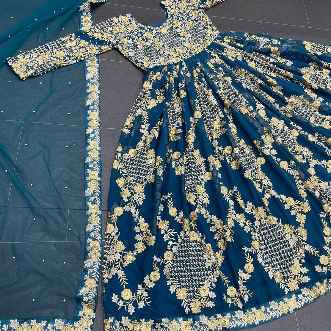 Looking for this same color beautiful Designer Suit On heavy Faux Georgette fabric with inner and Thred with Pearl work and Dupatta on Soft Net Fabric with Thred and Pearl work & Fancy Lace.
