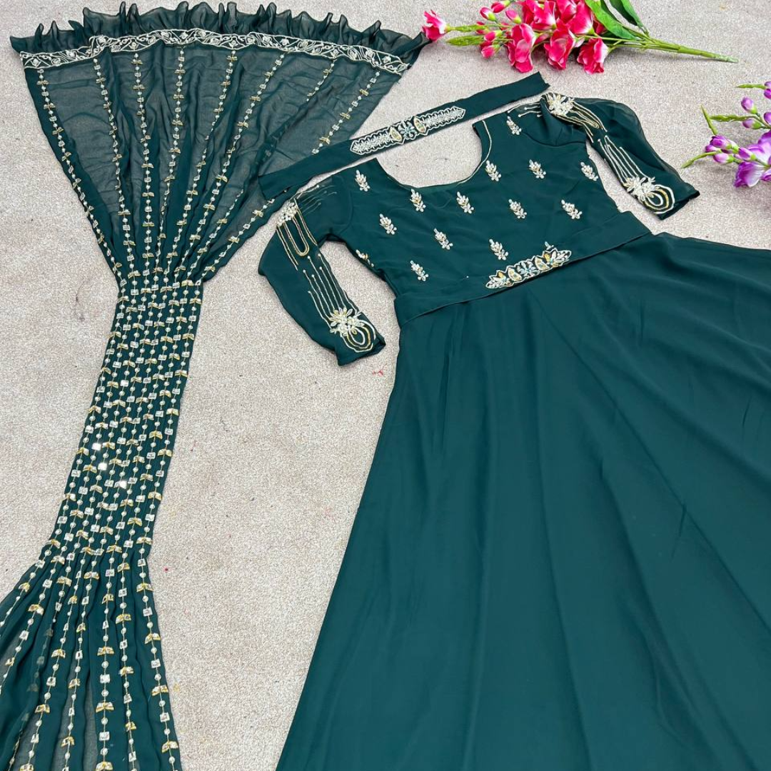Launching New Designer Party Wear Look Gown in Embroidery Work With 2 Belt
