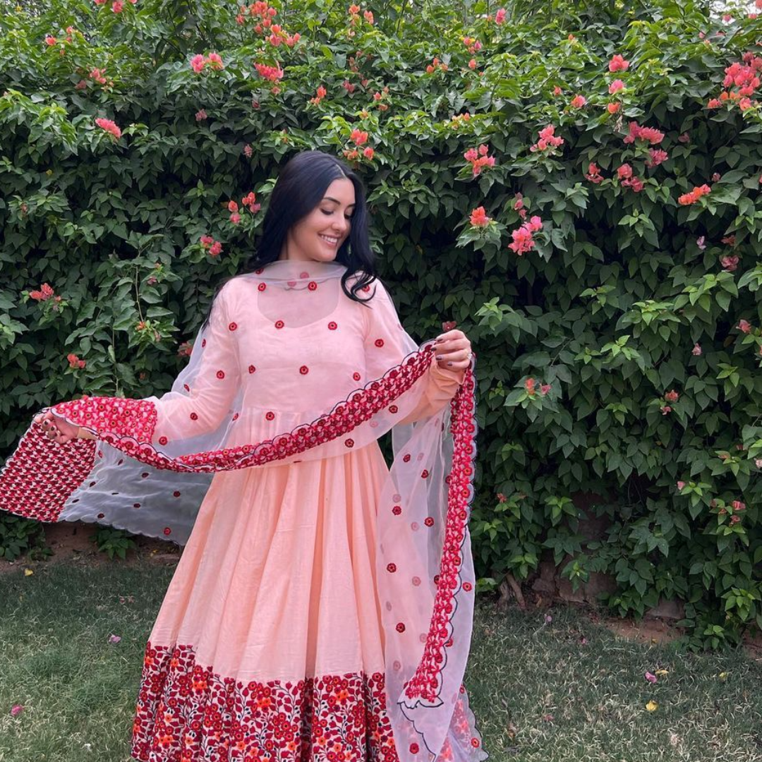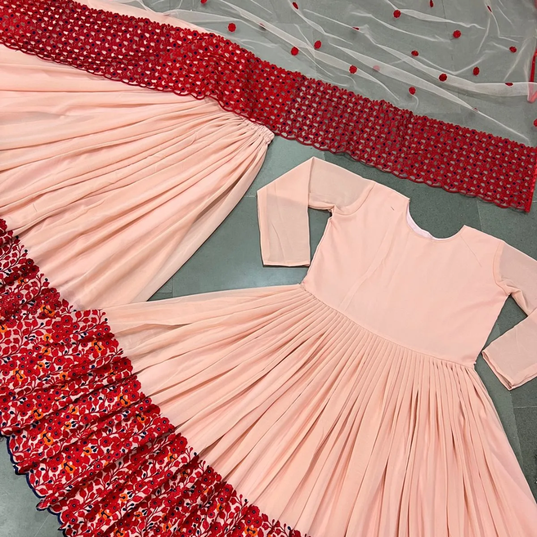 Sleeves *Top Flair* : 3 Meter *Top Inner * :Heavy Micro Cotton *Top Lenght* :48 inches *Top Size*. : 42 xl free size *(fullstitched )* *Plazzo Fabric* :Faux Georgette With *Heavy Embroidey Work* *(Stiched)* *Plazzo Inner* :Heavy Micro Cotton *Dupatta Fabrics* :Heavy Net With Embroidery Work and Embroidery lace Border *Dupatta Length*: 2.10 mtr *Weight* : 950 gm