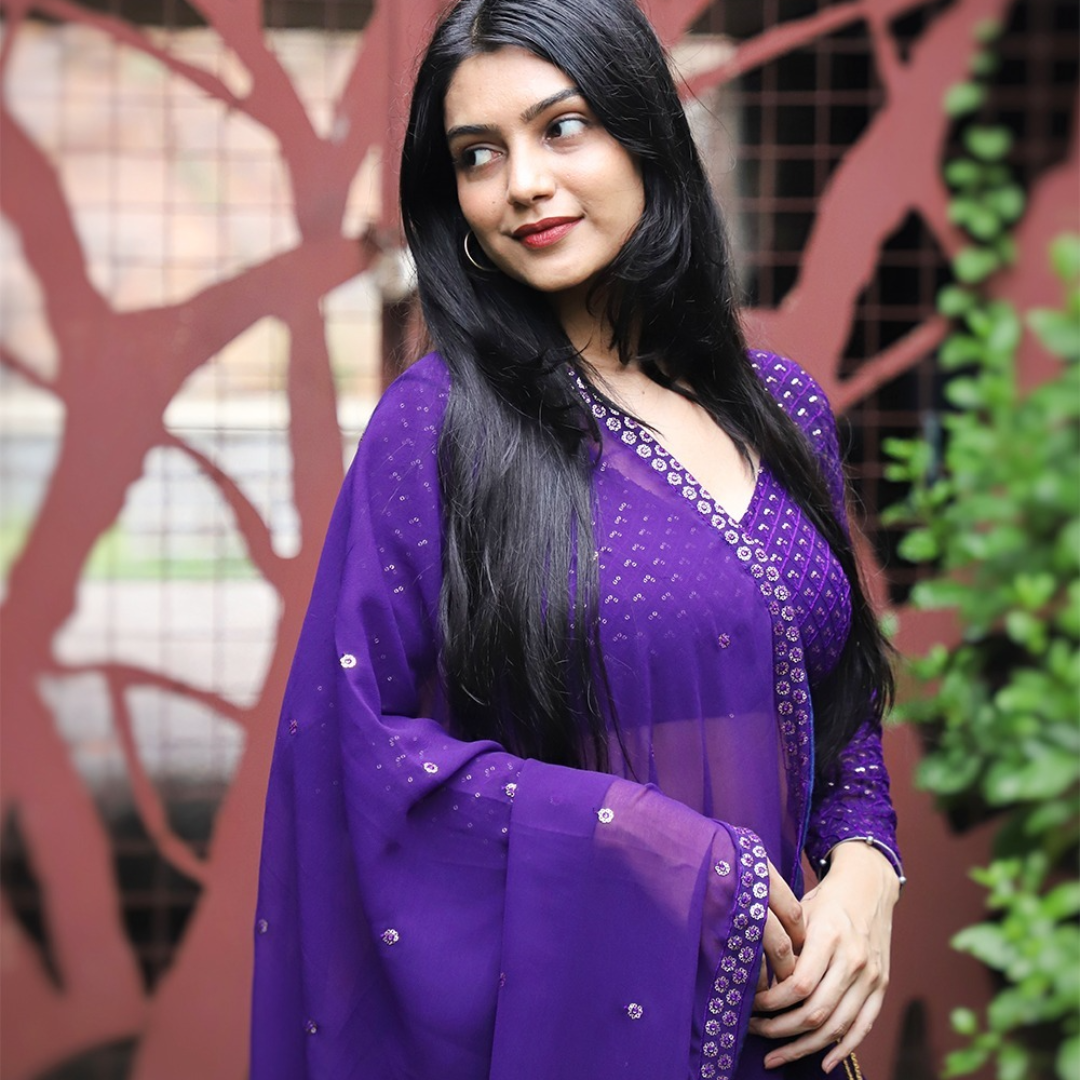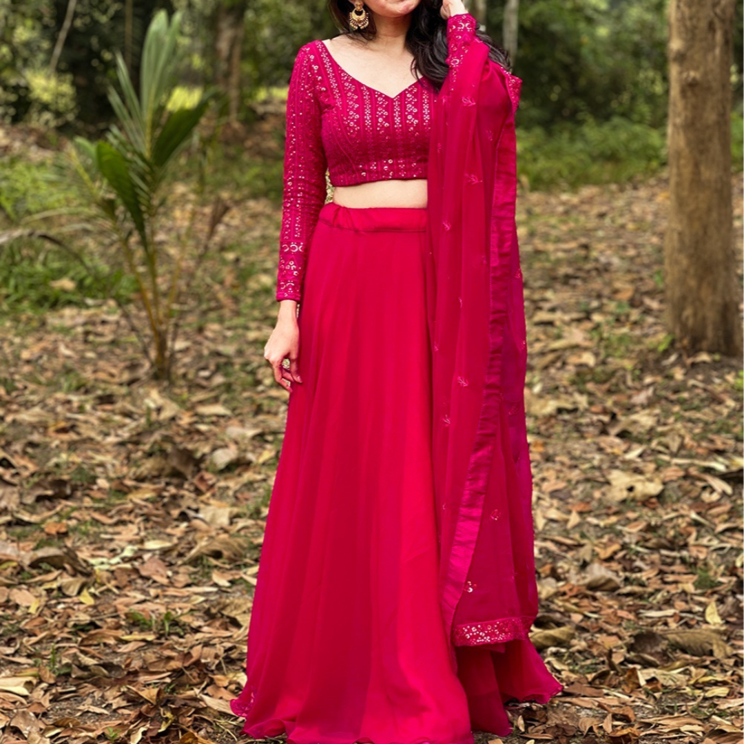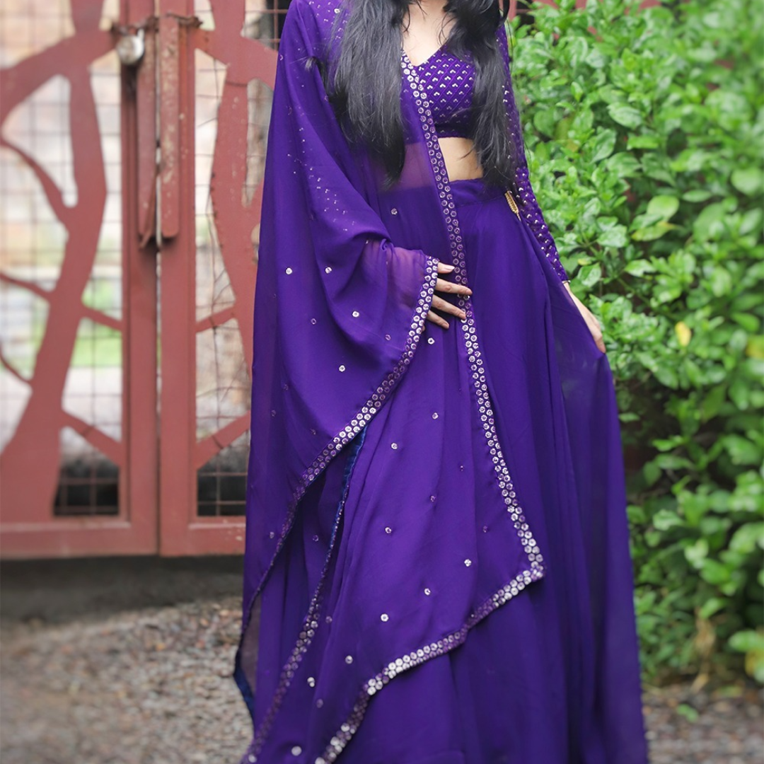 Wondering what to wear this Wedding season!✨We’ve got deals for you. Here is a carefully created and chosen outfit designed to ‘complete’ your Best Bridesmaid look of Dark royal pink and purple Georgette lehenga outfits that will give you all the right vibes at wedding season.🥰.
