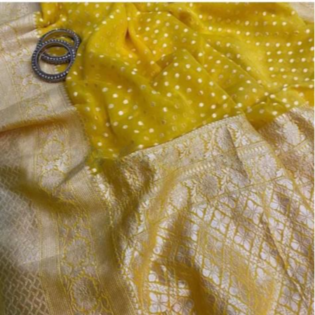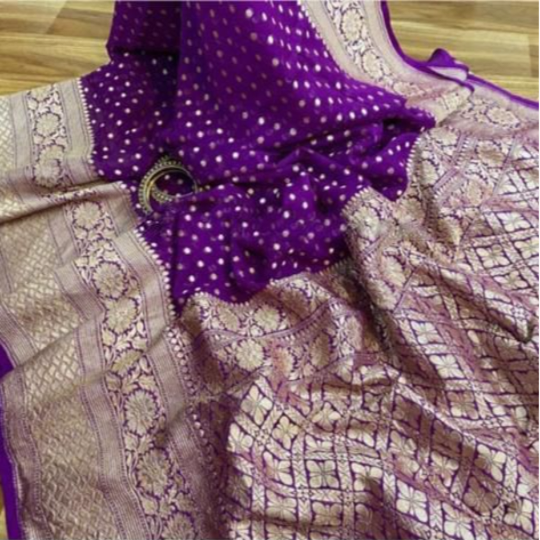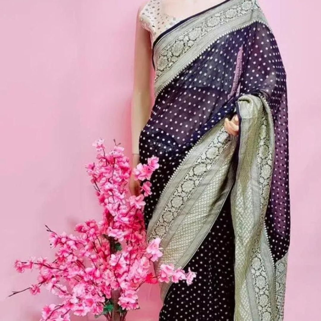 The rich and high-quality soft, flowing Khadi Georgette silk sarees with bindi Weaving body and Zari woven pairs with tassels and woven borders on both sides