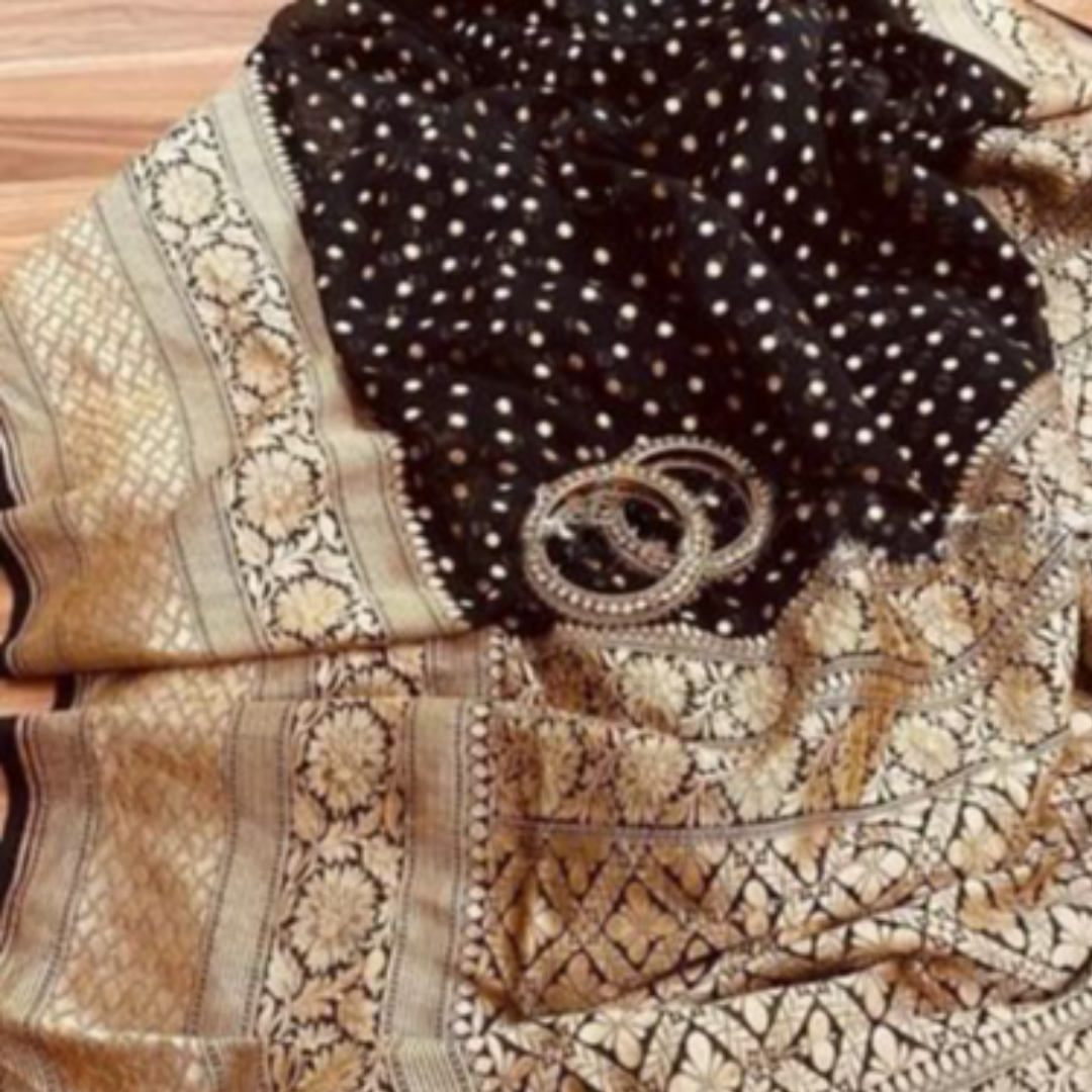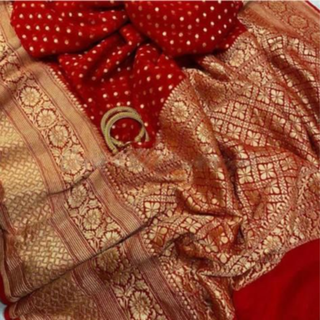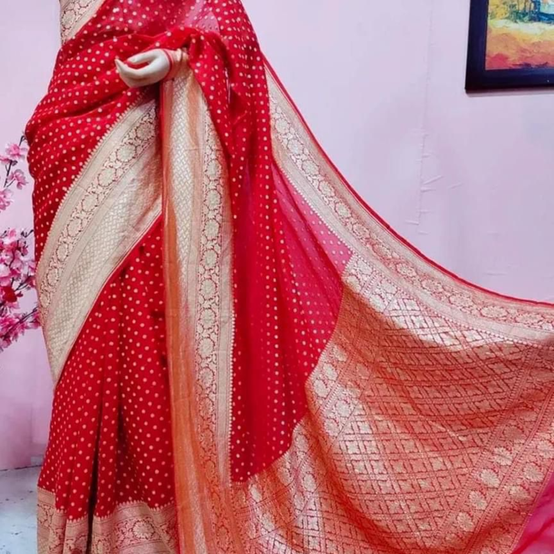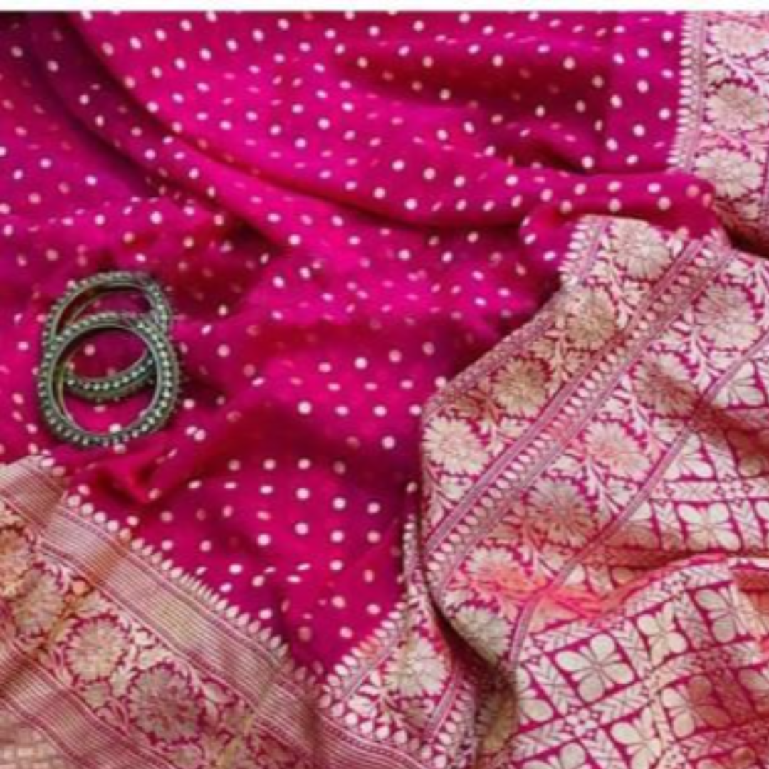 The rich and high-quality soft, flowing Khadi Georgette silk sarees with bindi Weaving body and Zari woven pairs with tassels and woven borders on both sides