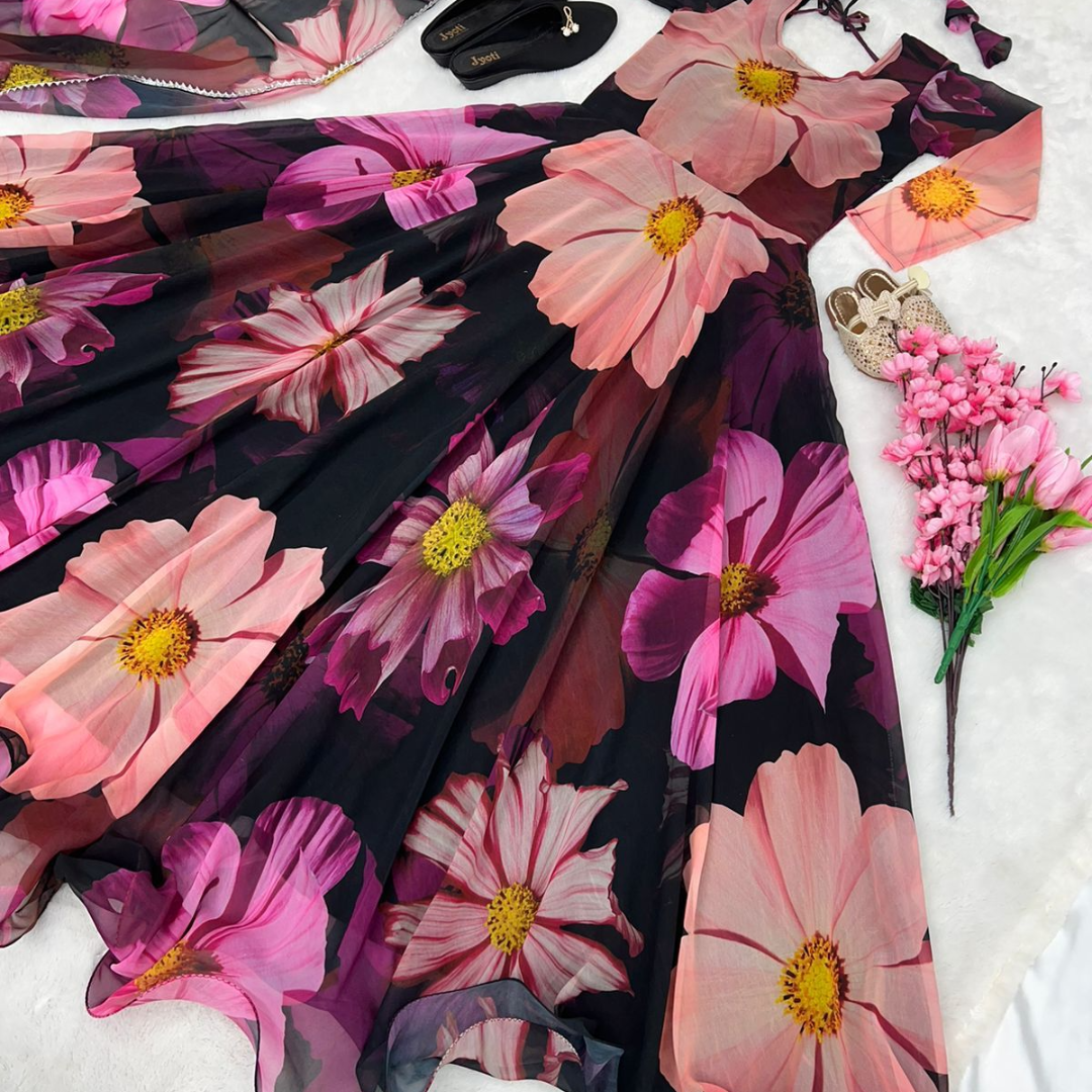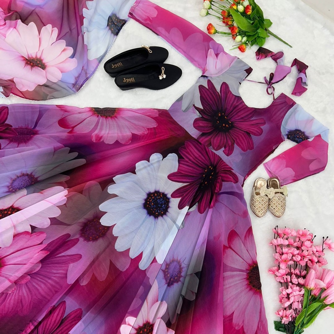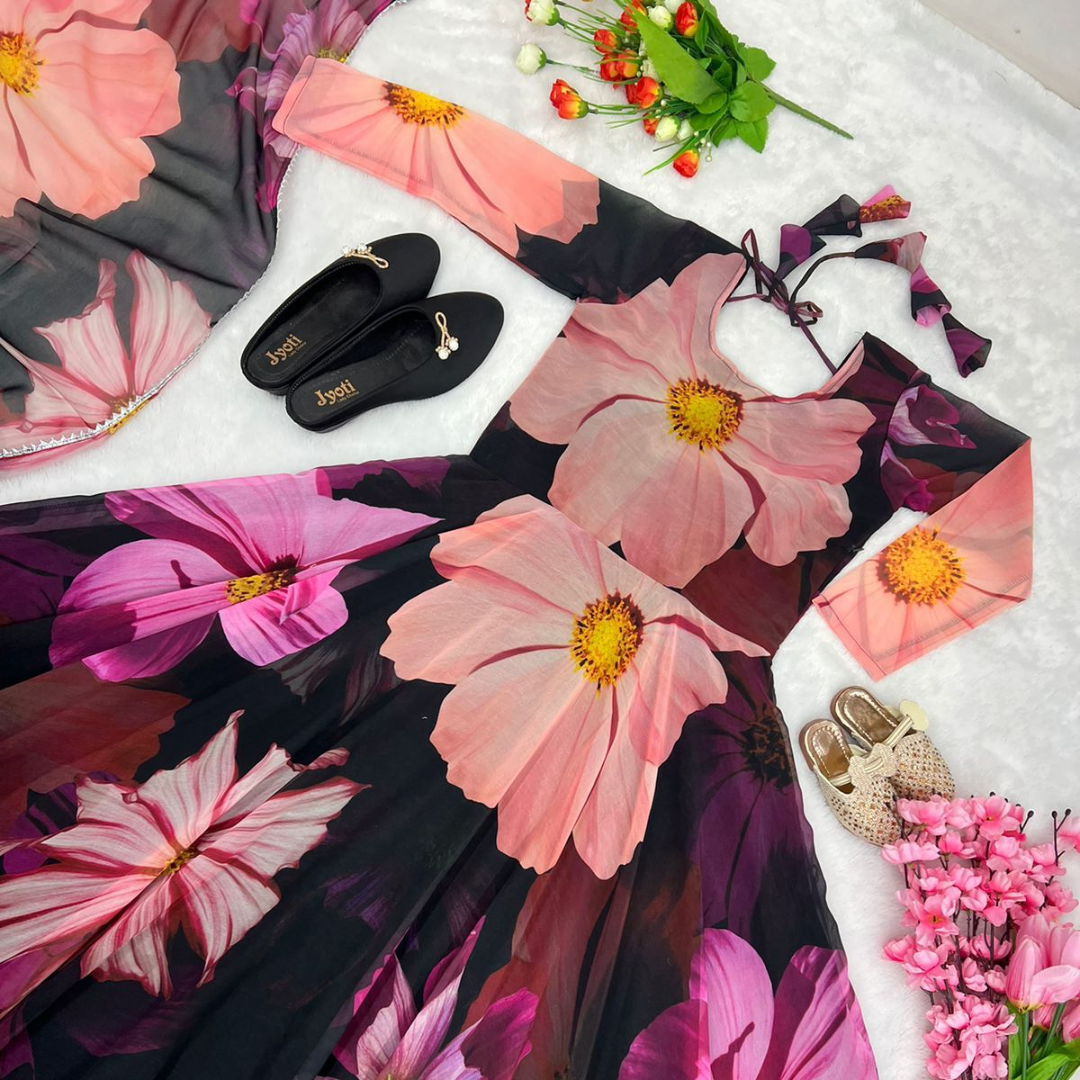 👚Gown Fabric:Heavy Faux Georgette With Beautiful Flower 🌺Digital Print With Attached Pad and Side zipper With Full Sleeve and Latkan Dori With Fully 6 Arka Flair