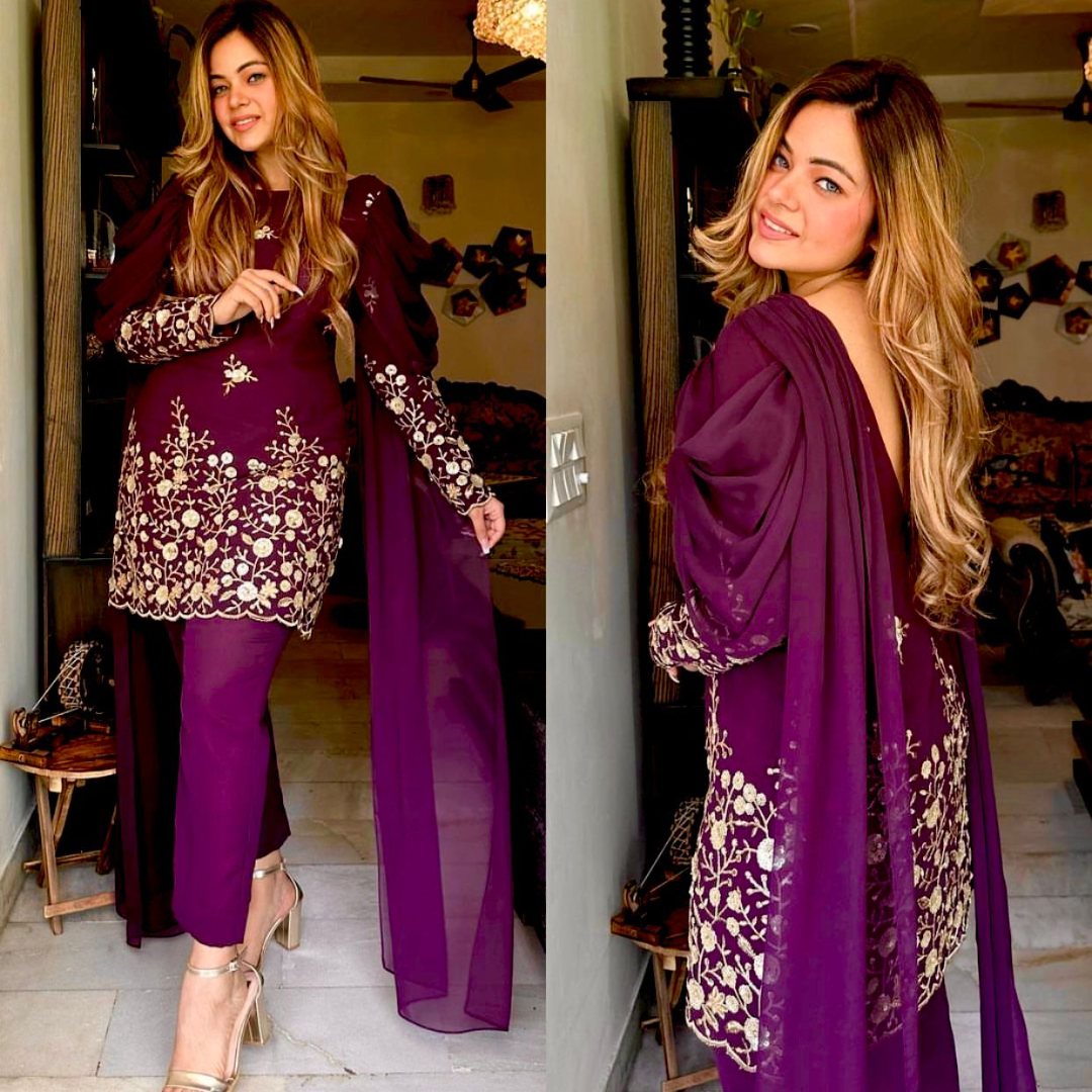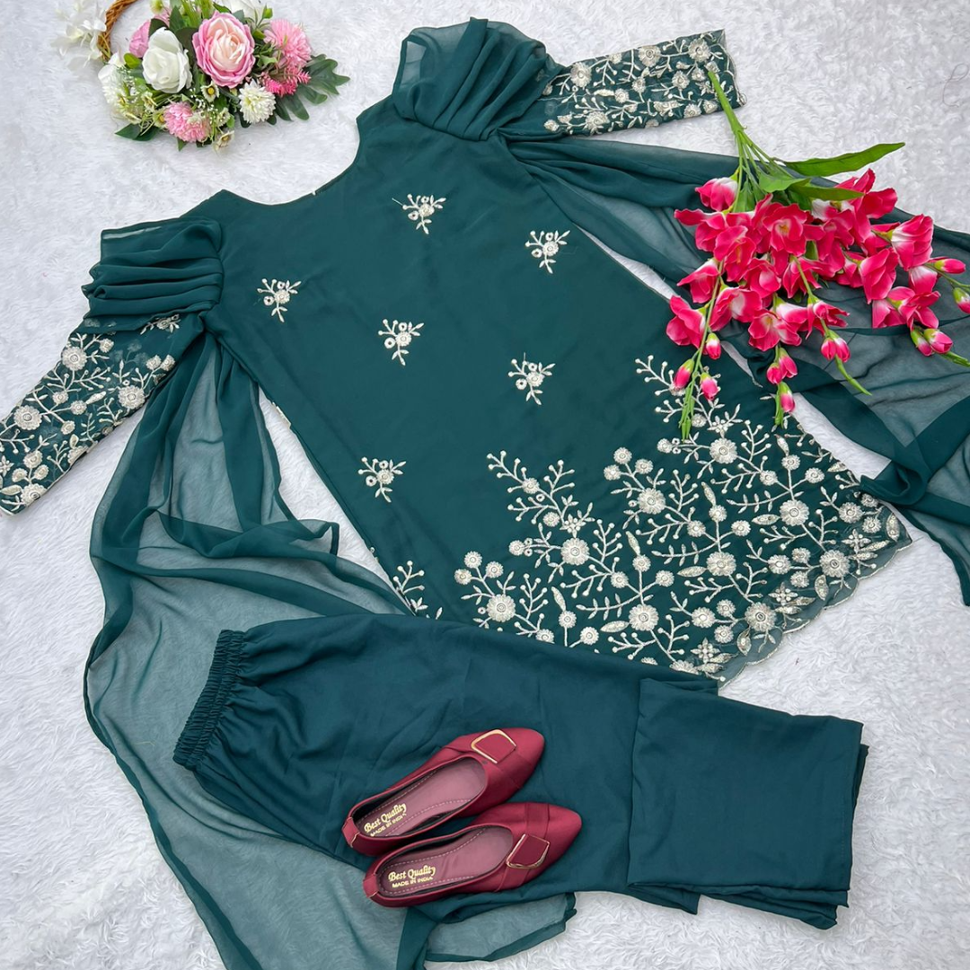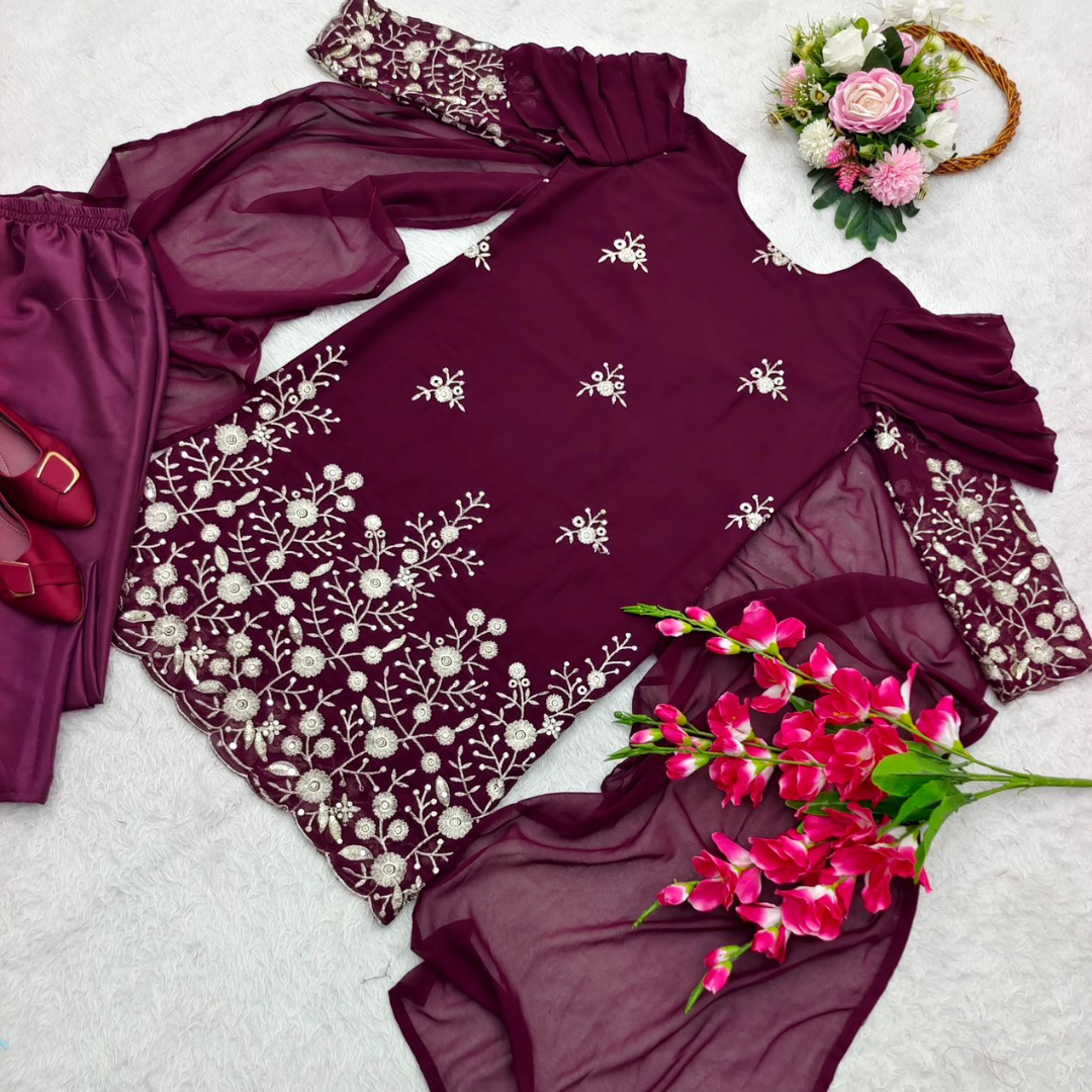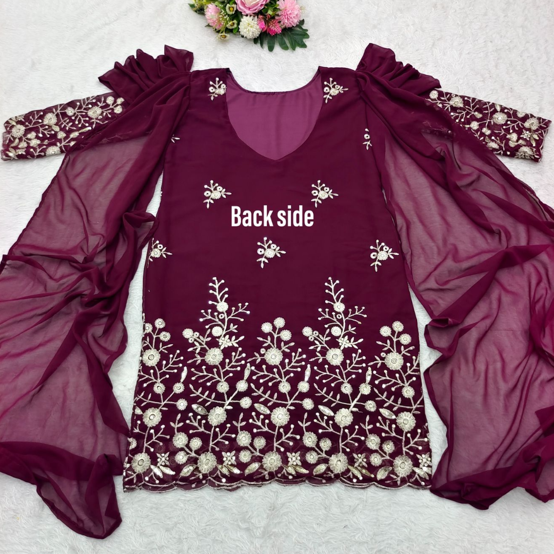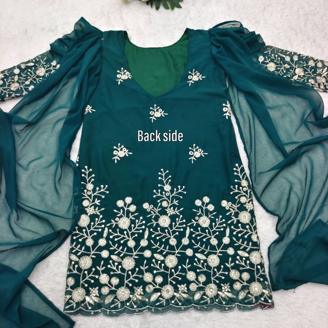 ๐Top Fabric * : Fox Georgette With 5mm Siqwans Embroidery Work With *Fancy Style Sleeves With Attached Duptta