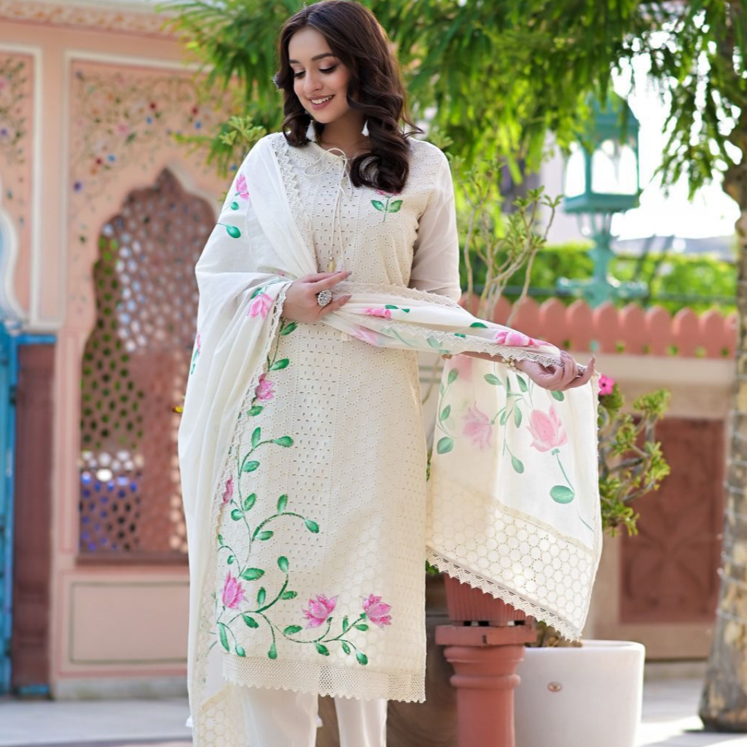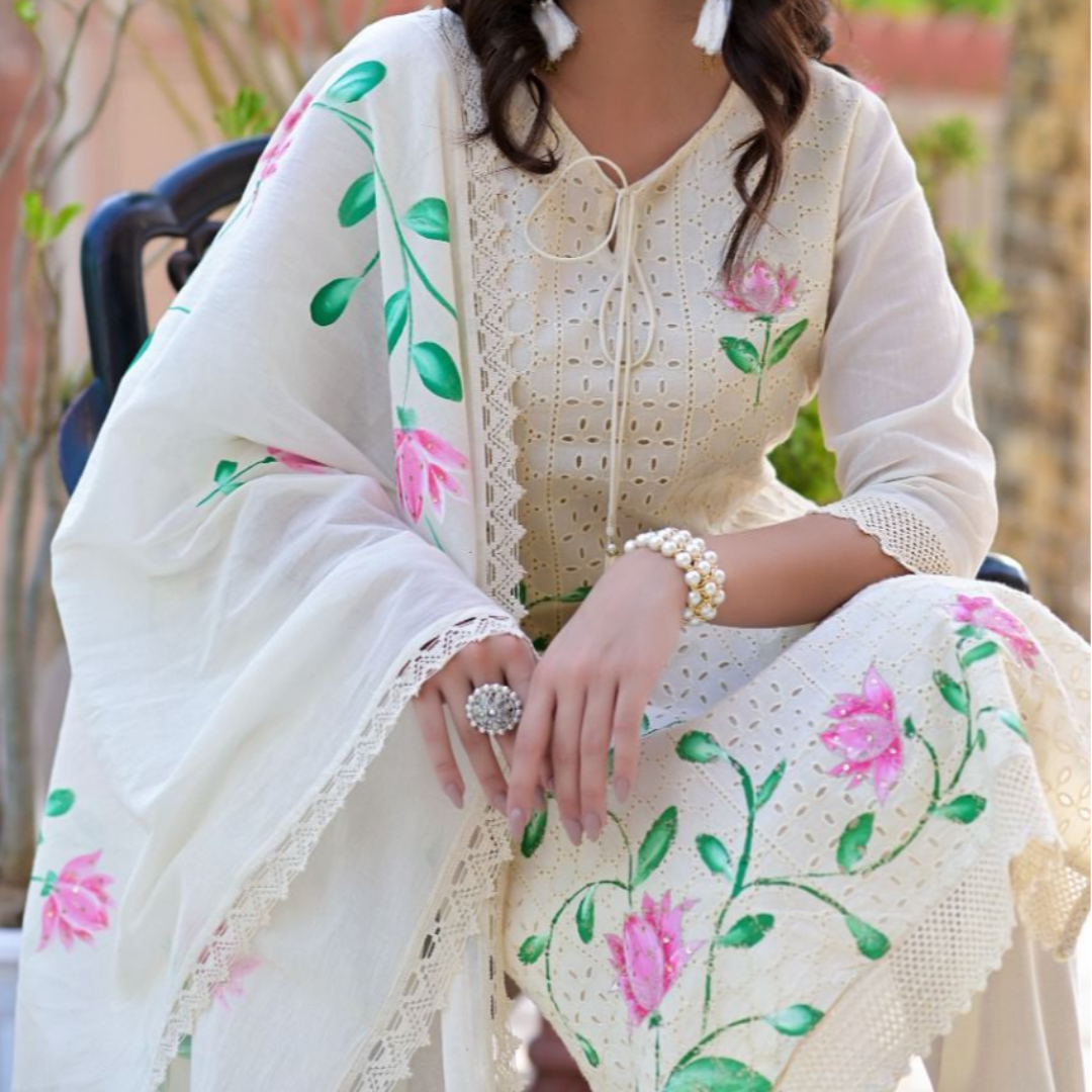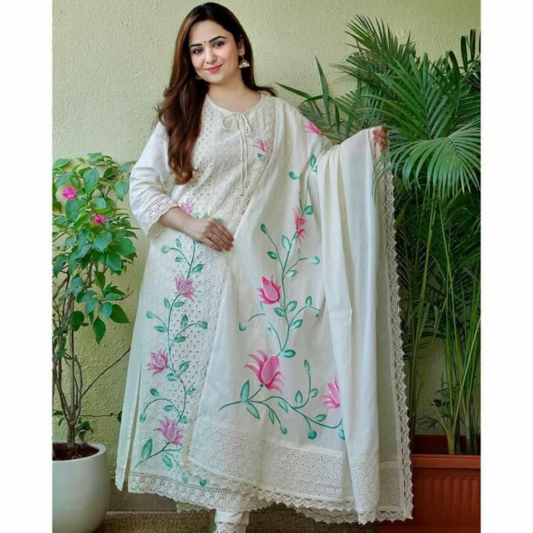 Heavy premium chicken shifli cotton fabric Kurti with hand printed kurti and Pant and mulmul Dupatta -In very fine Quality Cotton