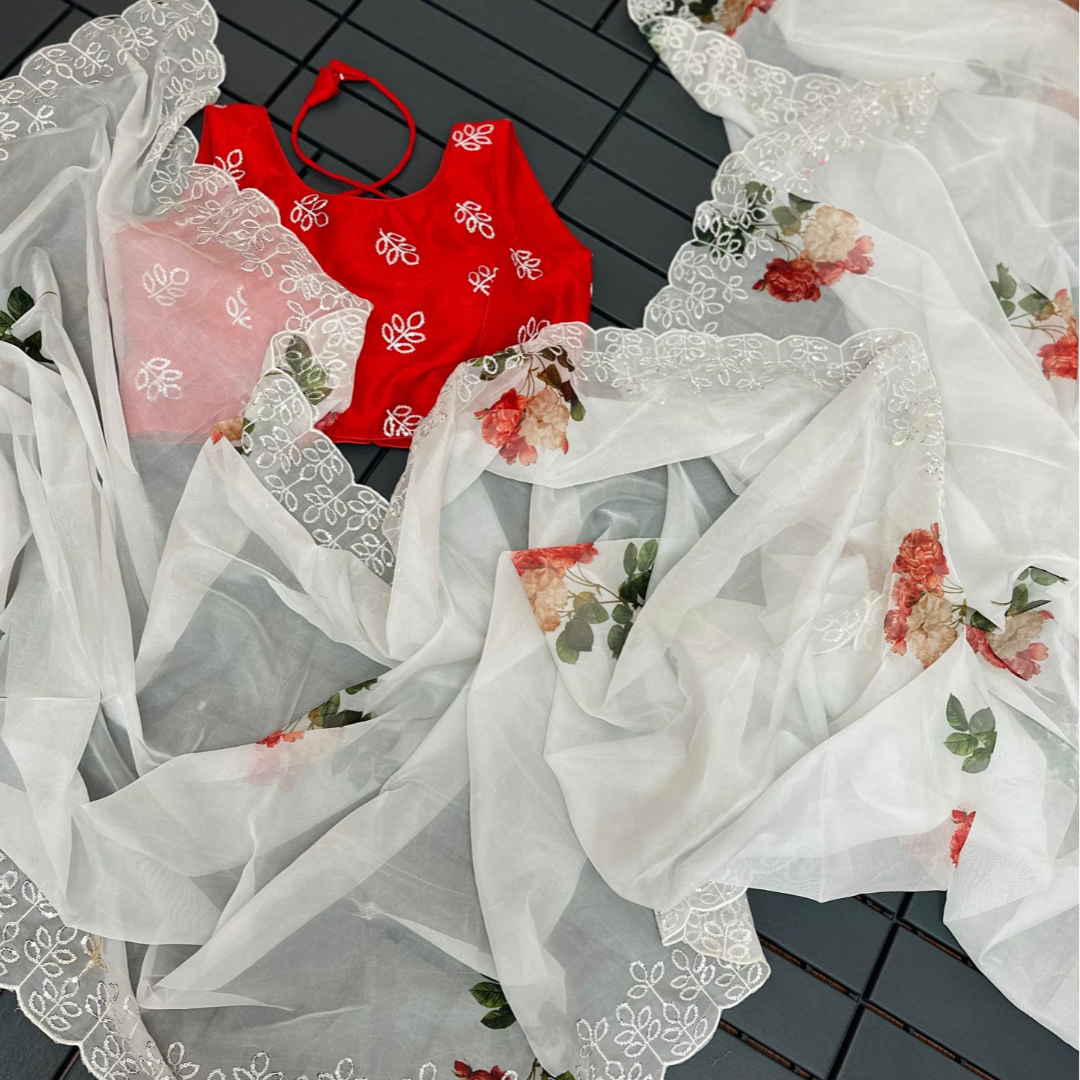 We get you what you look for heavy floral concept floral georgette saree with an acro border all over saree with small leaf cut work sequins