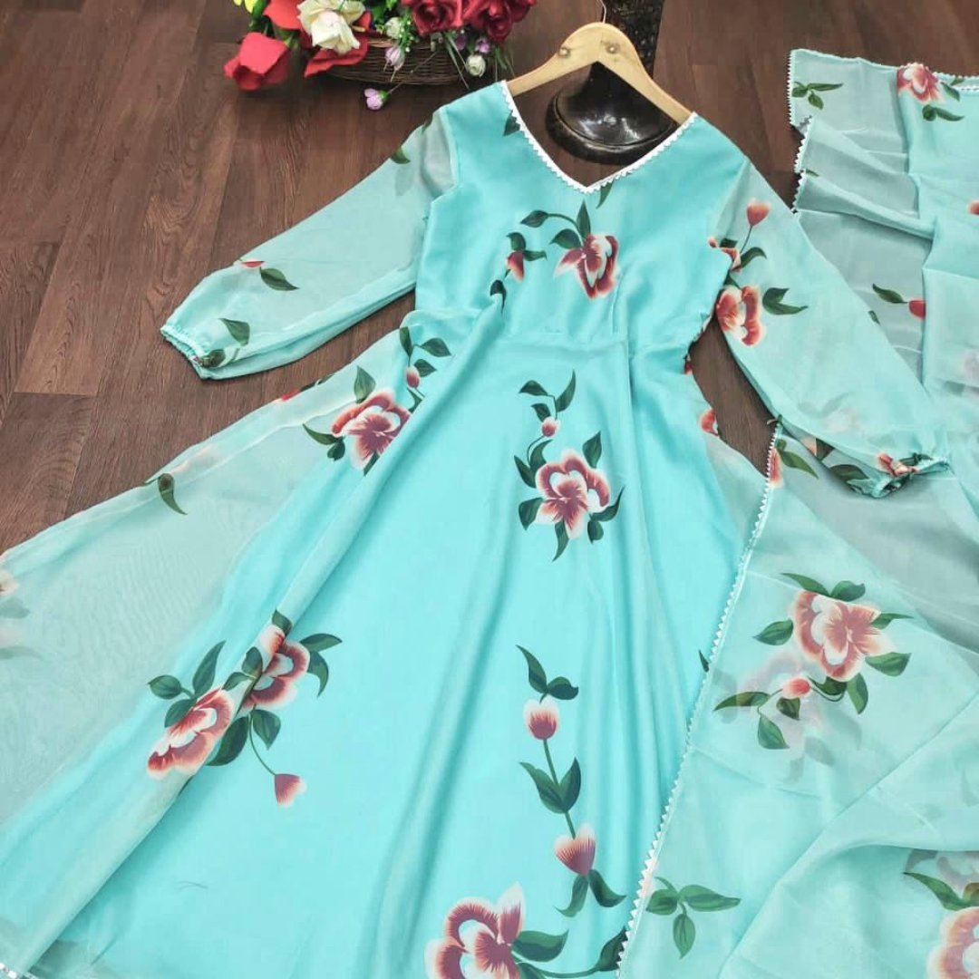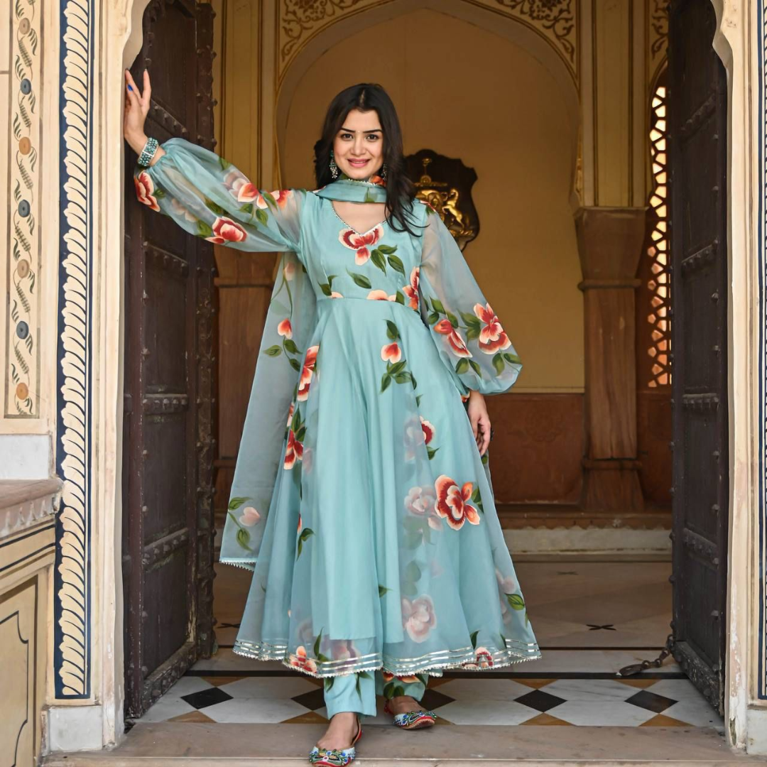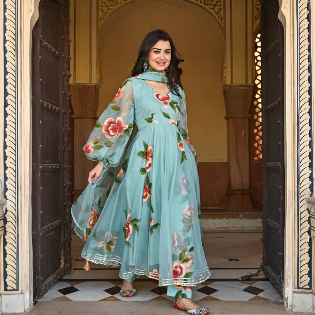 Celebrate this festival of joy in the best ethnics here presenting you a beautiful organza suit for the upcoming festival season with beautiful Gota Detailing at Neck Line And Flare Ooh Those Balloon Sleeves to add the extra charm 😍😍