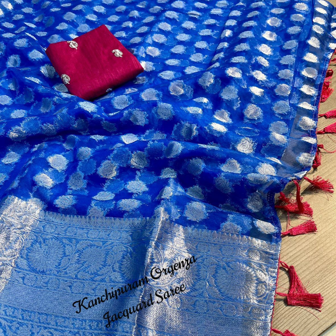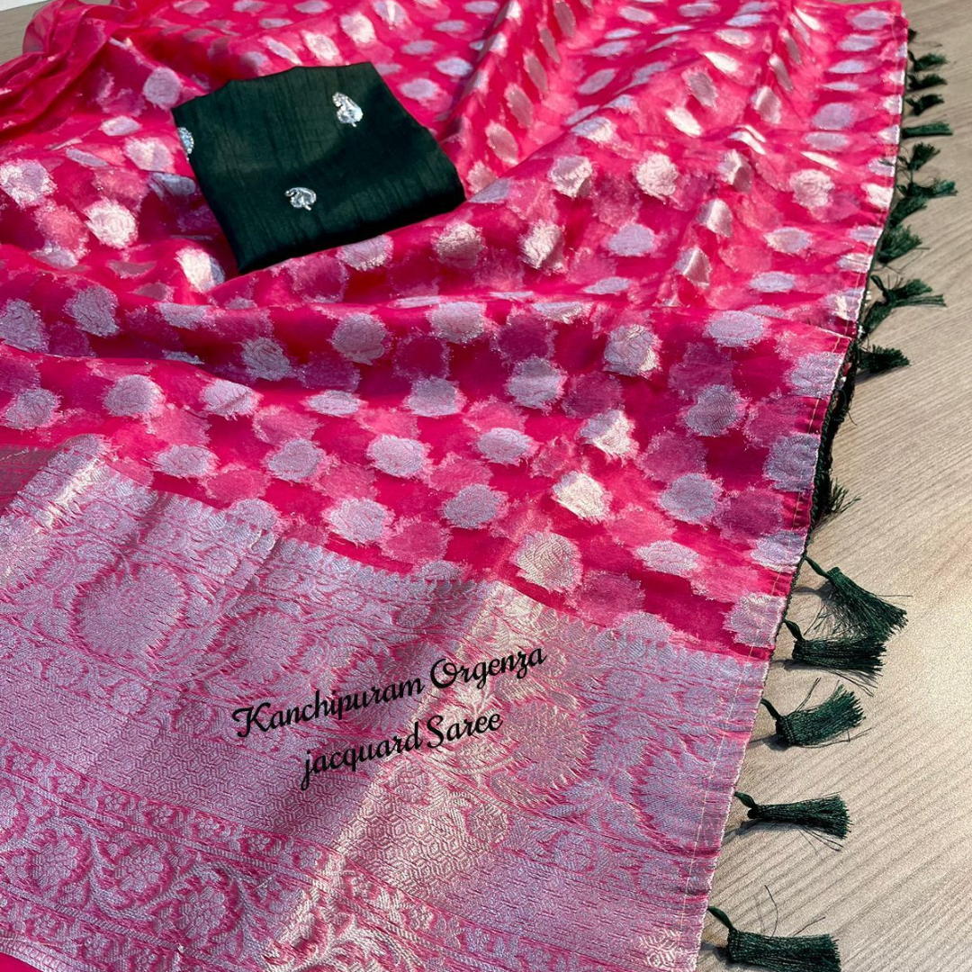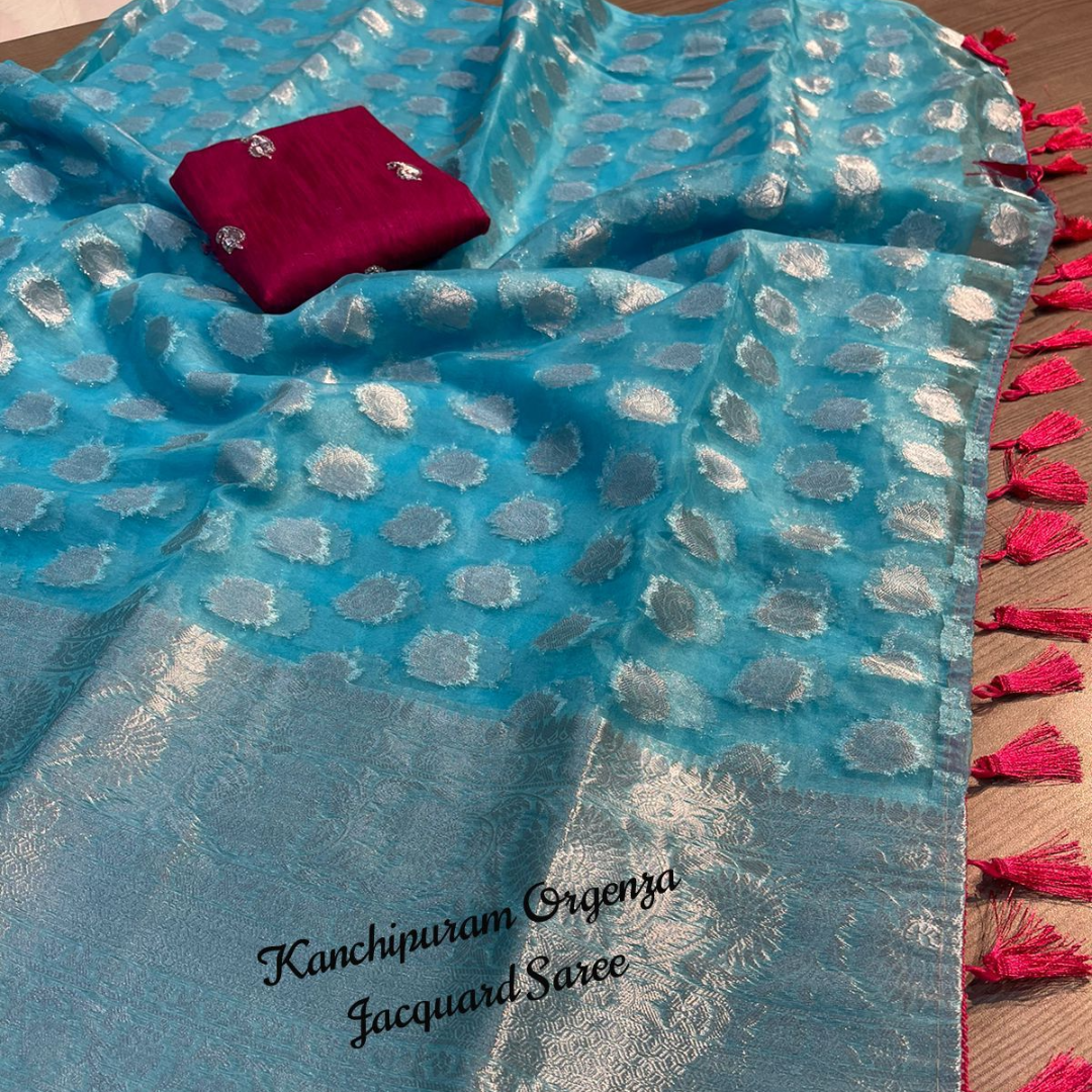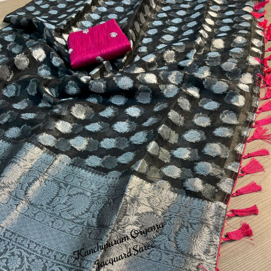 Kanchipuram Organza Jacquard Saree With Raw Silk Sequence Blouse & Tassel