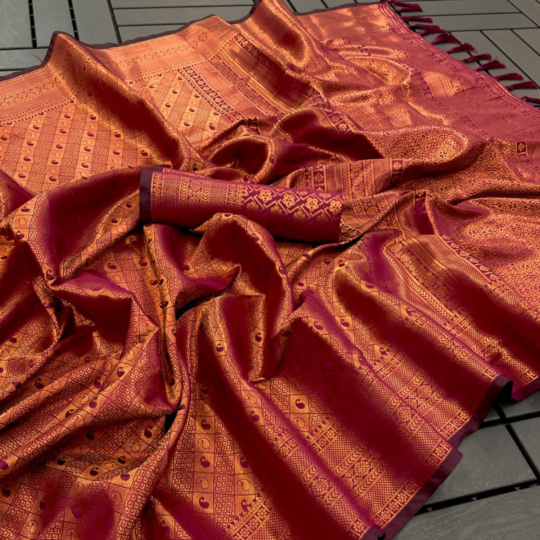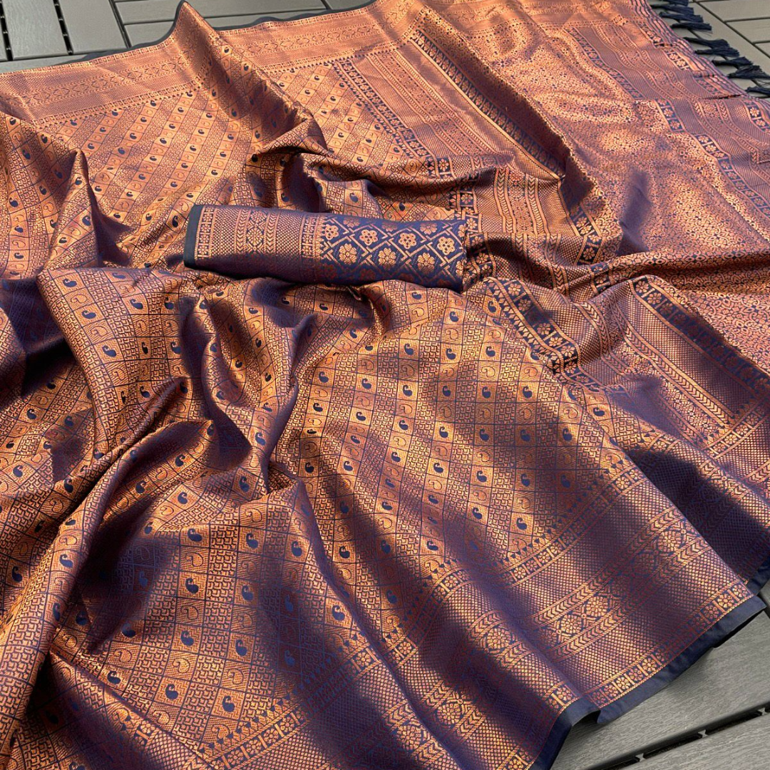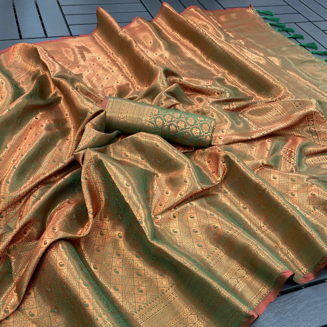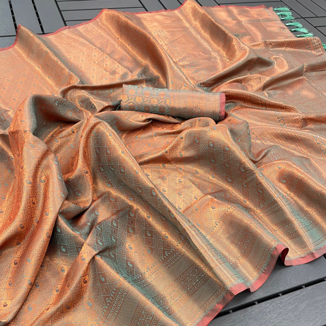 The stunning copper Zari Woven Kanjivaram Saree is one of a kind because of its lustrous appeal.