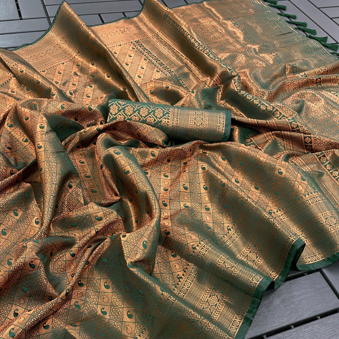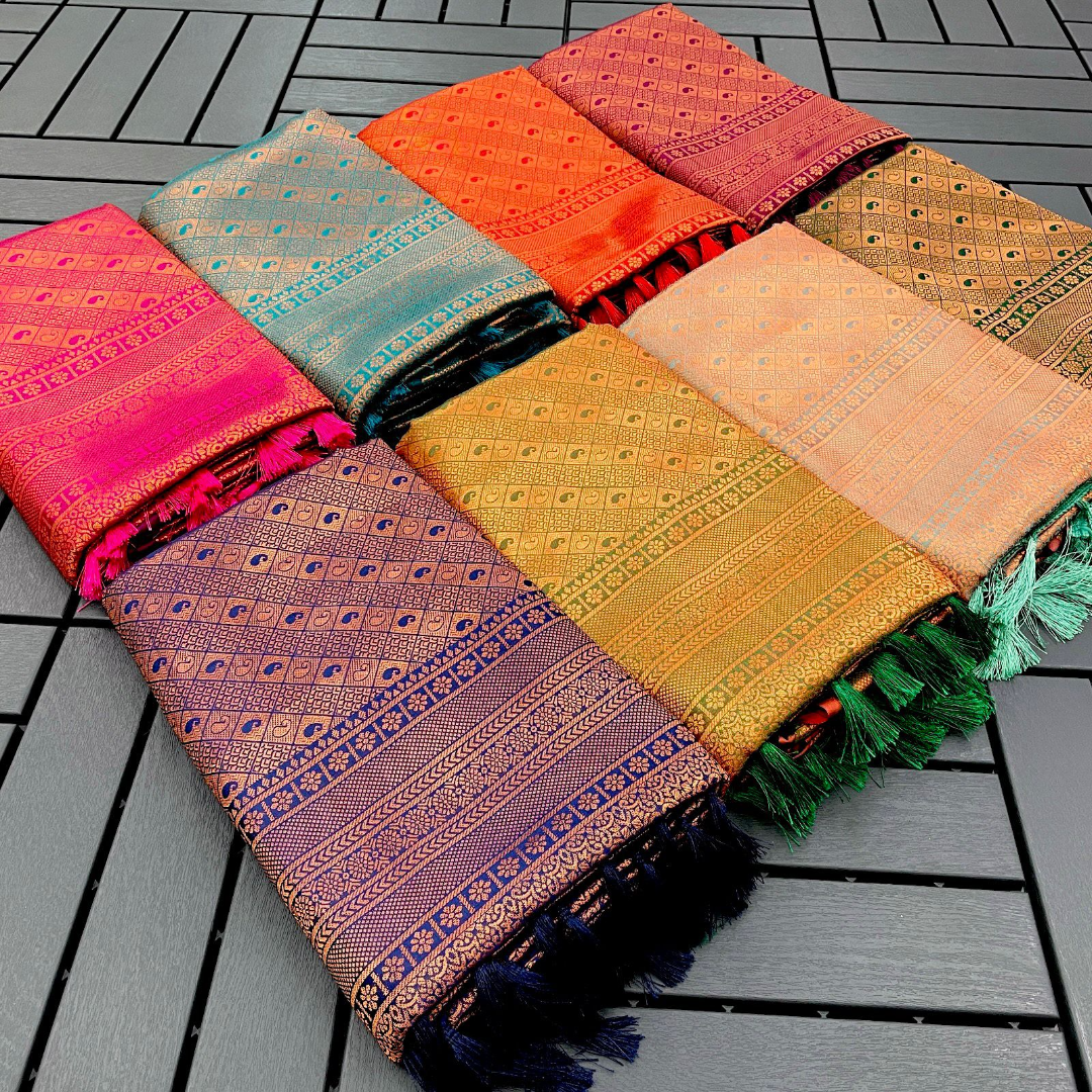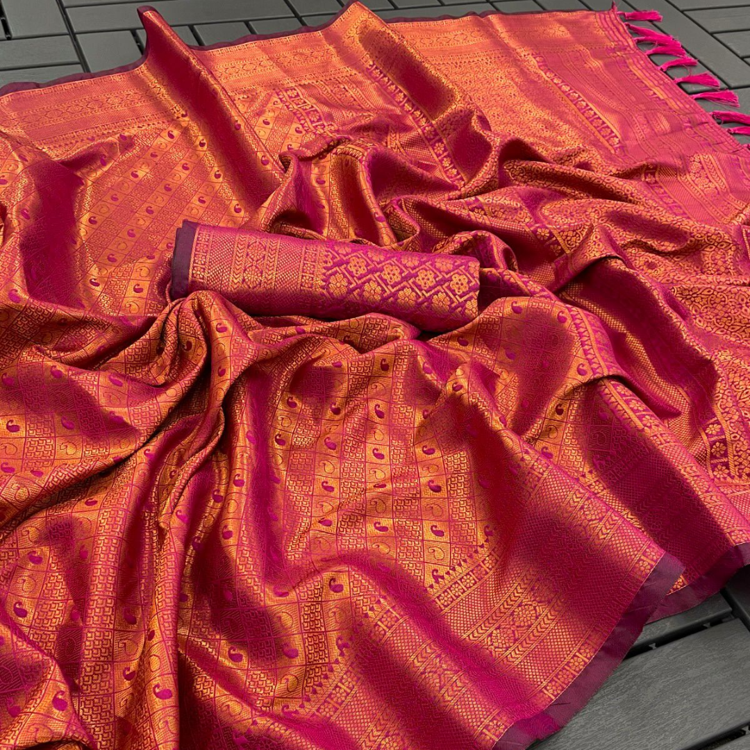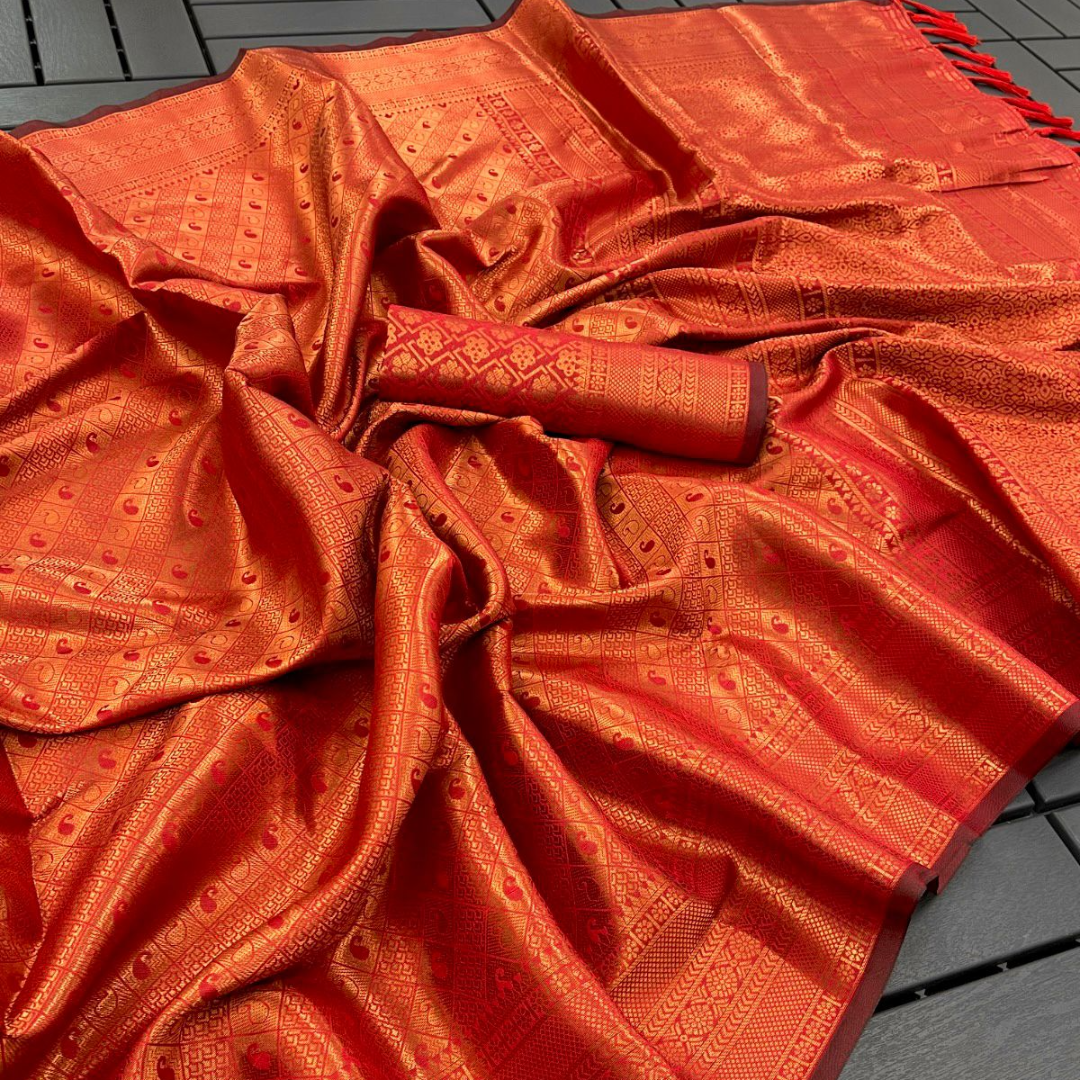 The stunning copper Zari Woven Kanjivaram Saree is one of a kind because of its lustrous appeal.