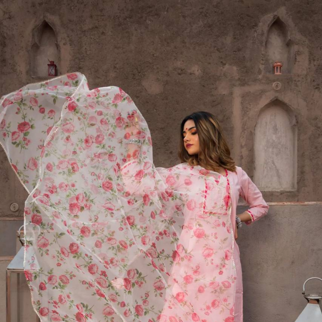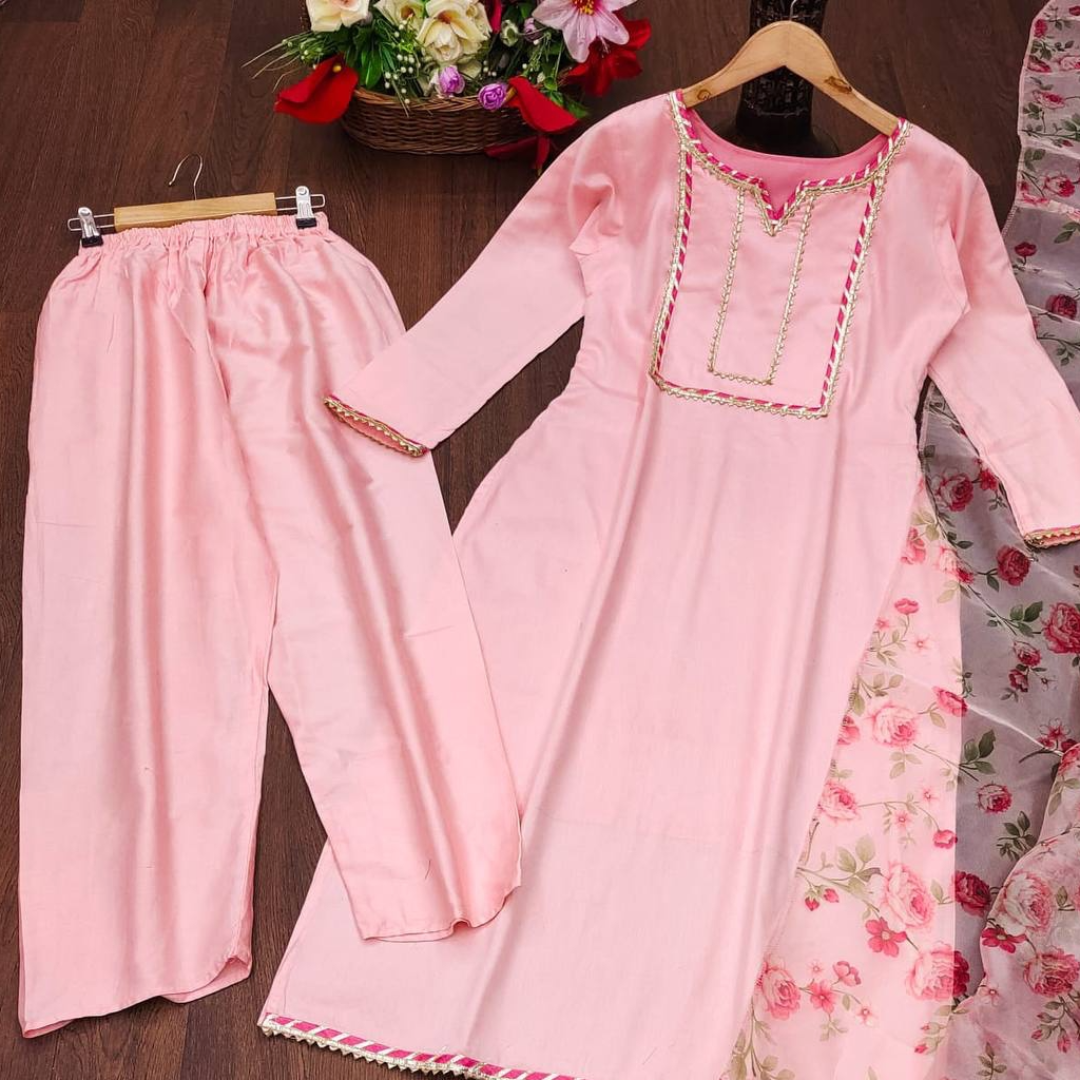 Let's celebrate the seasons of wedding with some extra glam and create extra charm with these beauties. Look gorgeous at the upcoming wedding with our beautiful A line kurti plazzo set with Organza dupptta โฅ๏ธ๐ธ