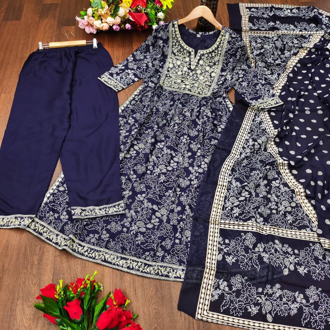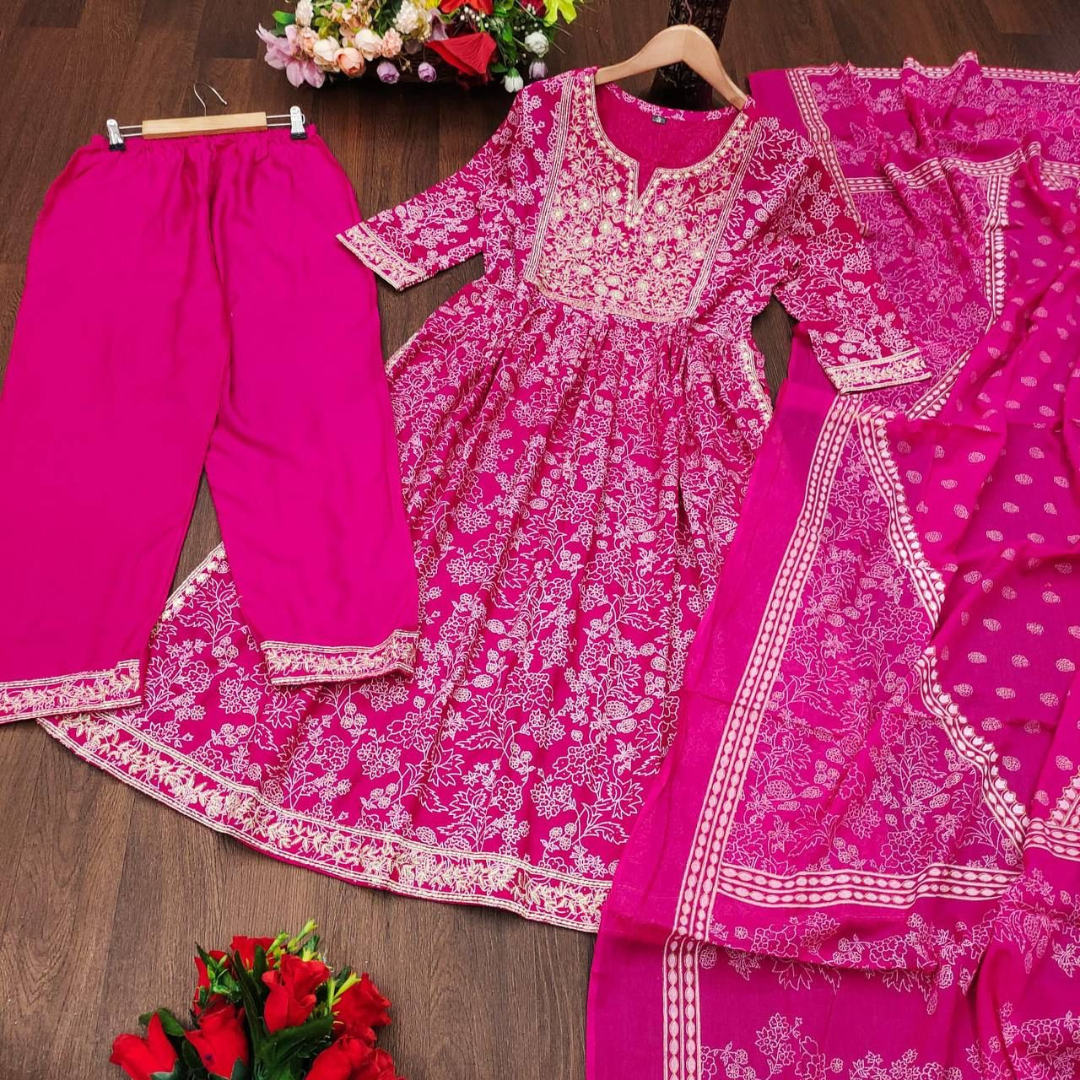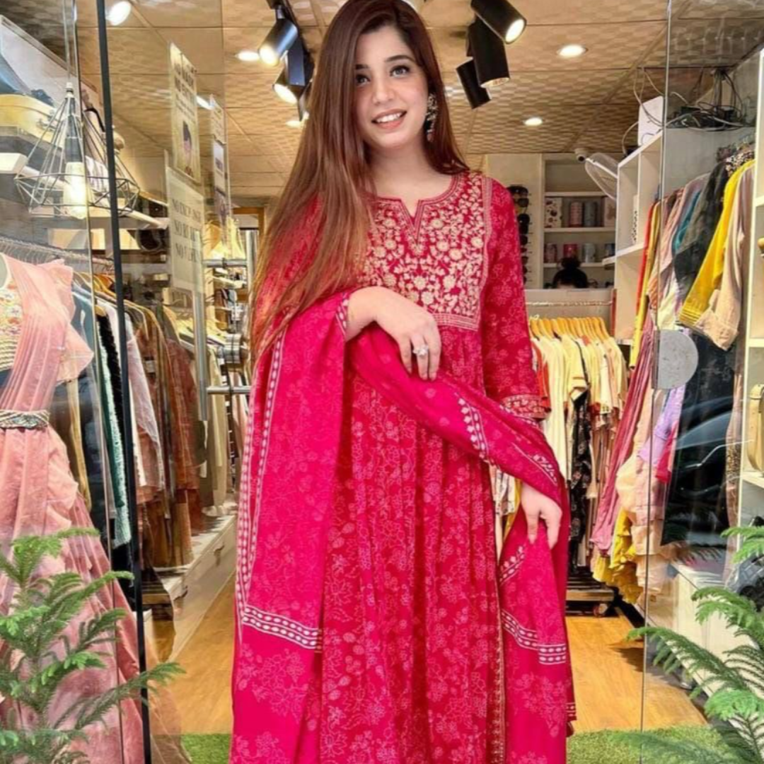 Premium quality Rayon Anarkali kurta with heavy work neckline and gota details all over, rayon pant and matching malmal dupatta