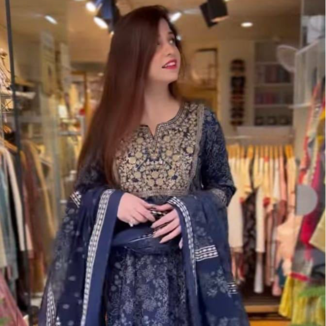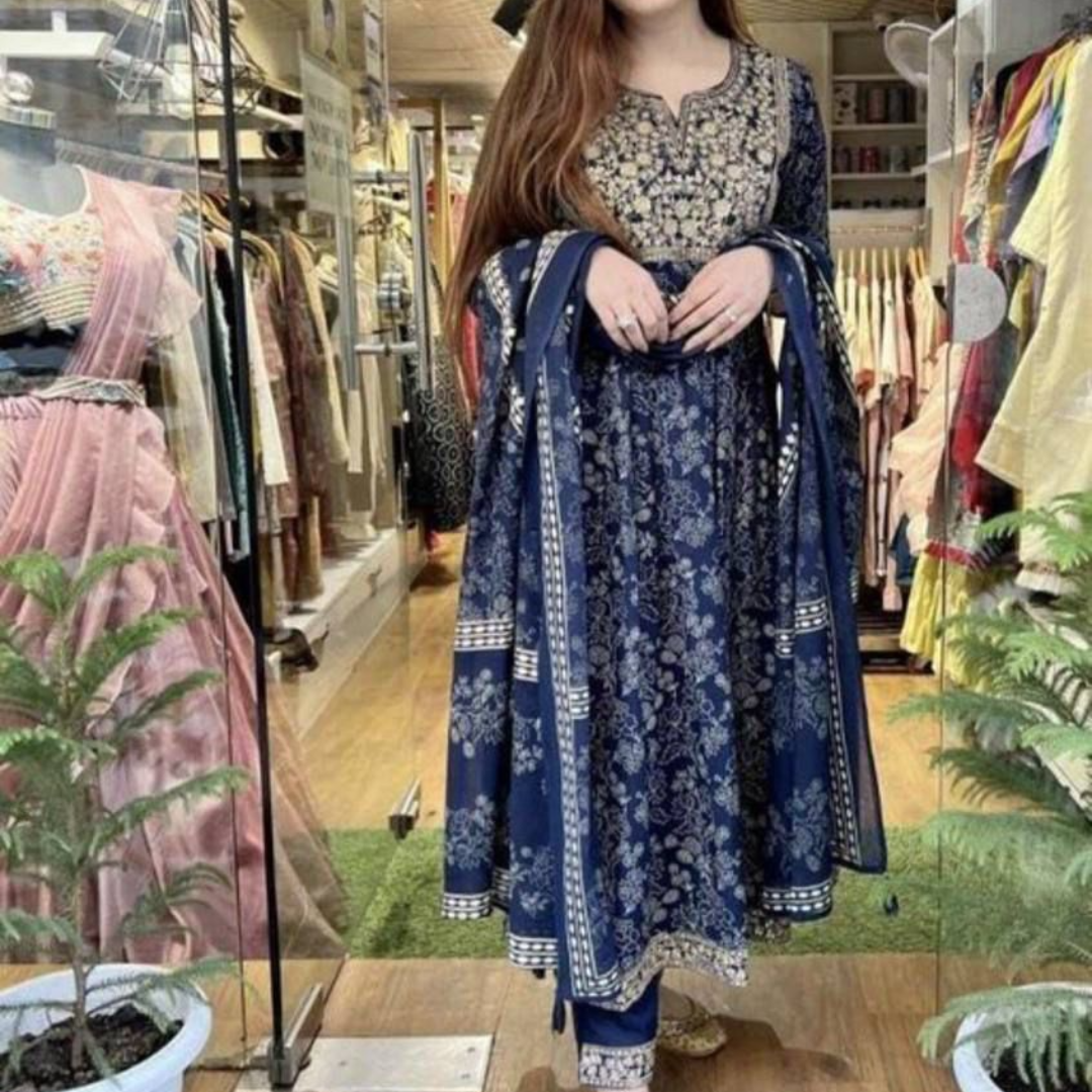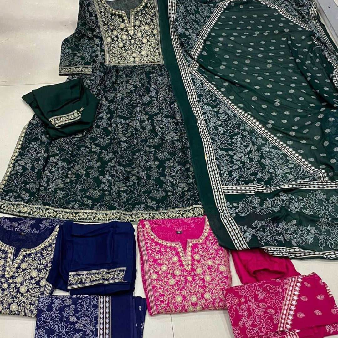 Premium quality Rayon Anarkali kurta with heavy work neckline and gota details all over, rayon pant and matching malmal dupatta