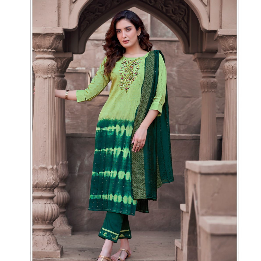TOP: VISCOSE BASE SEQUENCE WORK SHIBORI DYEING WITH EMBROIDERY AND KHATLI WORK WITH MALL COTTON FULL INNER