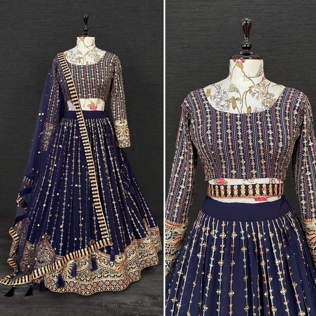 Be a center of the attraction by donning this beautiful navy blue color lehenga in georgette material embellished with sequins and thread embroidery work.