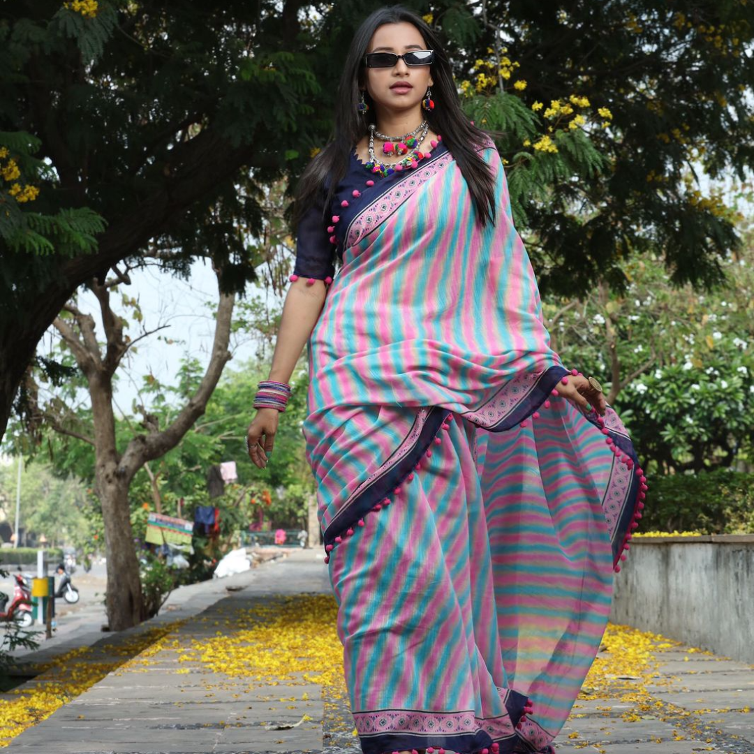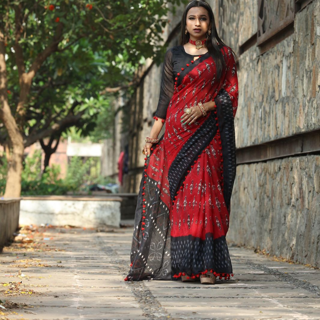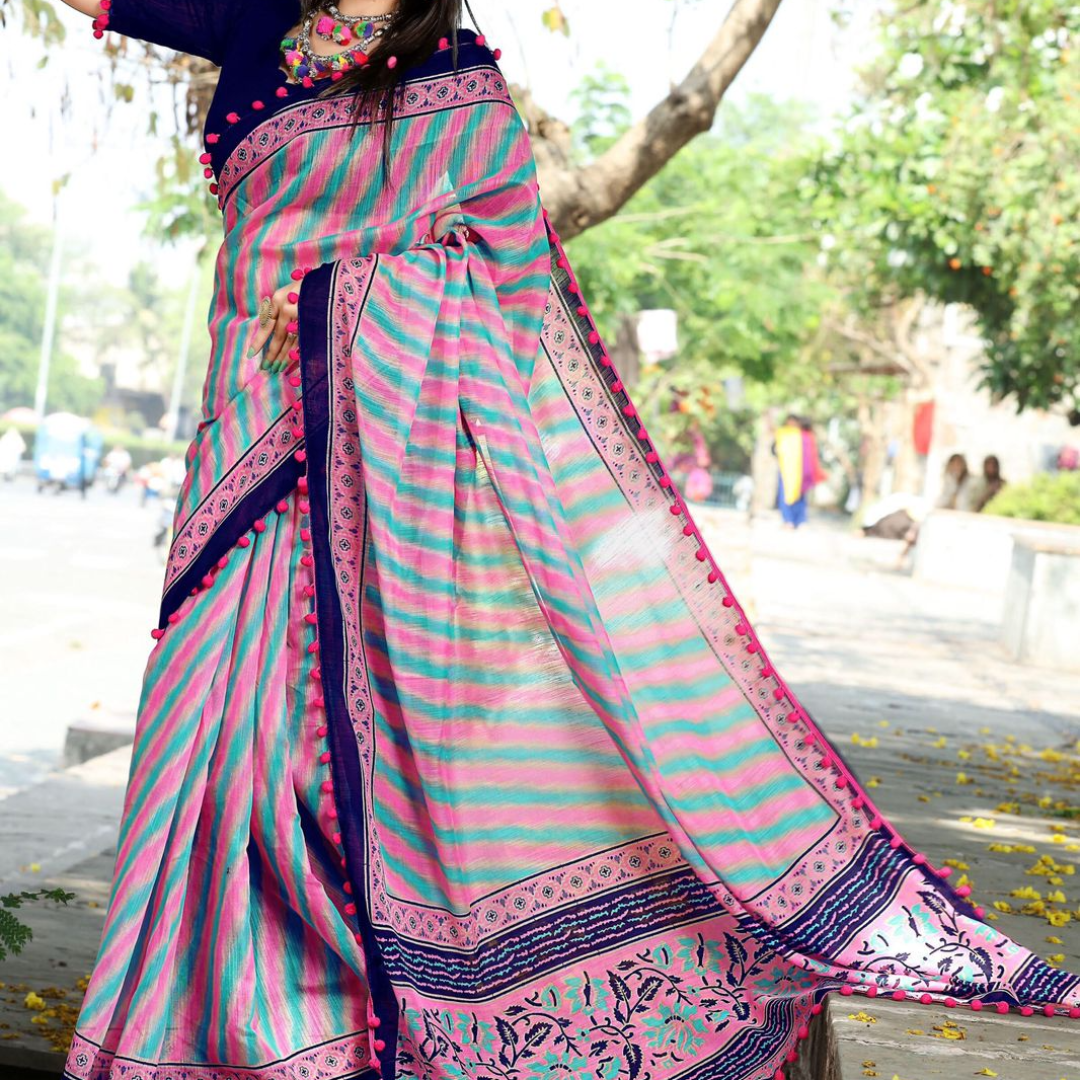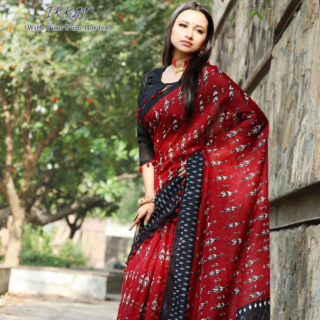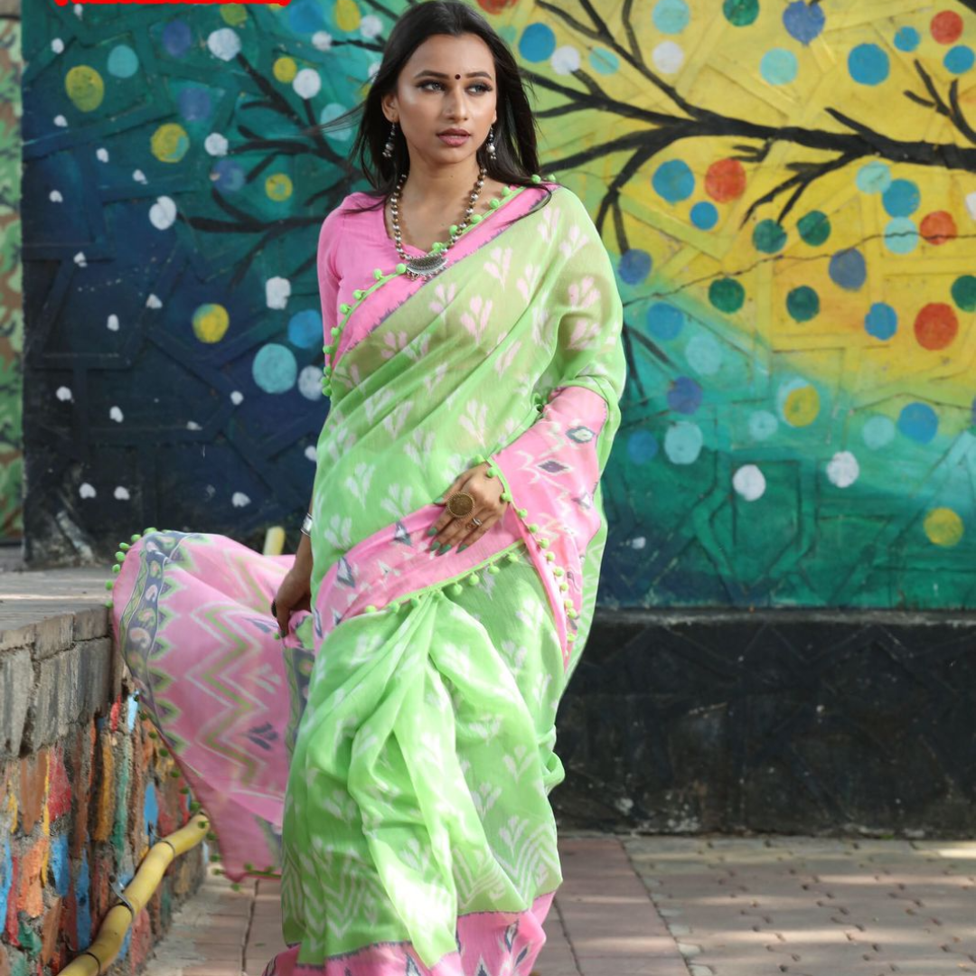 Fabric Details -. mul mul soft Cotton ikkat print with Pom Pom border