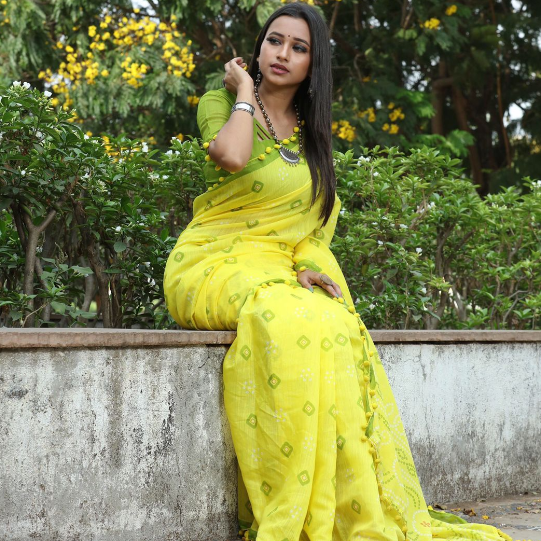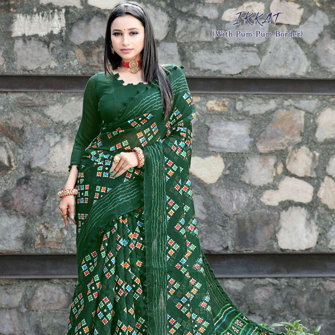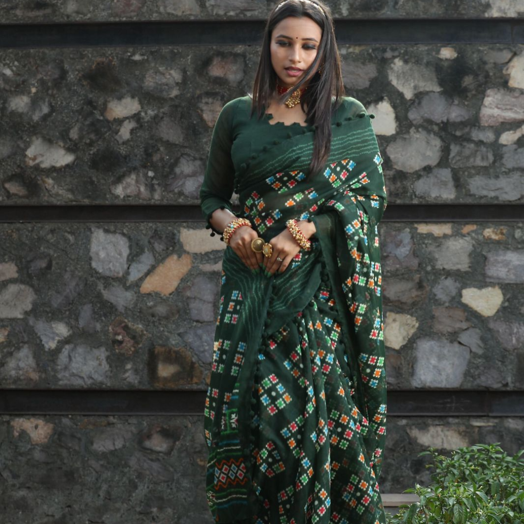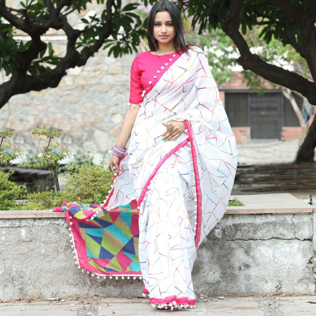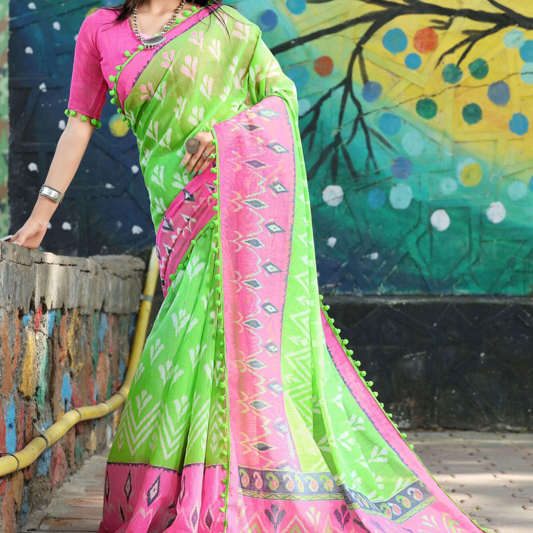 Fabric Details -. mul mul soft Cotton ikkat print with Pom Pom border