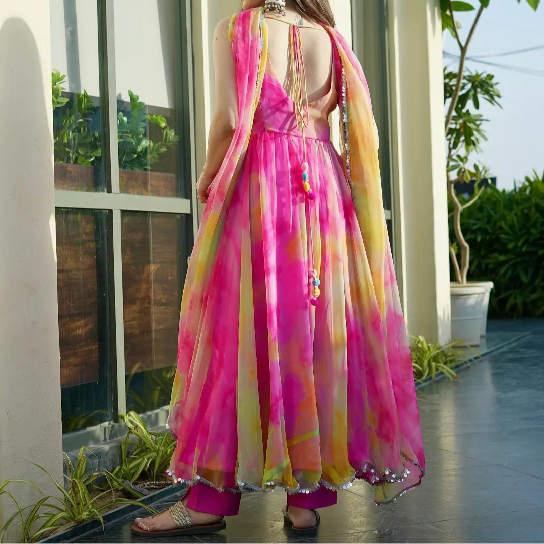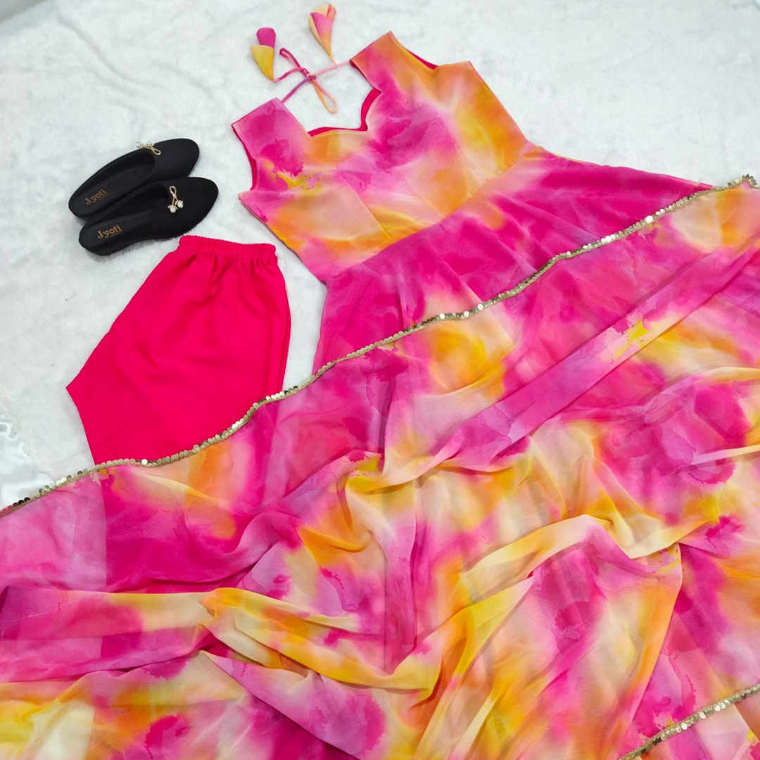 ๐ Gown Fabric * :Faux Georgette With *Digital Print Work With Sleeve Fabric and Fancy Style Latkan Dori and Fully 8 Meter Flair with Attached Pad