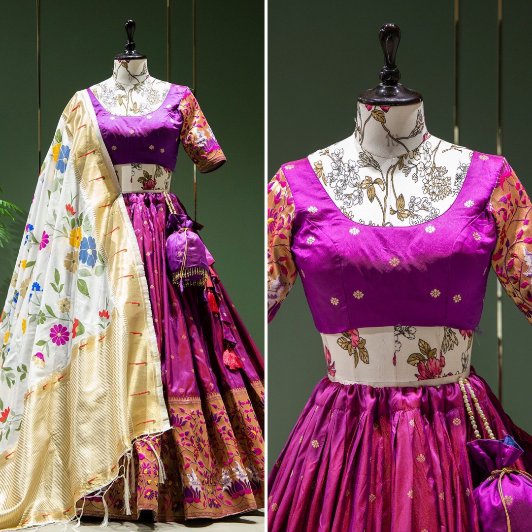 Get traditional touch to your look by adorning this purple and Red color lehenga in jacquard material beautified with all-over weaving work that comes with micro cotton inner and canvas inside.
