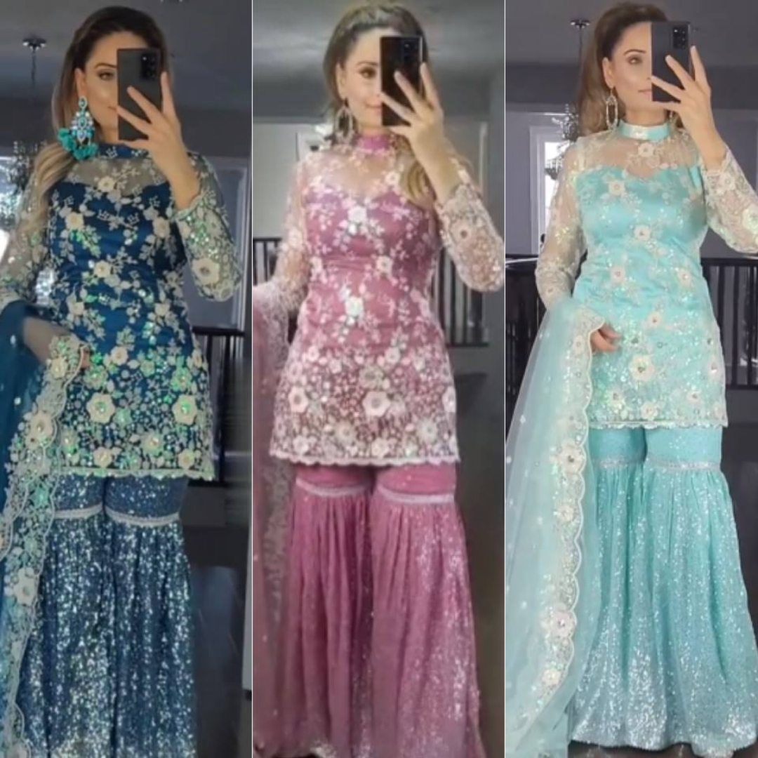 Plazzo Fabrics: Heavy Faux Georgette With 5mm Embroidery Sequence Work With Fully Flair