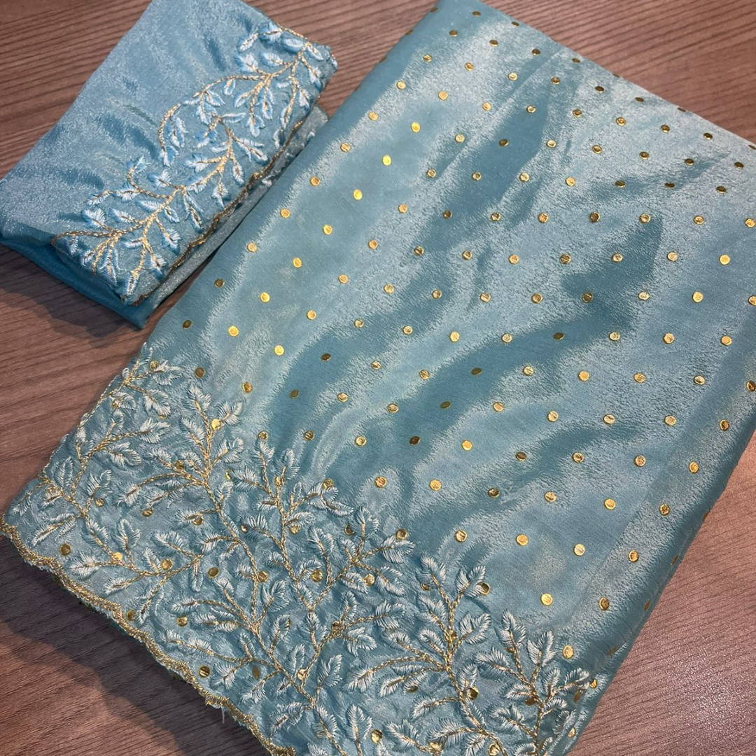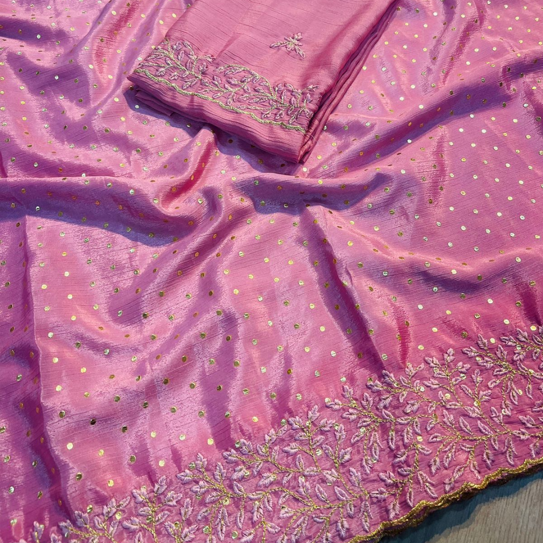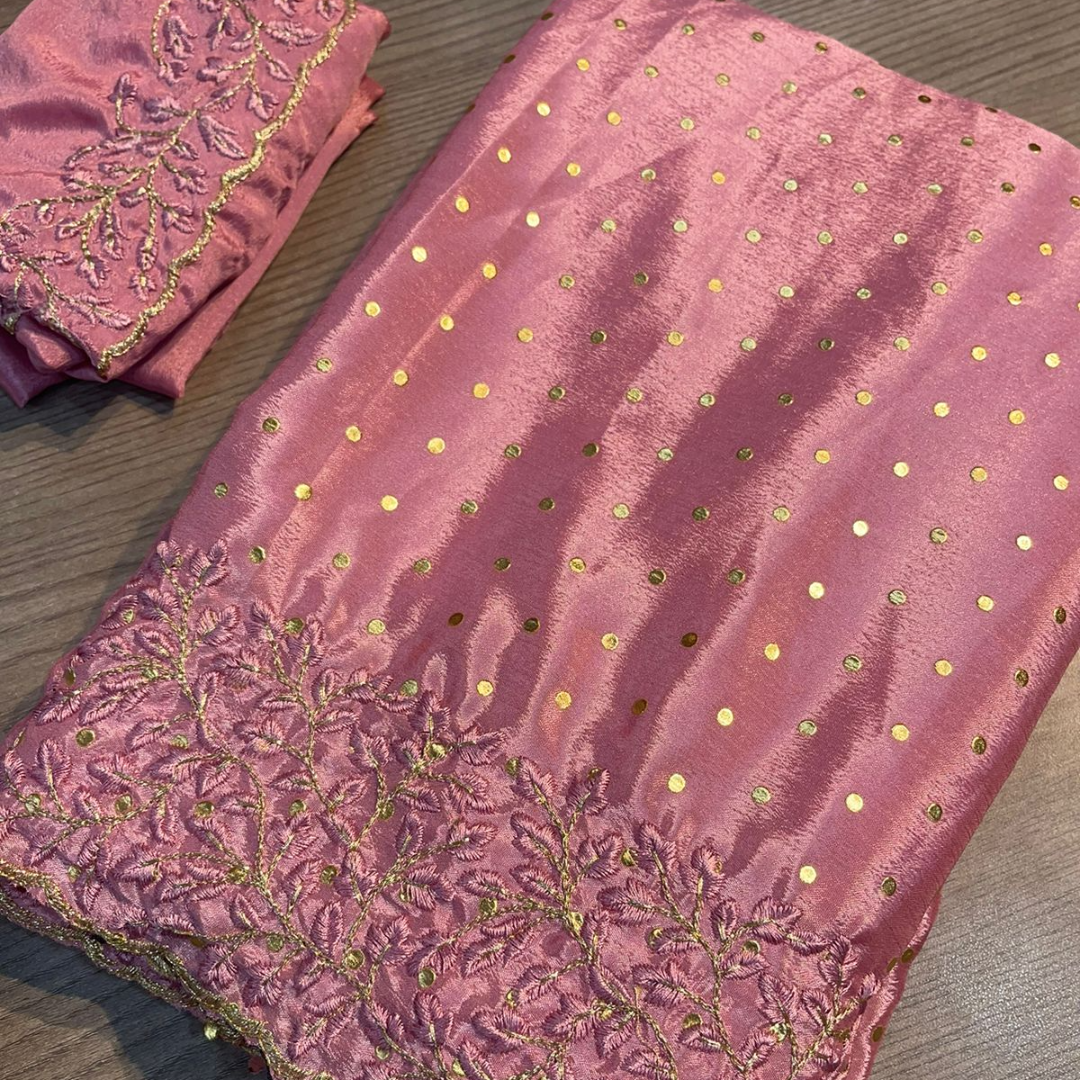 Pure Chinon Saree Pigment Foil Multi Emrodiry Work With Chinon Emorodairy Work Blouse !