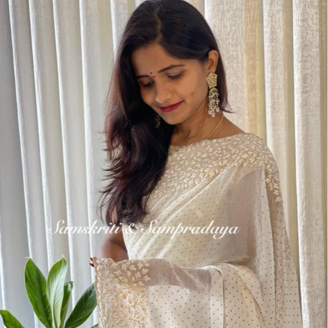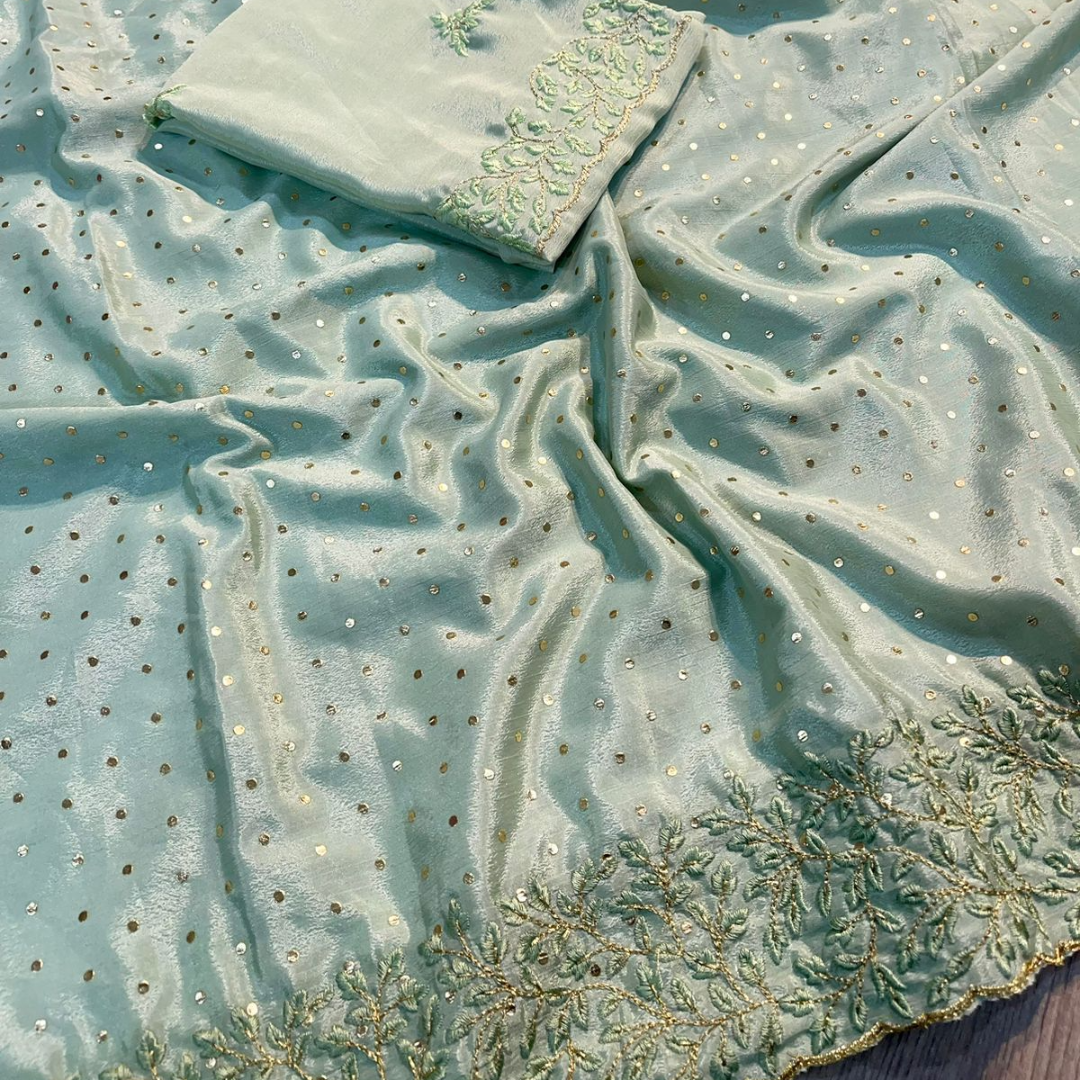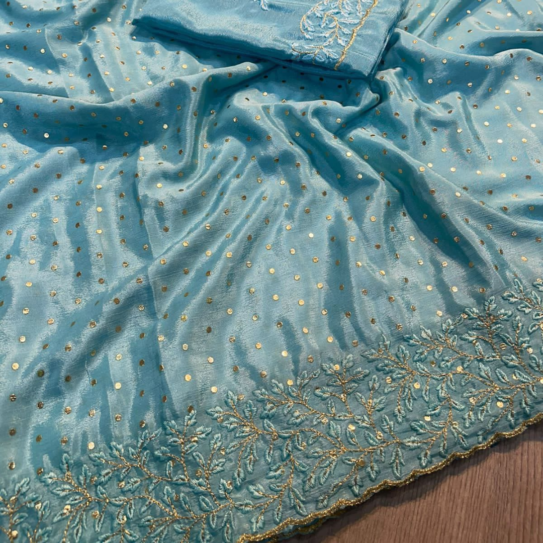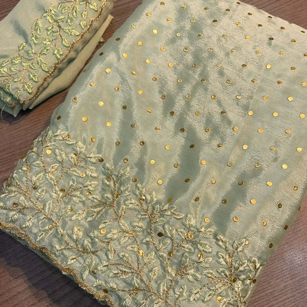 Pure Chinon Saree Pigment Foil Multi Emrodiry Work With Chinon Emorodairy Work Blouse !