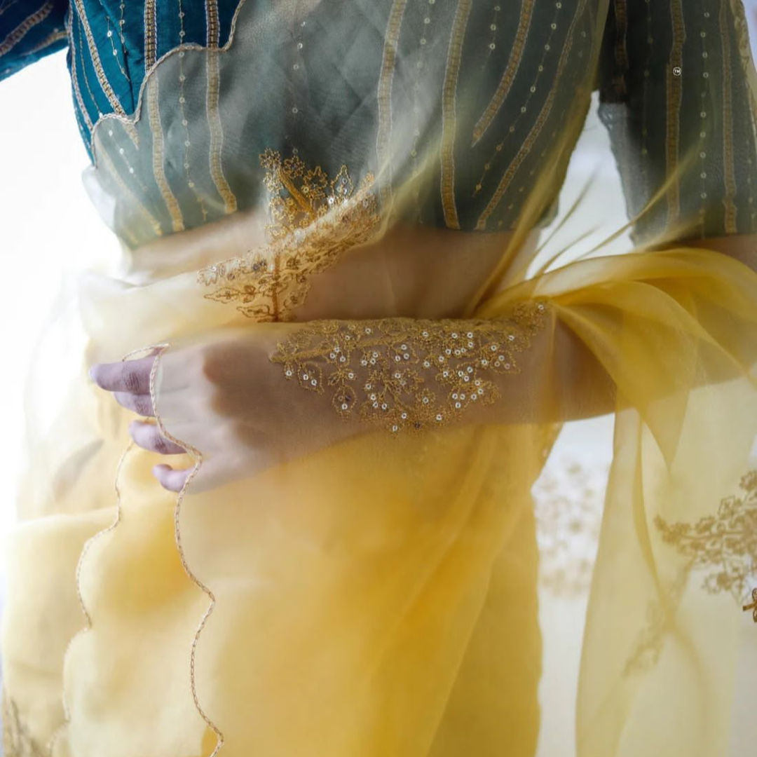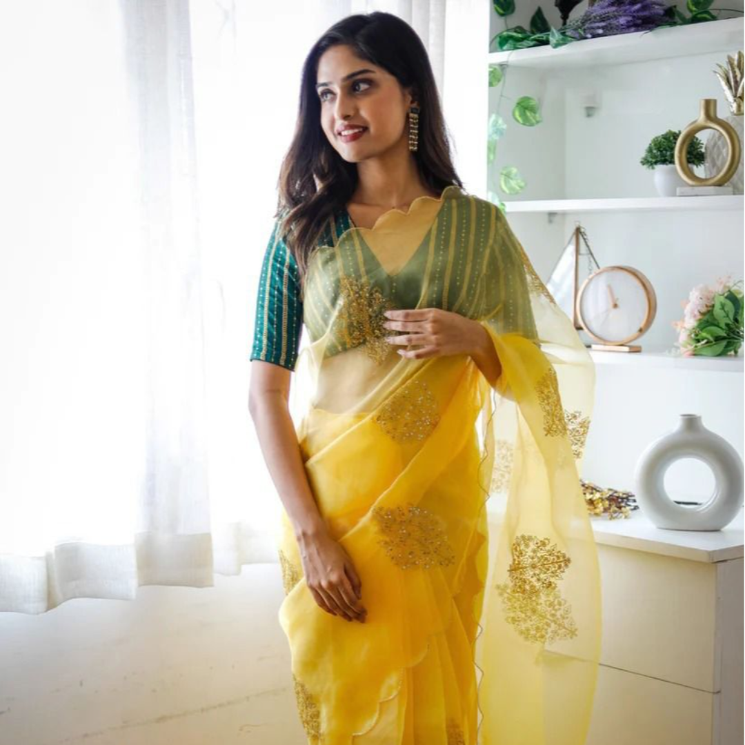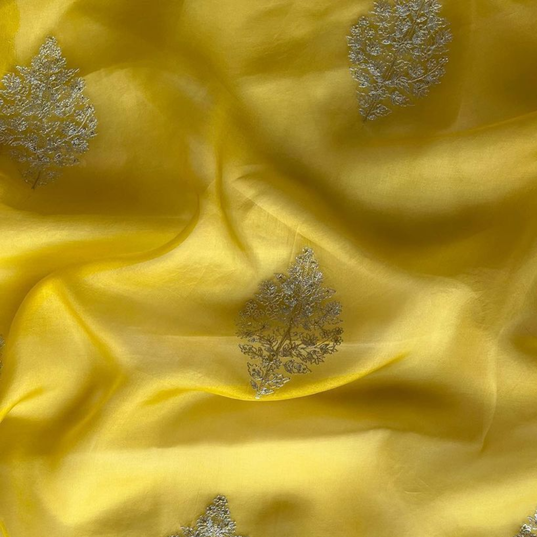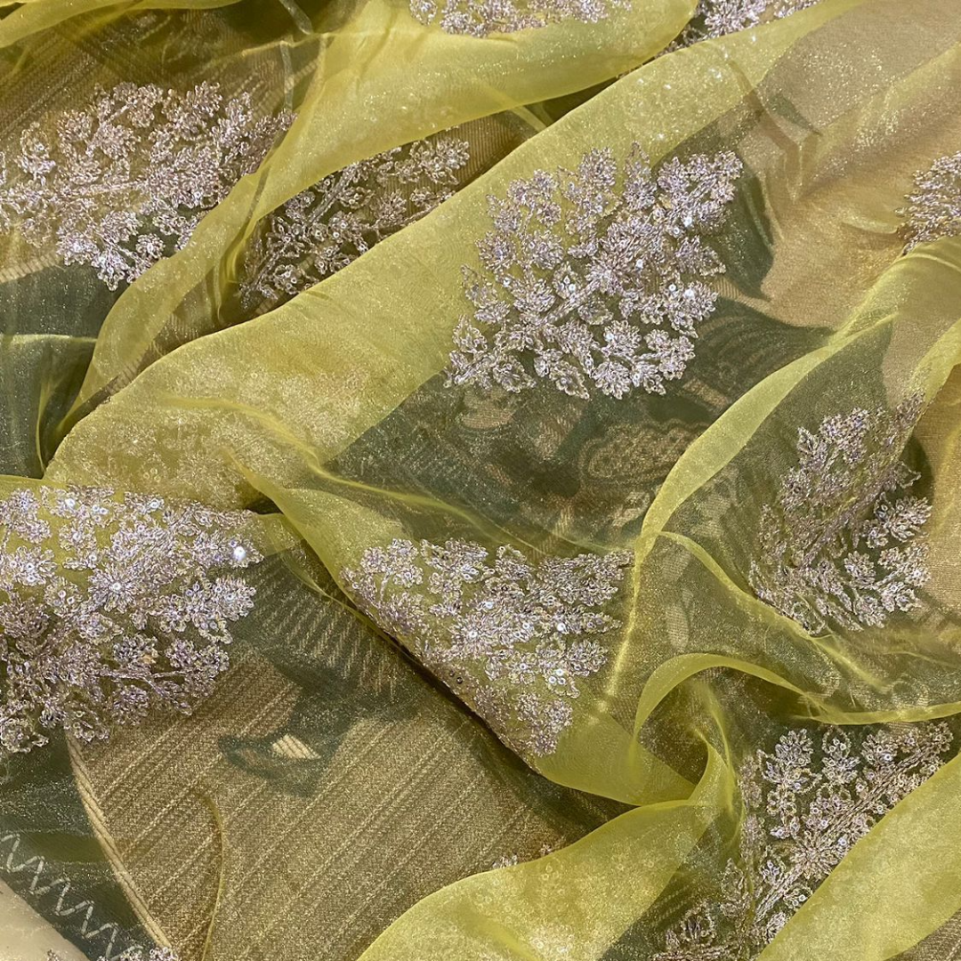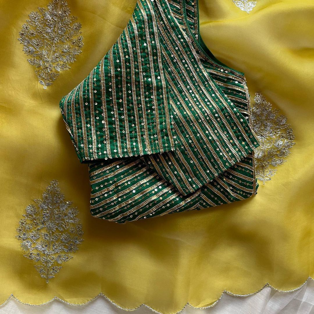 with coding sequence embroidered butta in all over saree with gotta Patti sequence work blouse