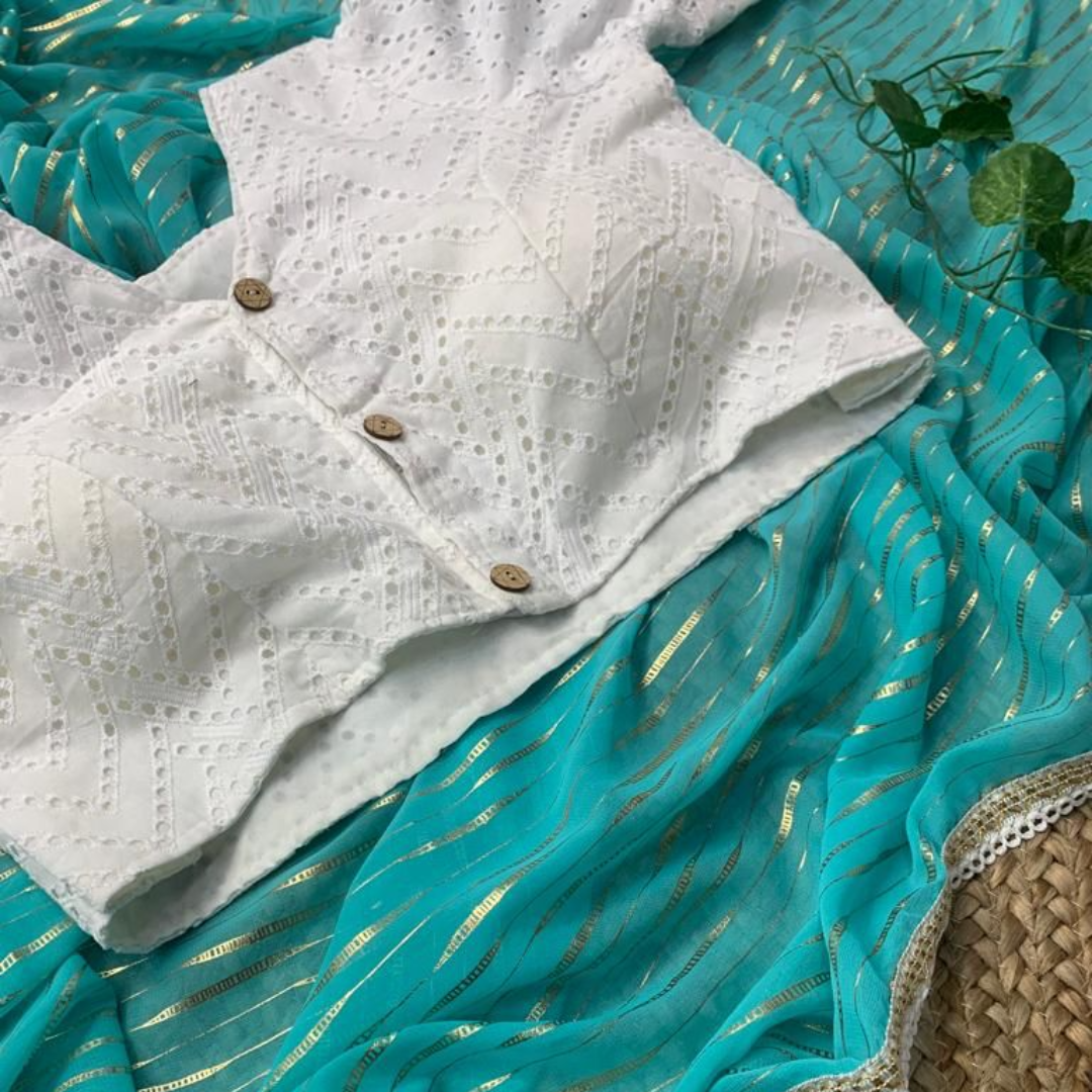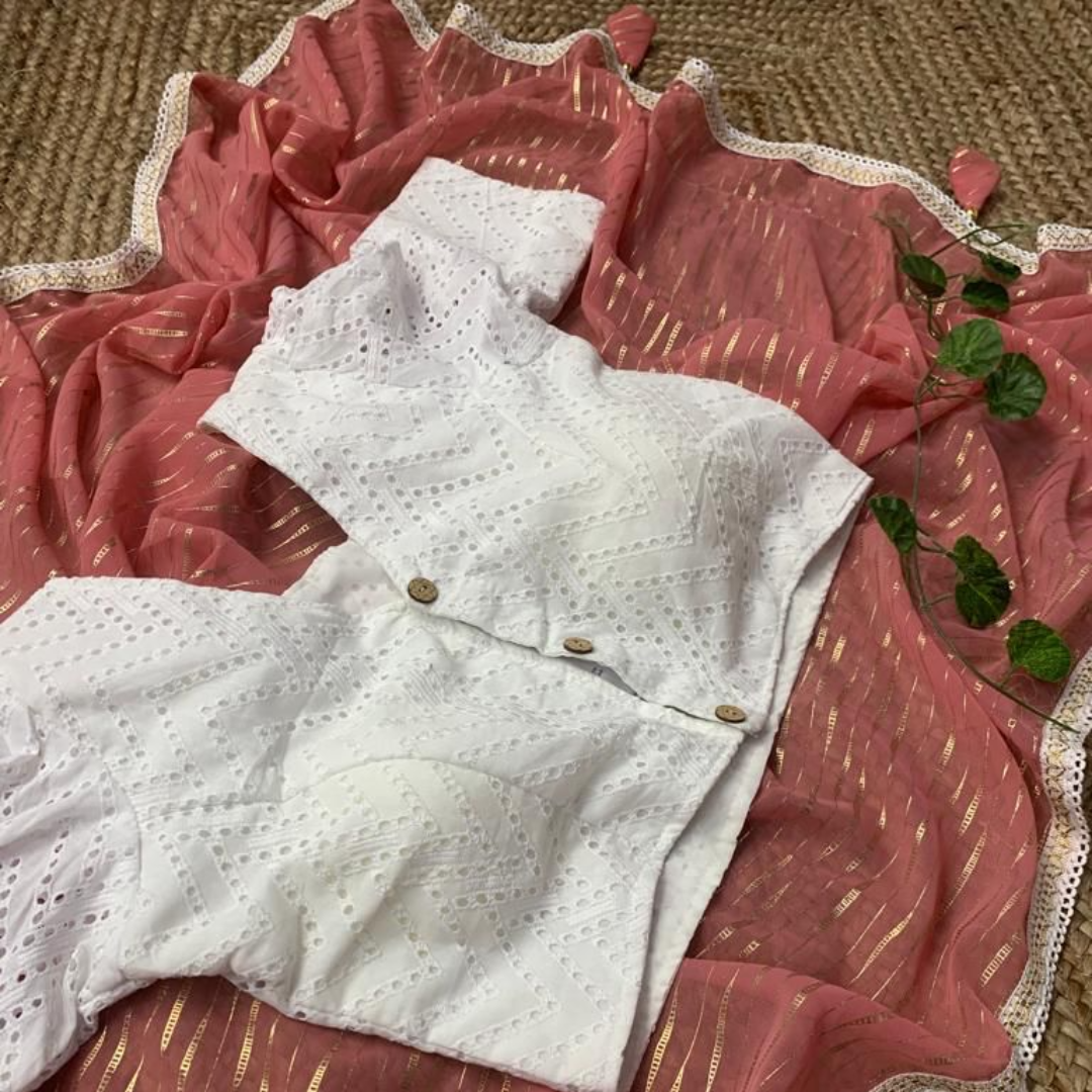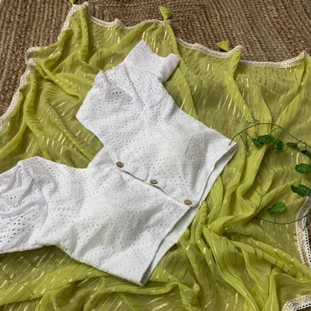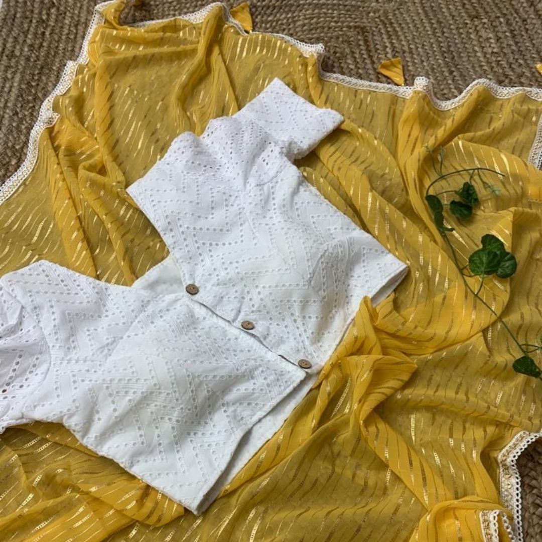 Pure soft georgette silk fabric with foil work in all over saree and fancy lace borders with latkan ..