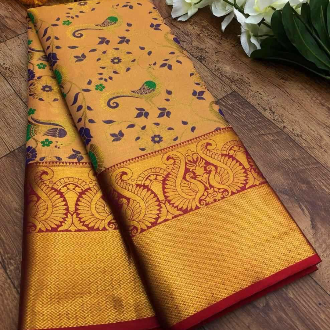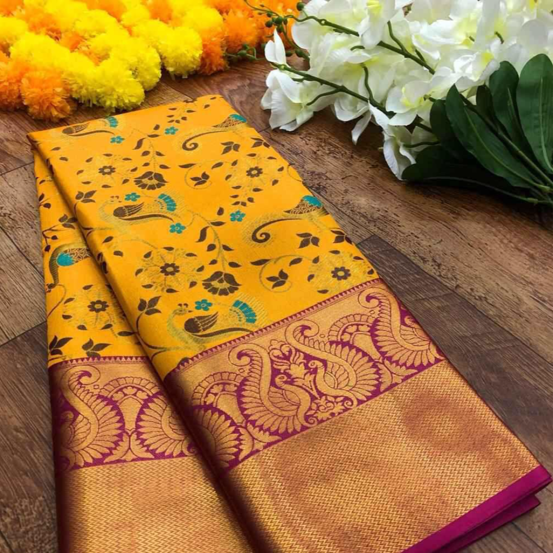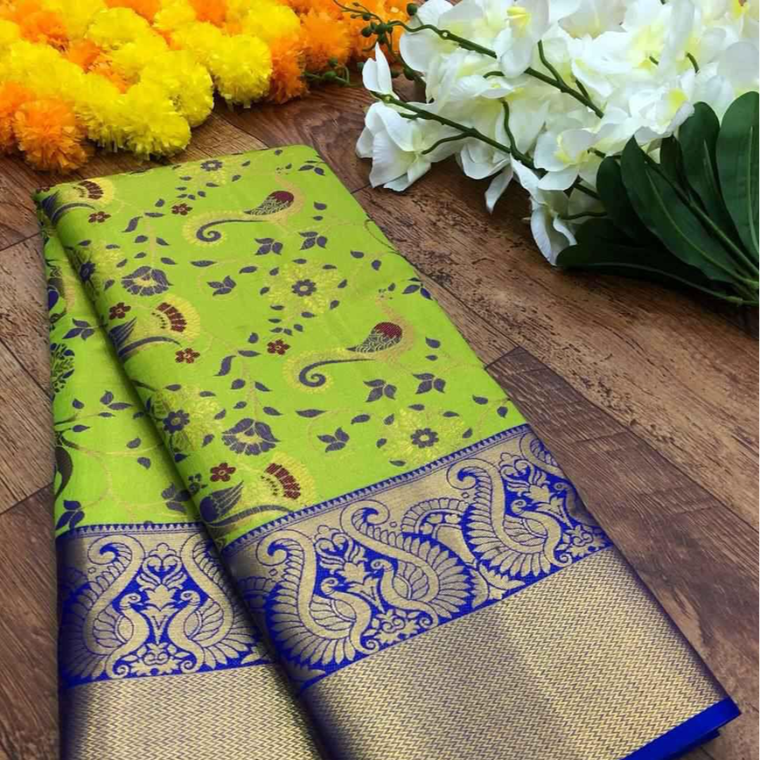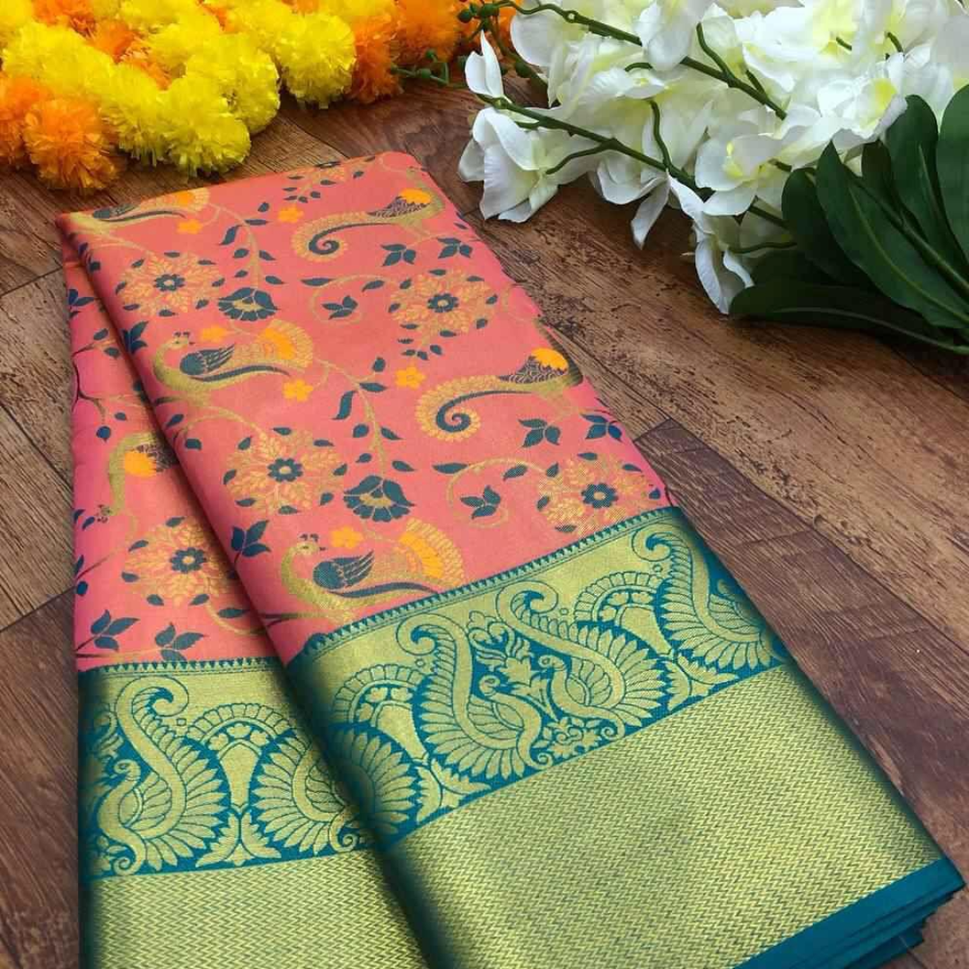 Fabric details - Kanjiviram silk peacock mina weaving with contrast weaving border made with pure zari & rich contrast weaving pallu