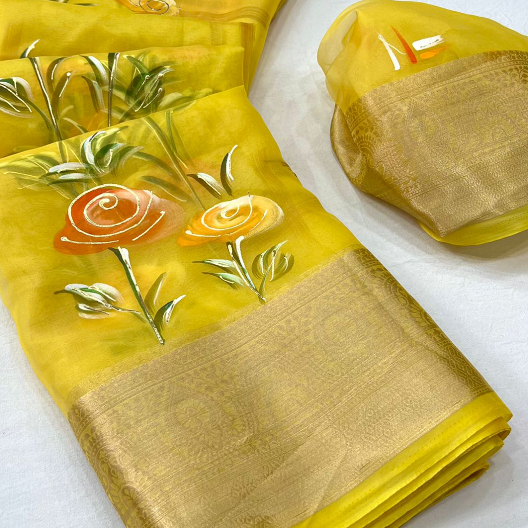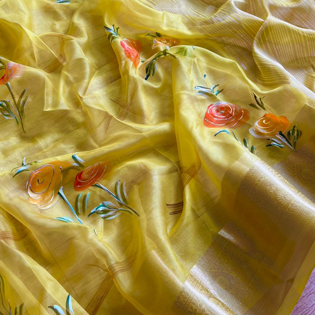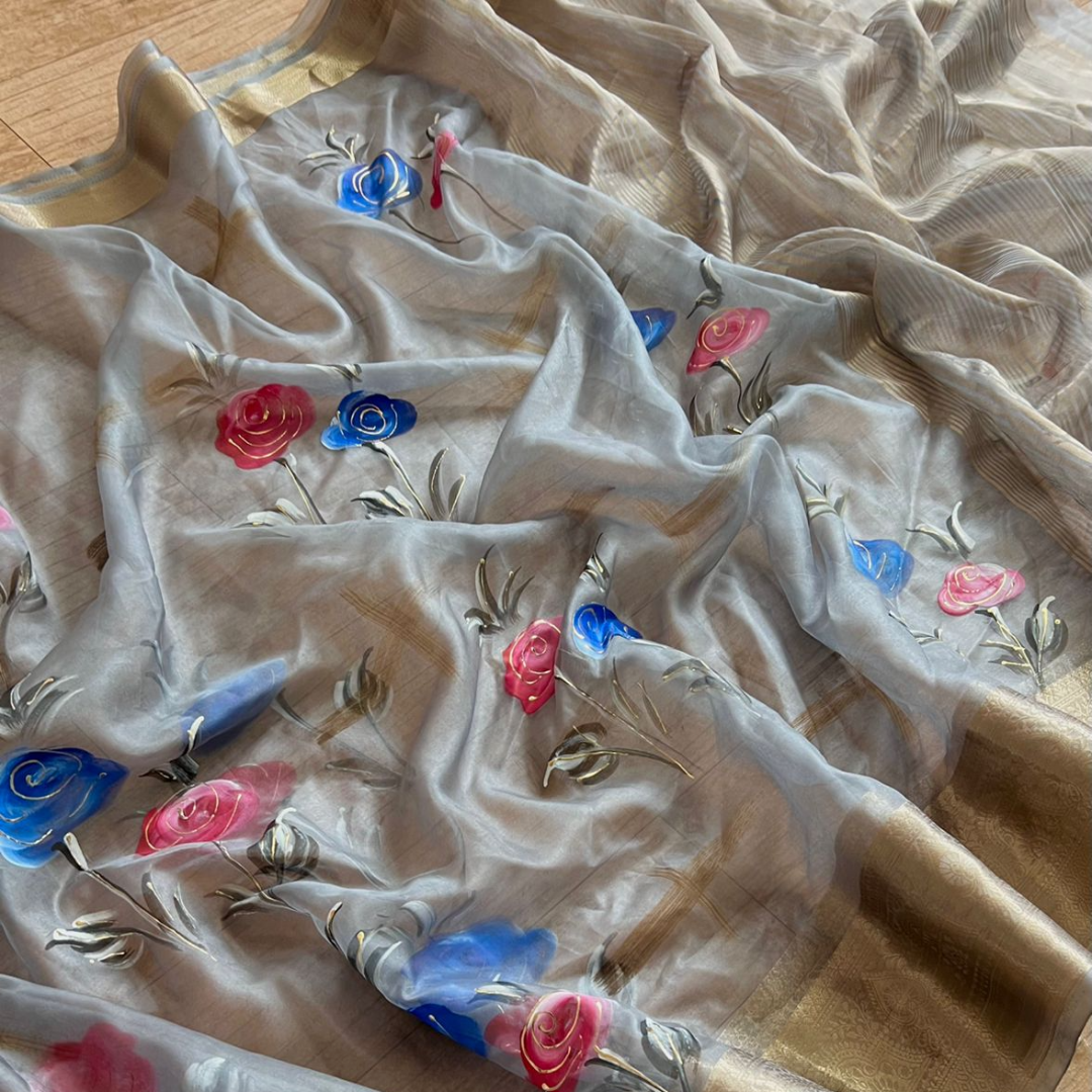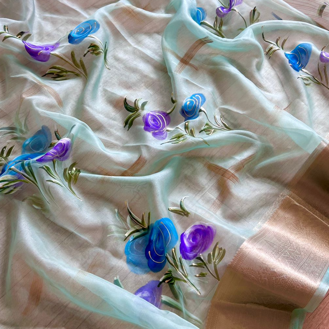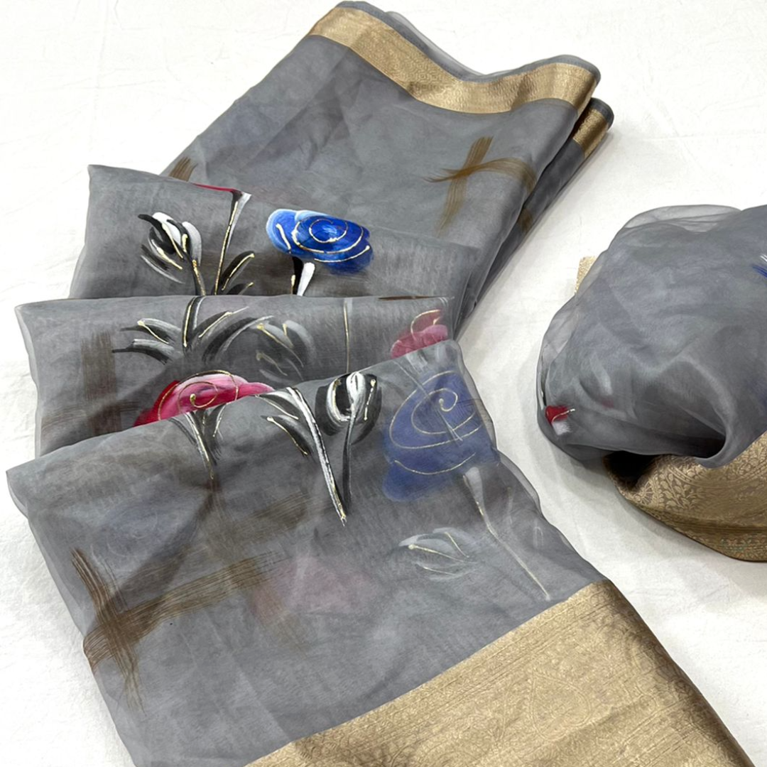 It has all over flowers print with fancy work on printed saree.