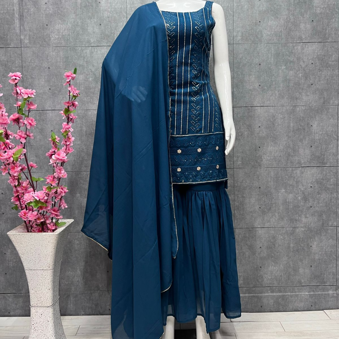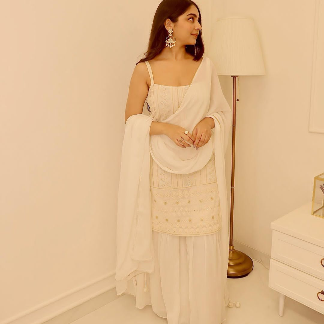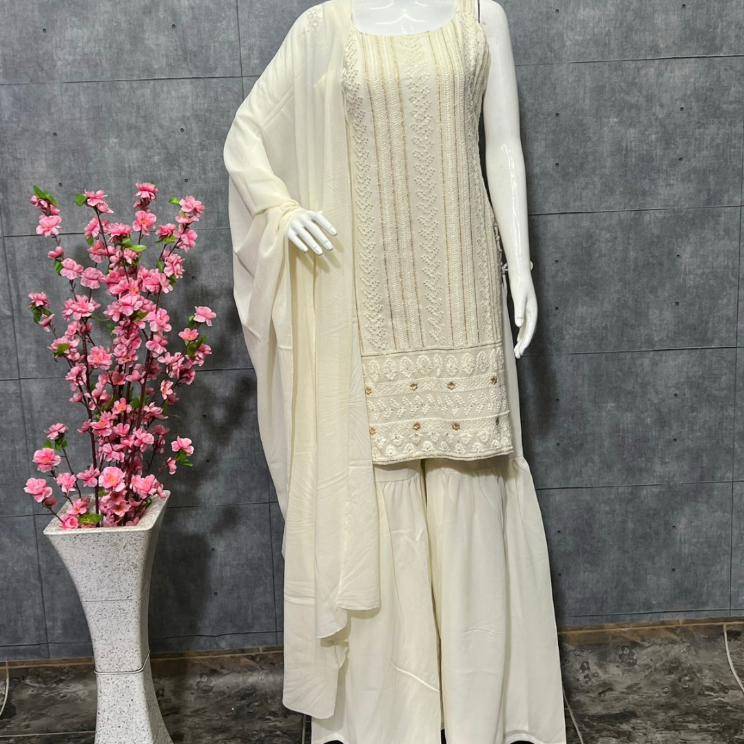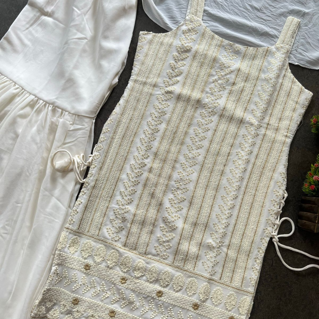 most demanded Beautiful pure Lukhnowi kurta embroidery cotton thread work,sequence work ,sharara And duppta set ready to wear