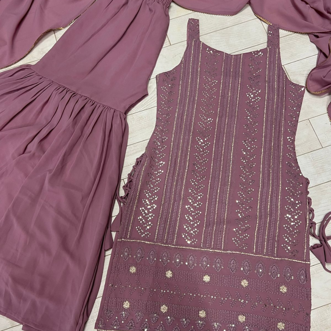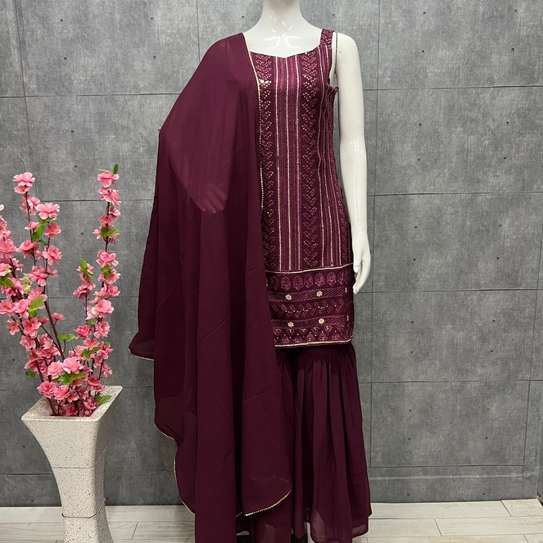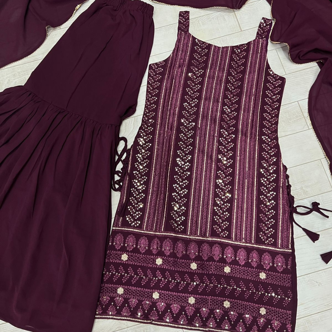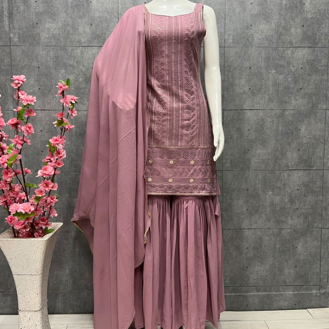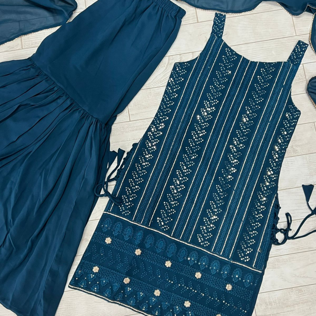 most demanded Beautiful pure Lukhnowi kurta embroidery cotton thread work,sequence work ,sharara And duppta set ready to wear