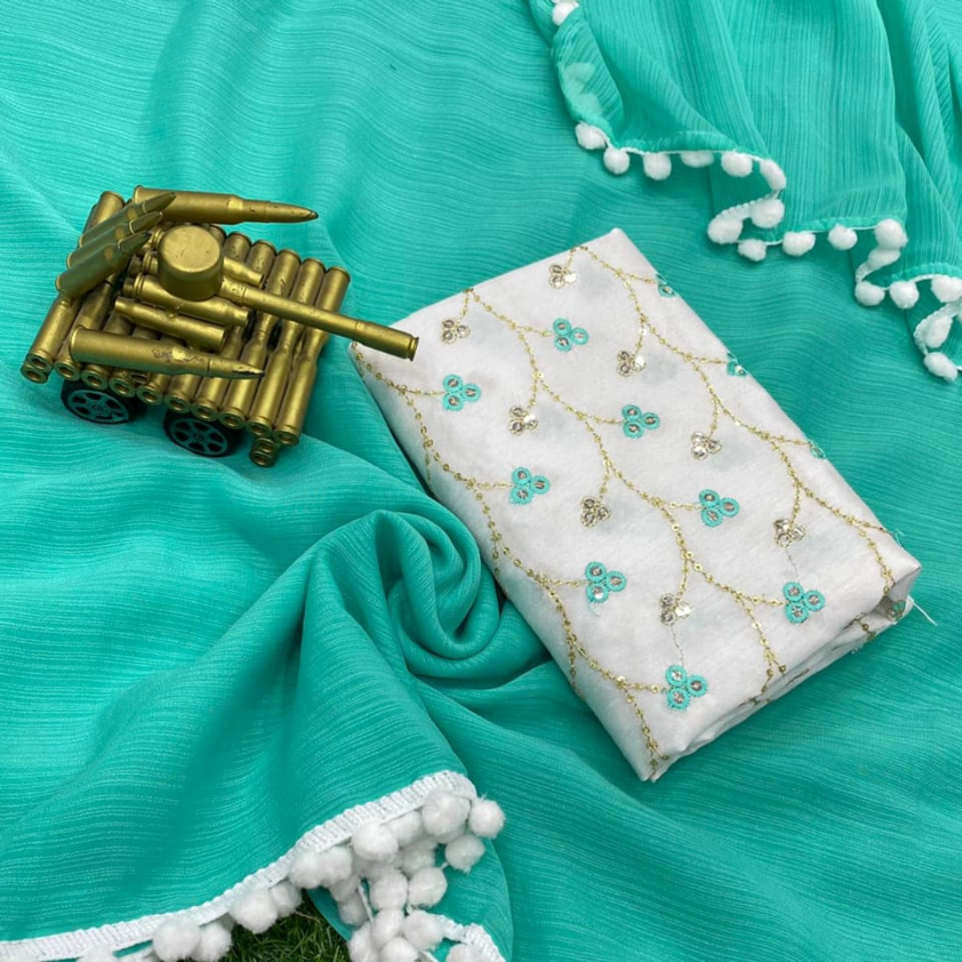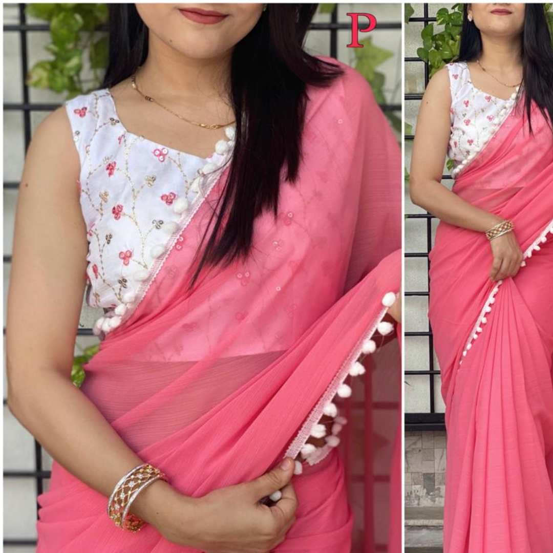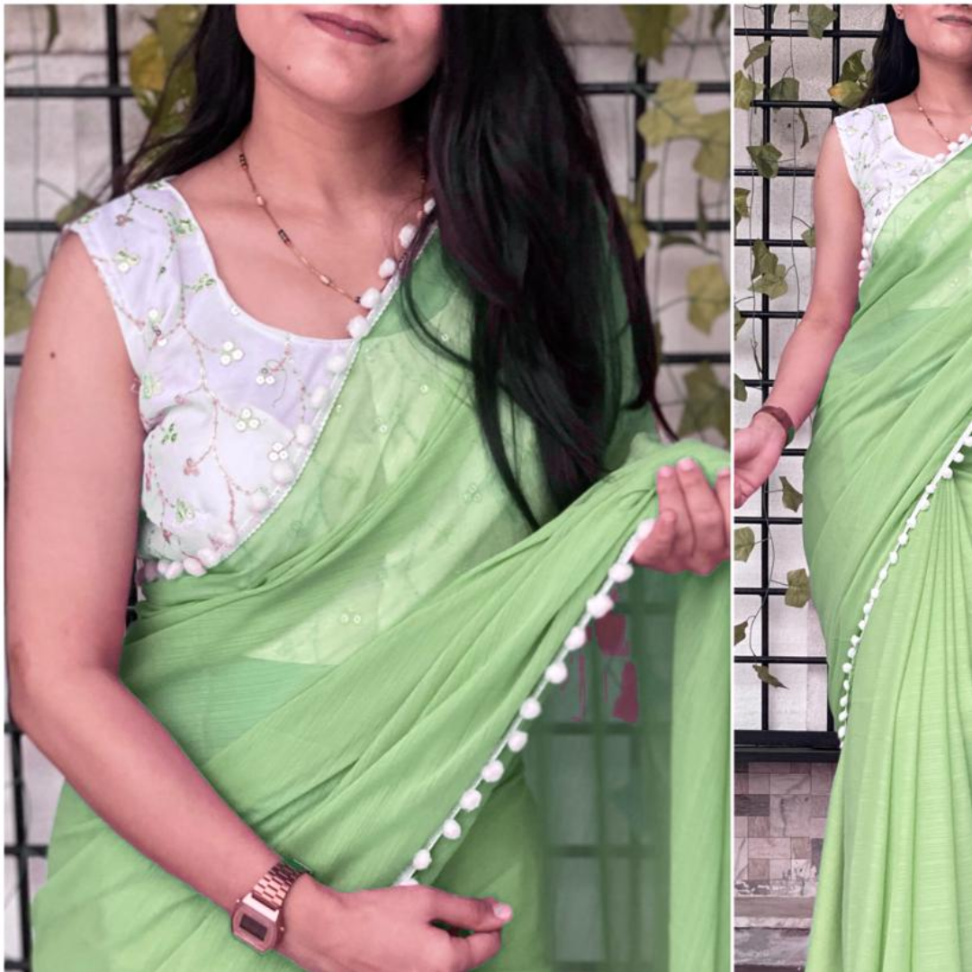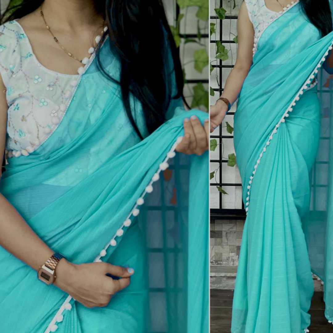 *PATTERN - White cat saree with pompom lace & contrast Sequins work Blouse*
