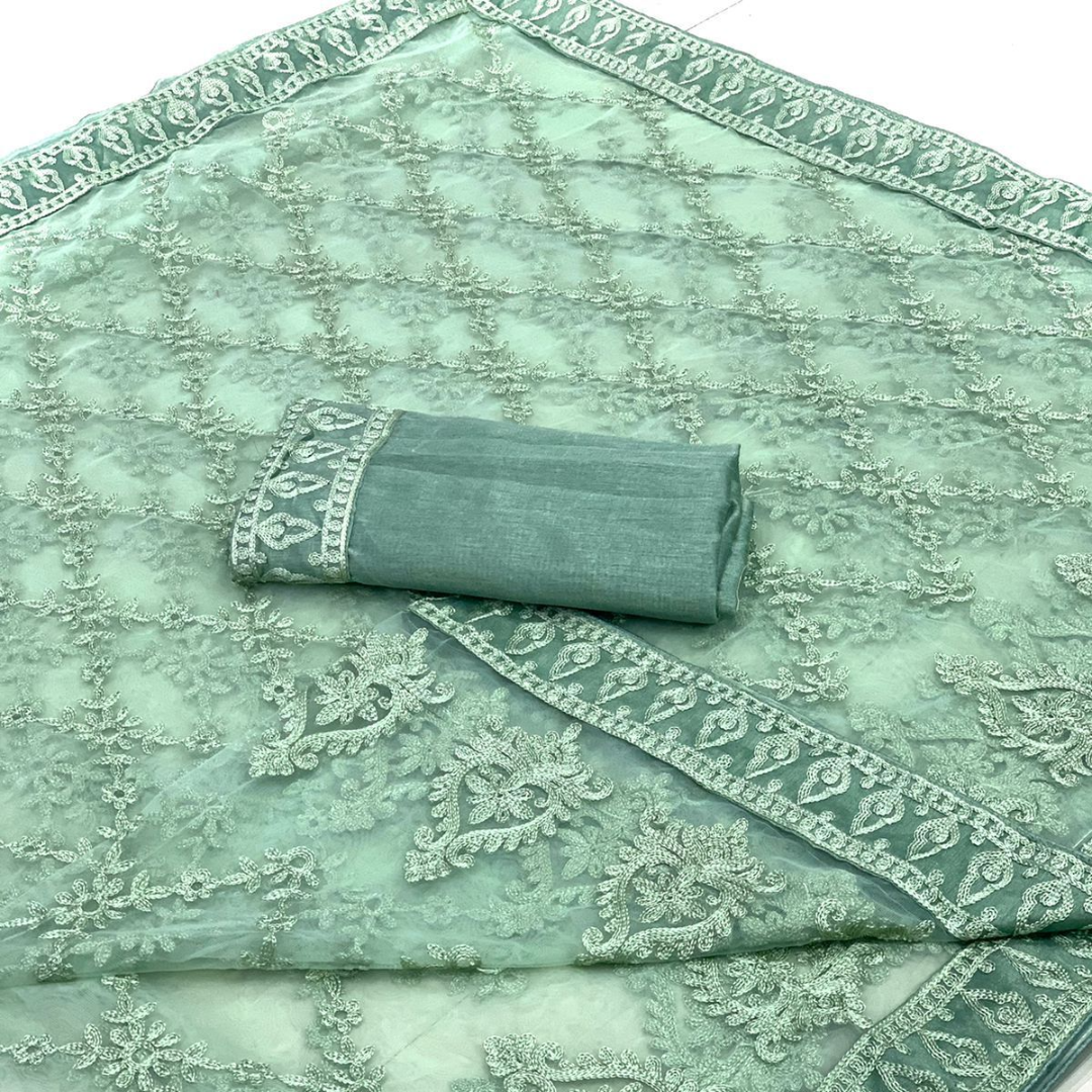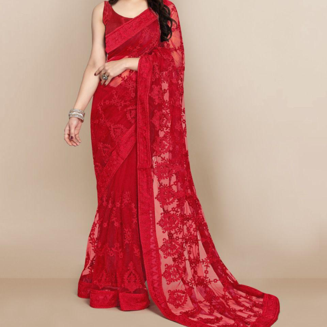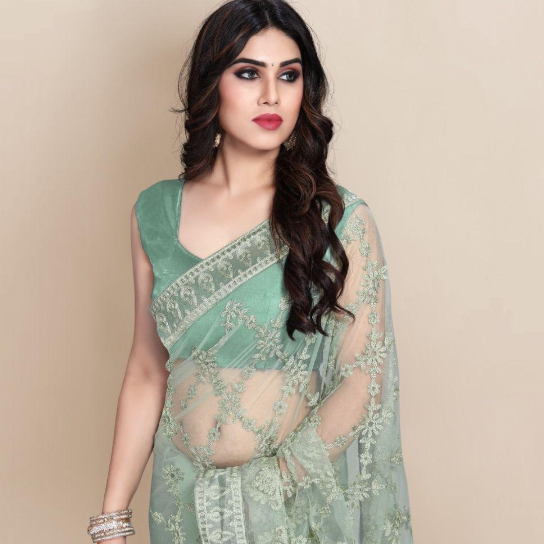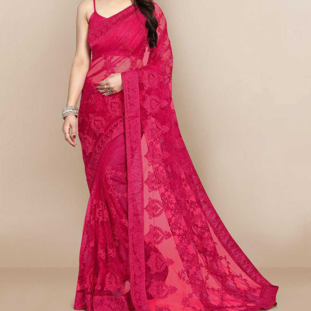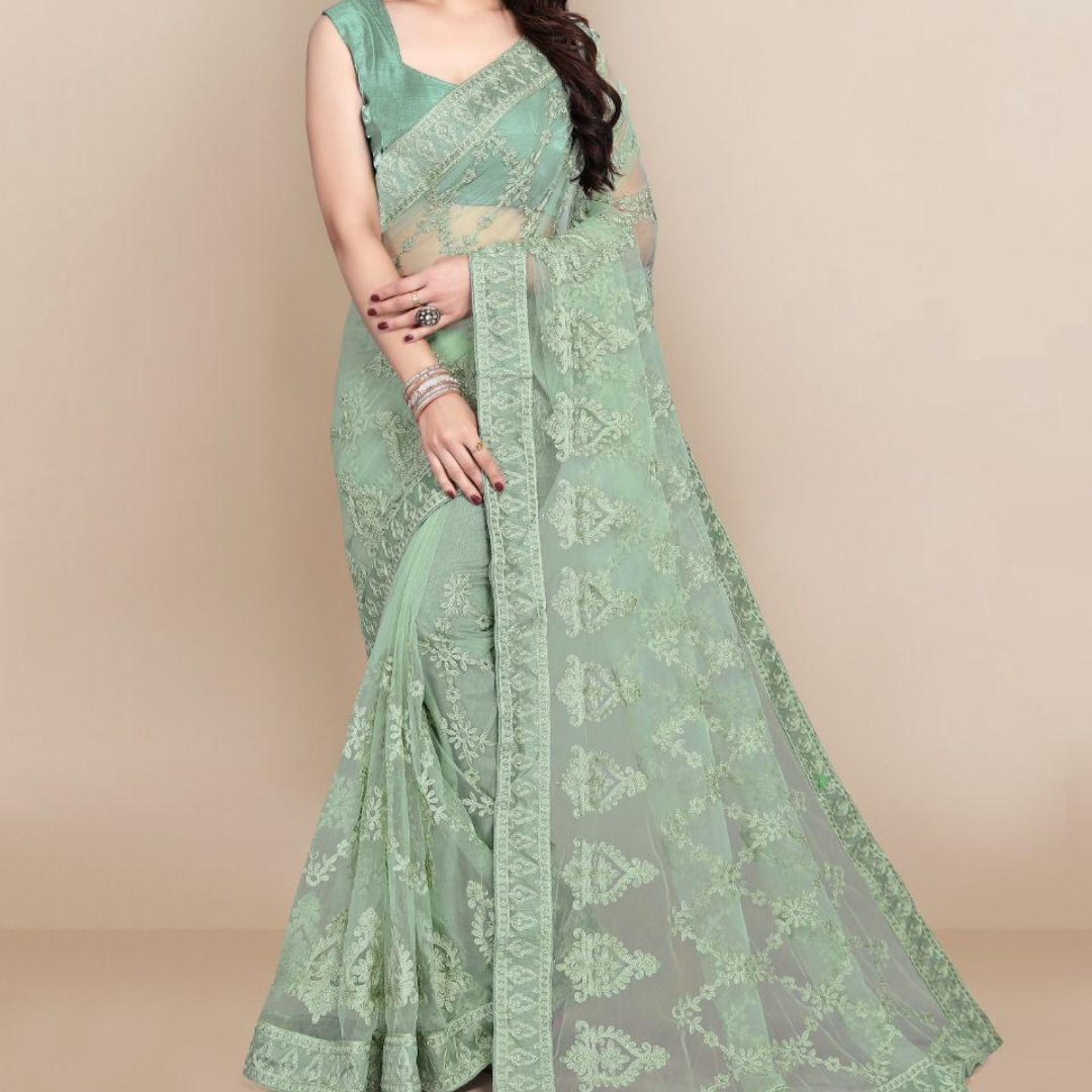 Looking for someone for this same color beautiful Designer Saree on premium super Net fabric with extraordinary embroidery with piping border and whole sarees with red and green thread butta