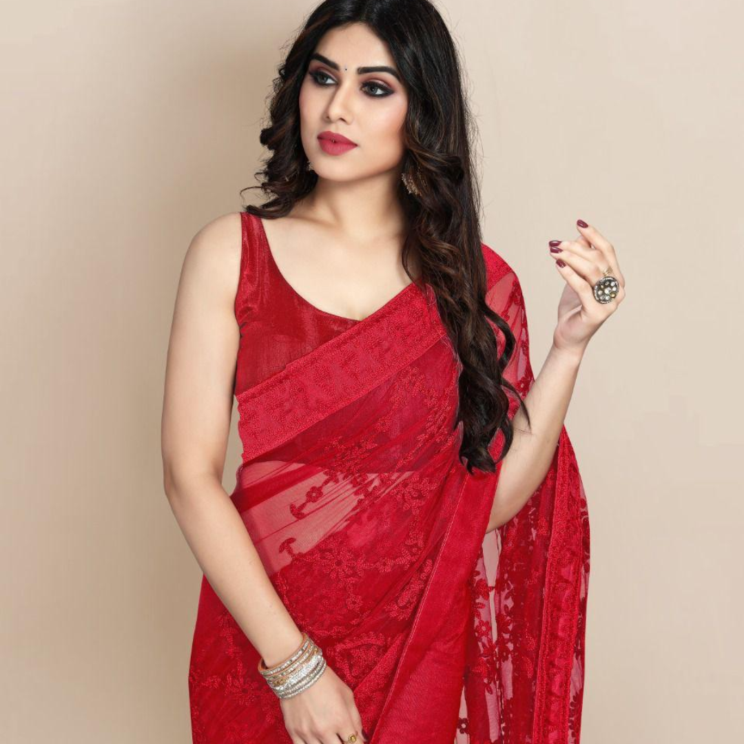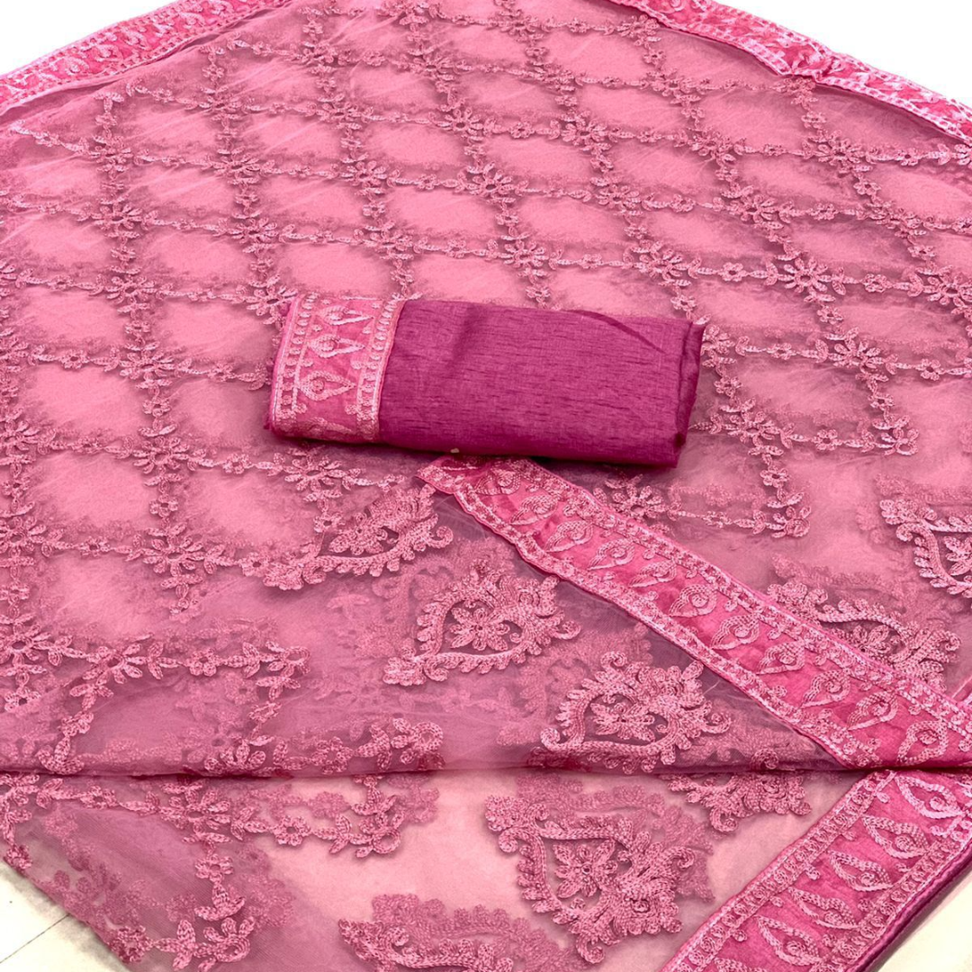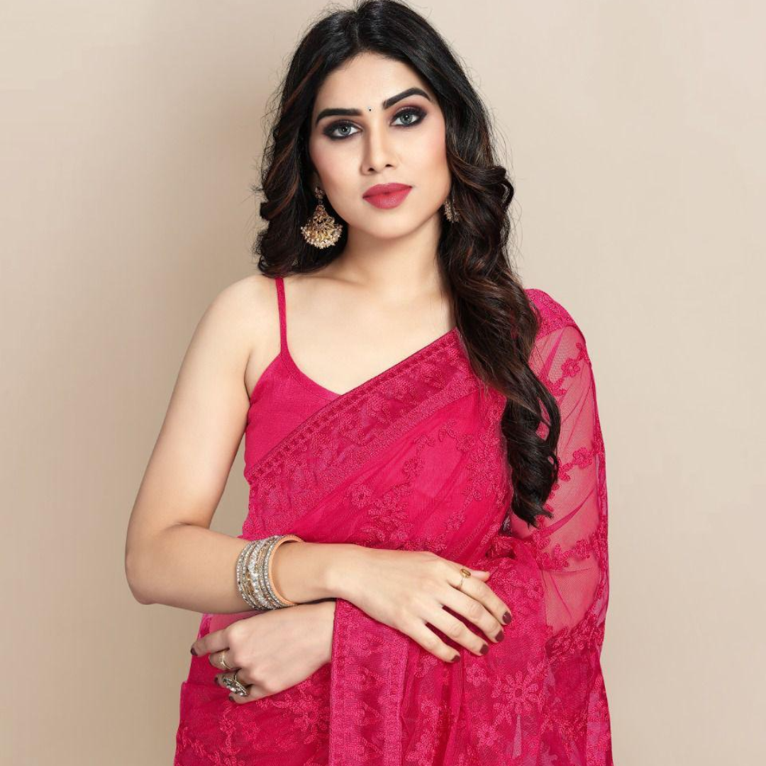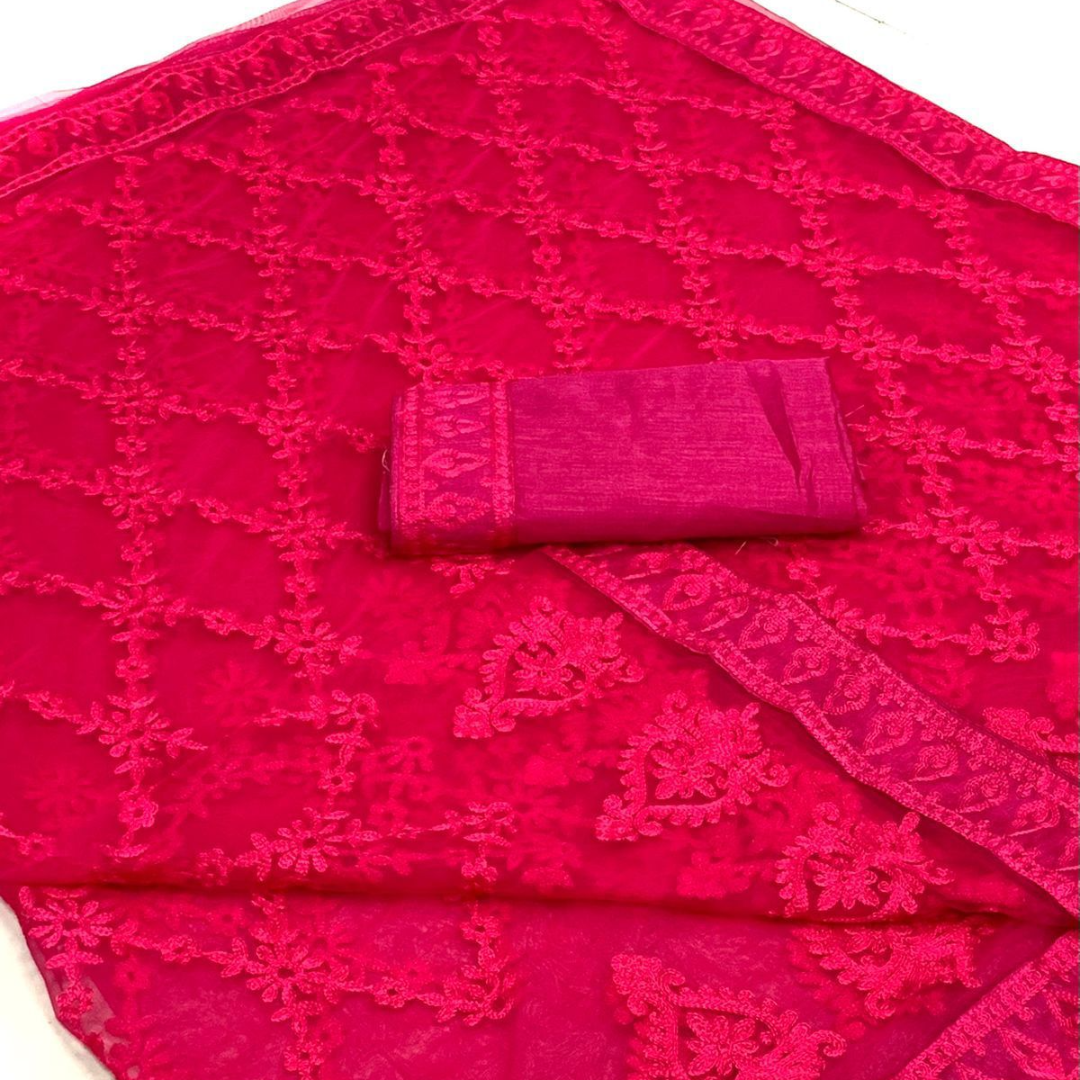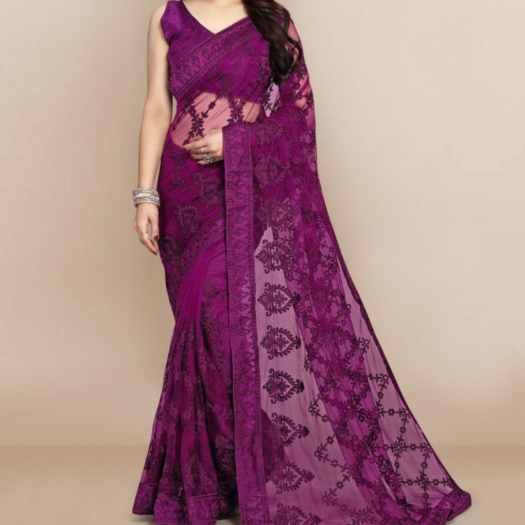 Looking for someone for this same color beautiful Designer Saree on premium super Net fabric with extraordinary embroidery with piping border and whole sarees with red and green thread butta
