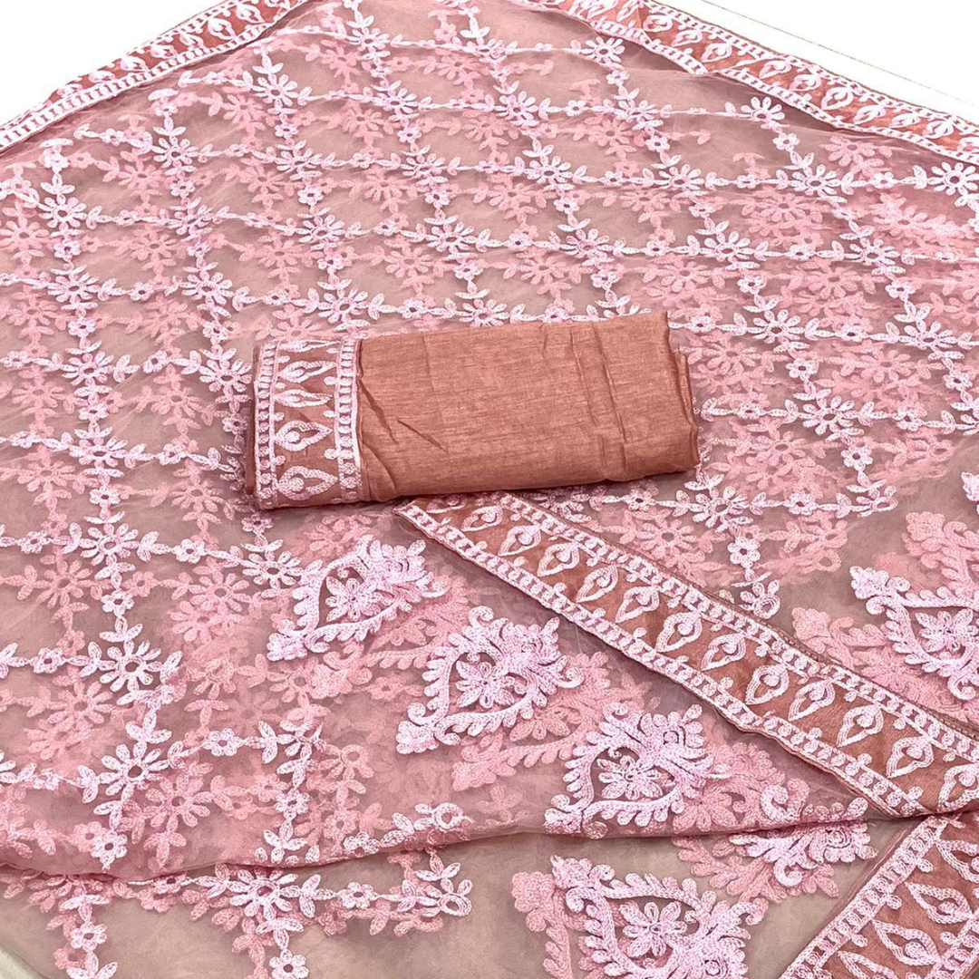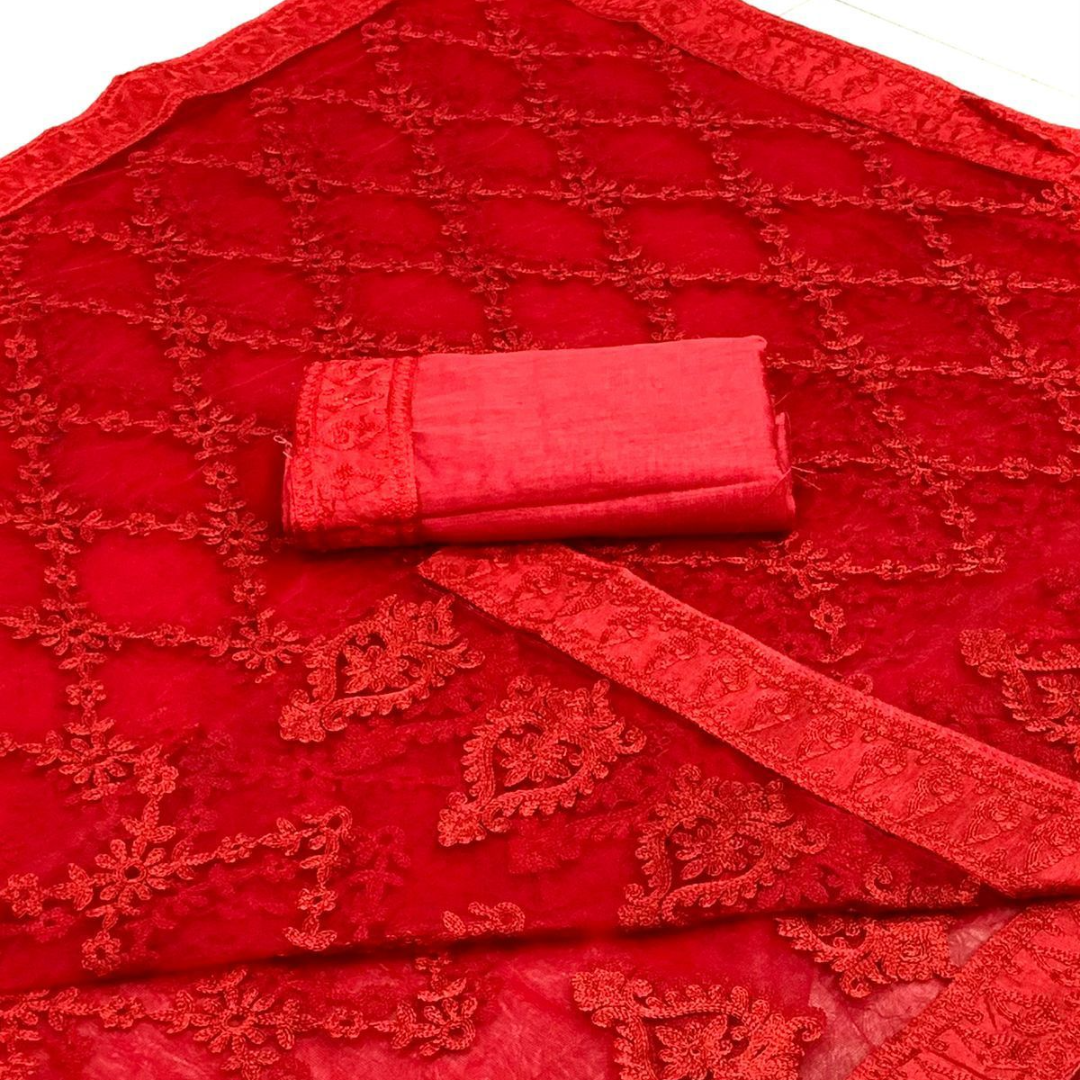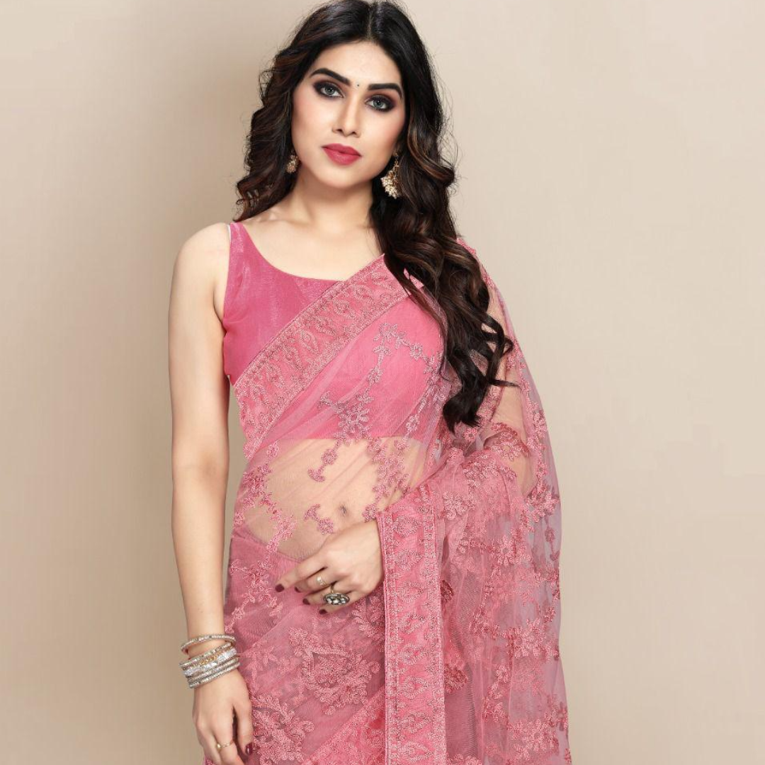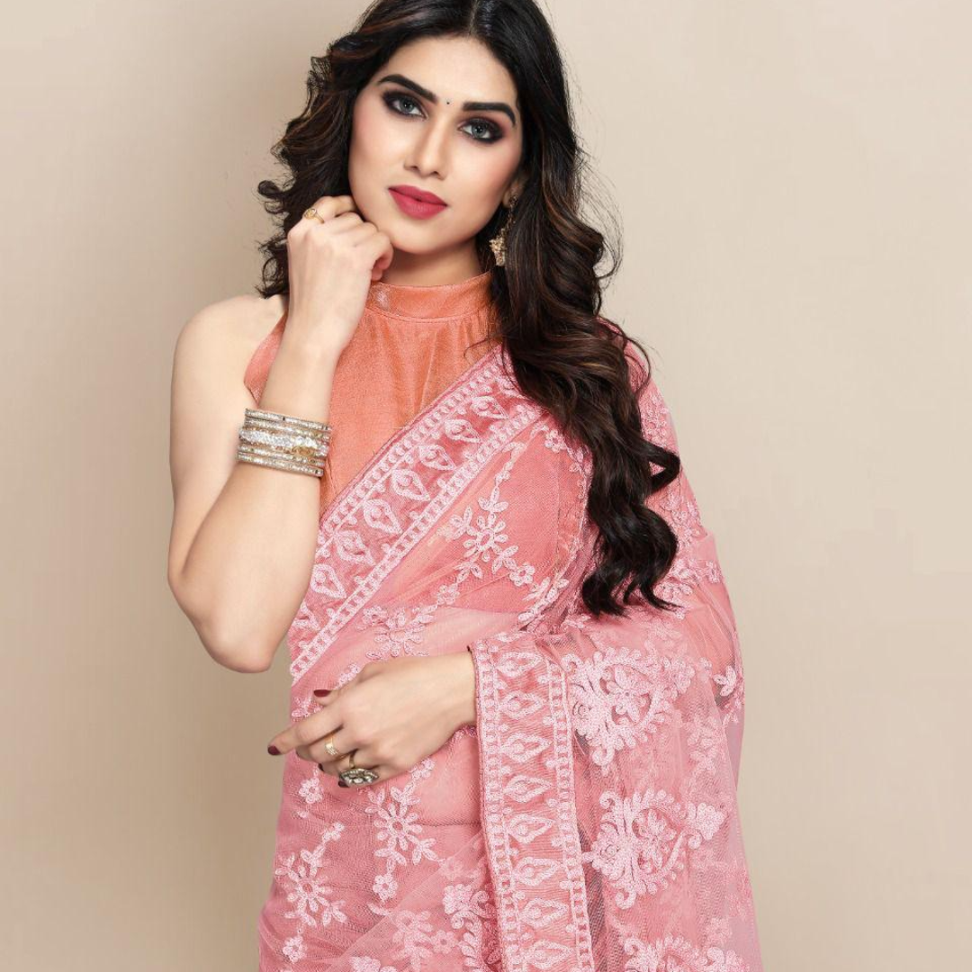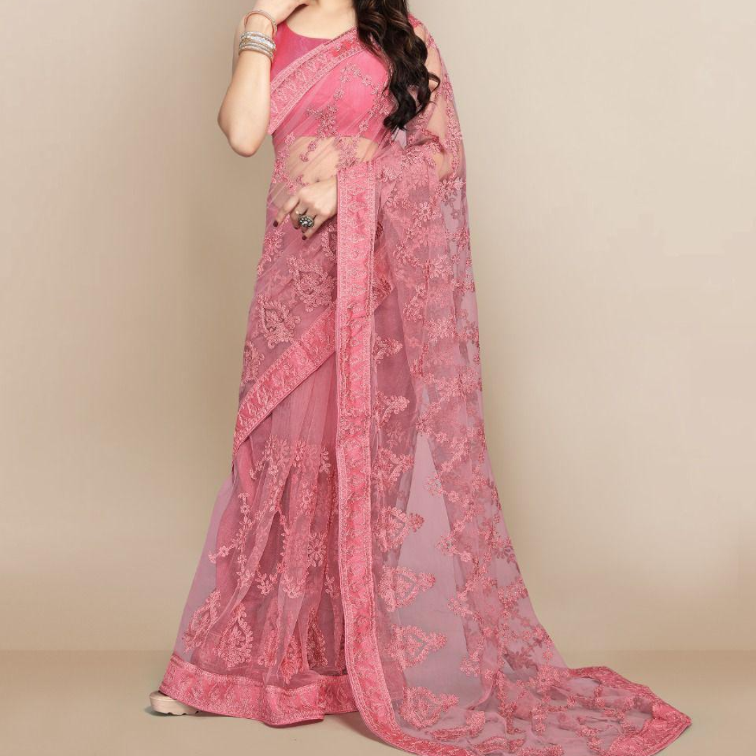 Looking for someone for this same color beautiful Designer Saree on premium super Net fabric with extraordinary embroidery with piping border and whole sarees with red and green thread butta