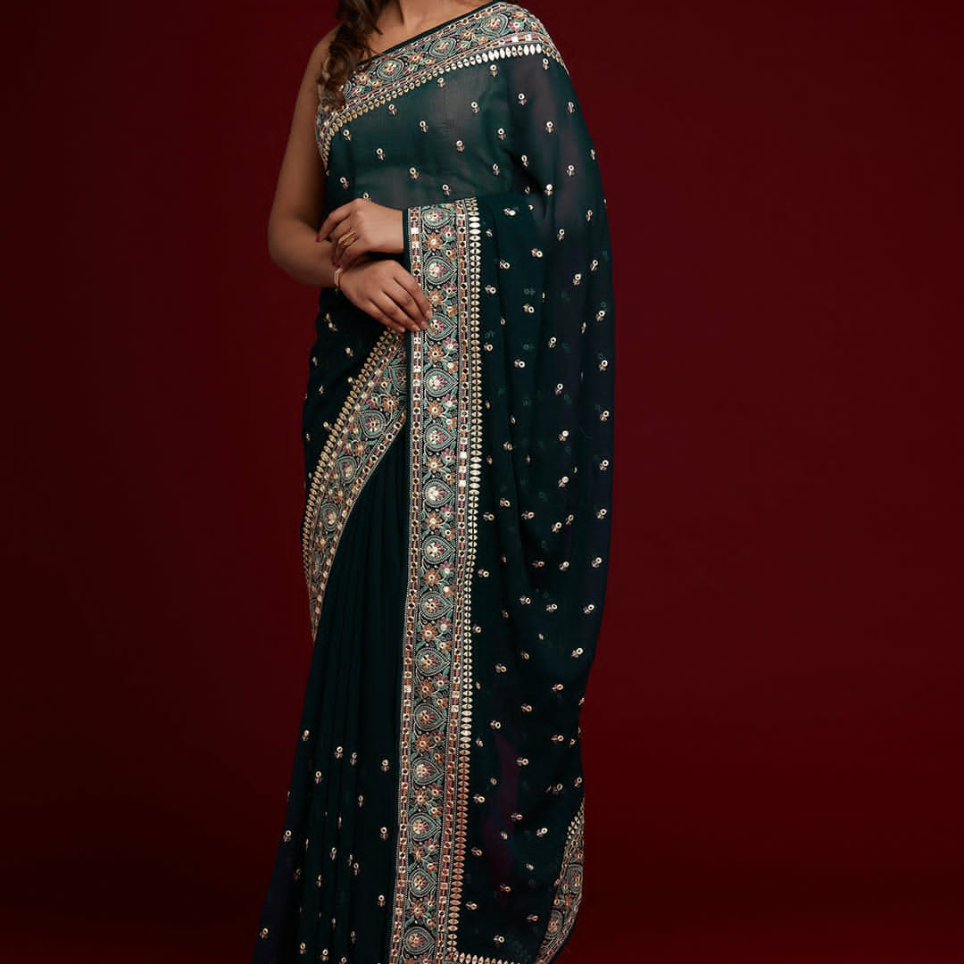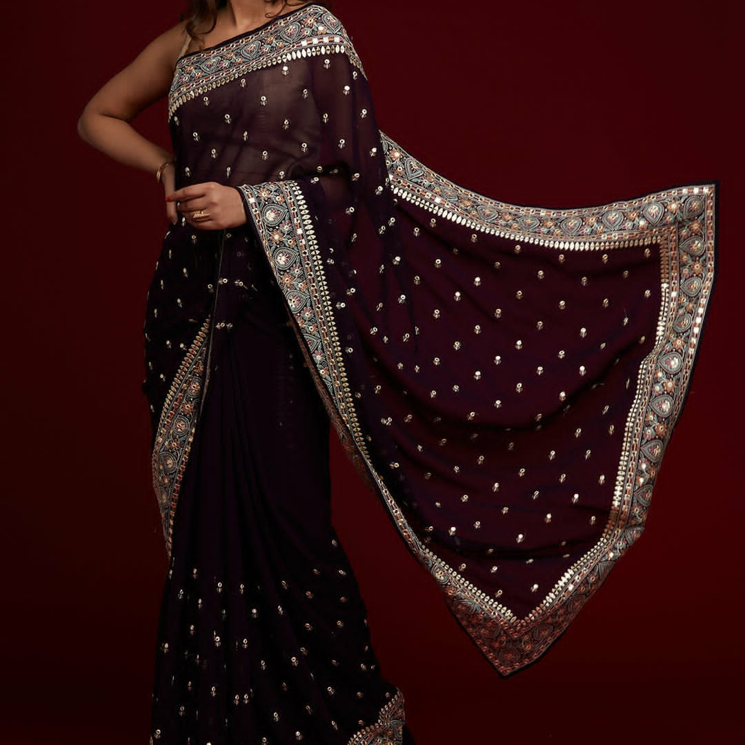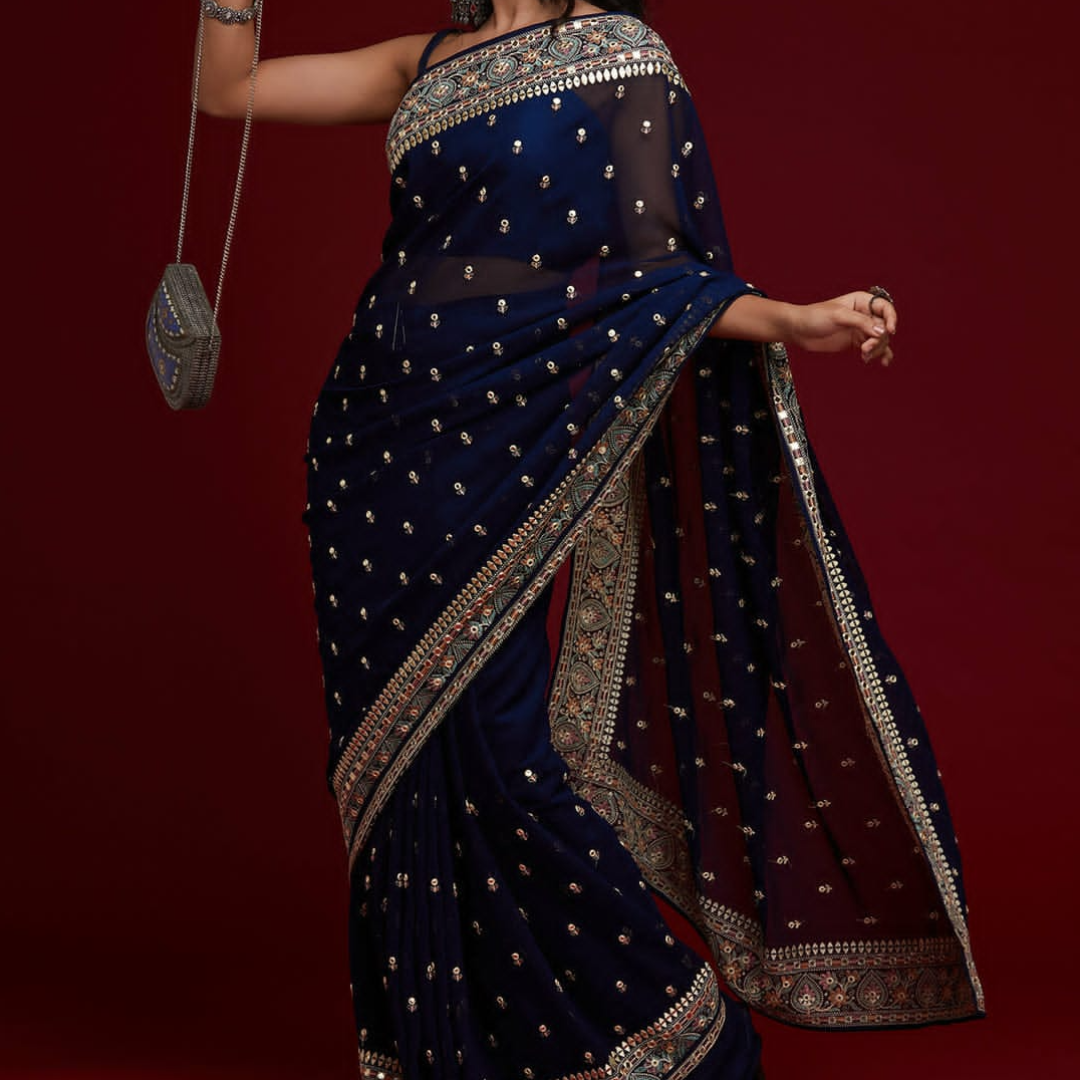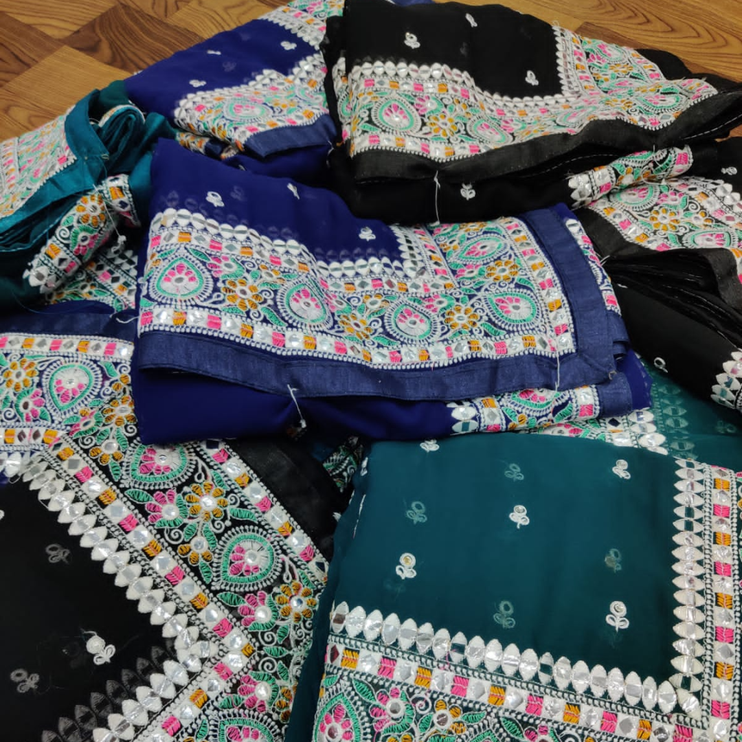 Heavy Georgette Silk Saree With Designer Original Cross Stitch Threads Work Along With Designer FOIL MIRROR & STONE WORK With Box Border Piping & Matching Blouse