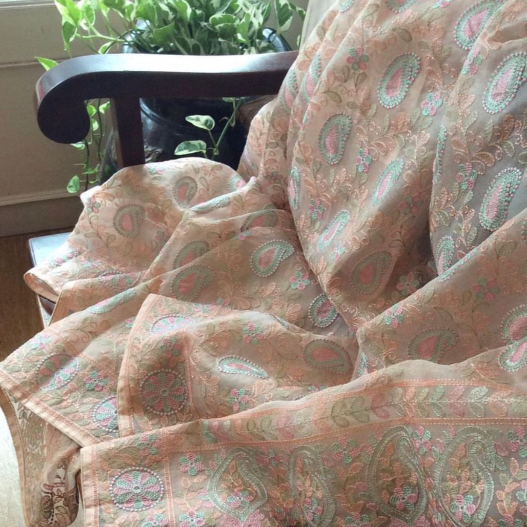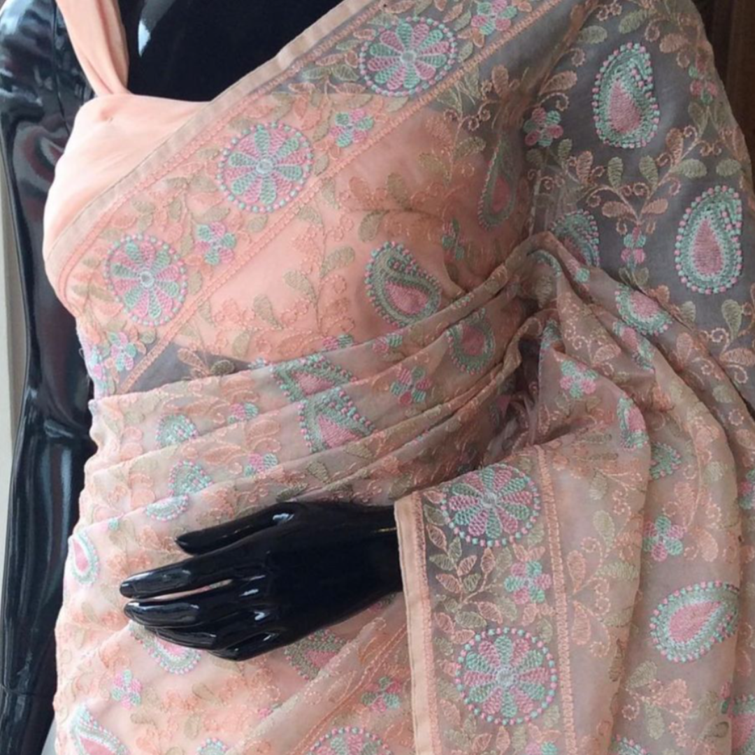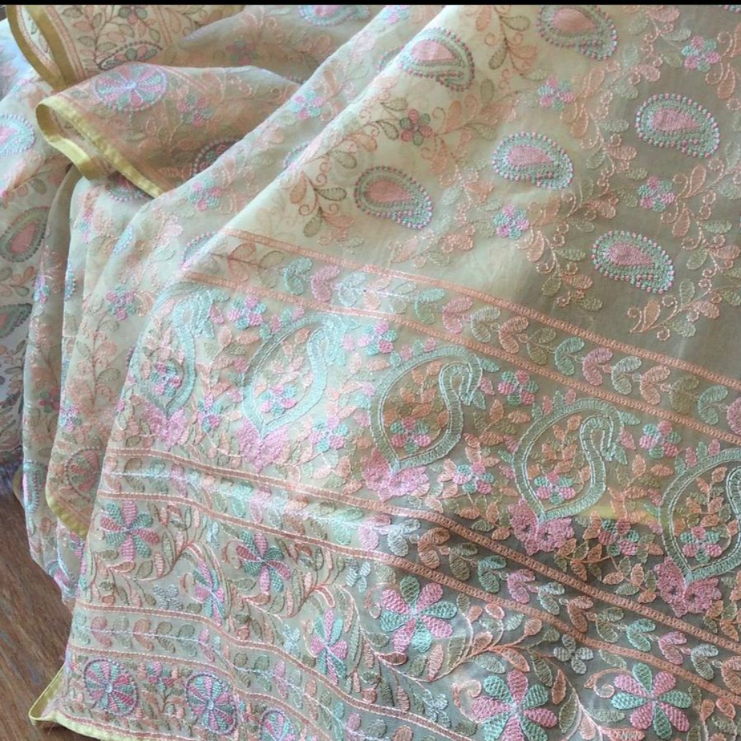 Semi pure organza saree with beautiful colour full lucknow embroidery all over saree and silk blouse