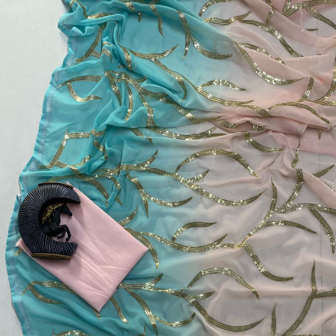 SAREE: FUX GEORGETTE PRINT WITH SEQUENCE EMBROIDERED WORK WITH BACK PATCH PATTI 5.5meter