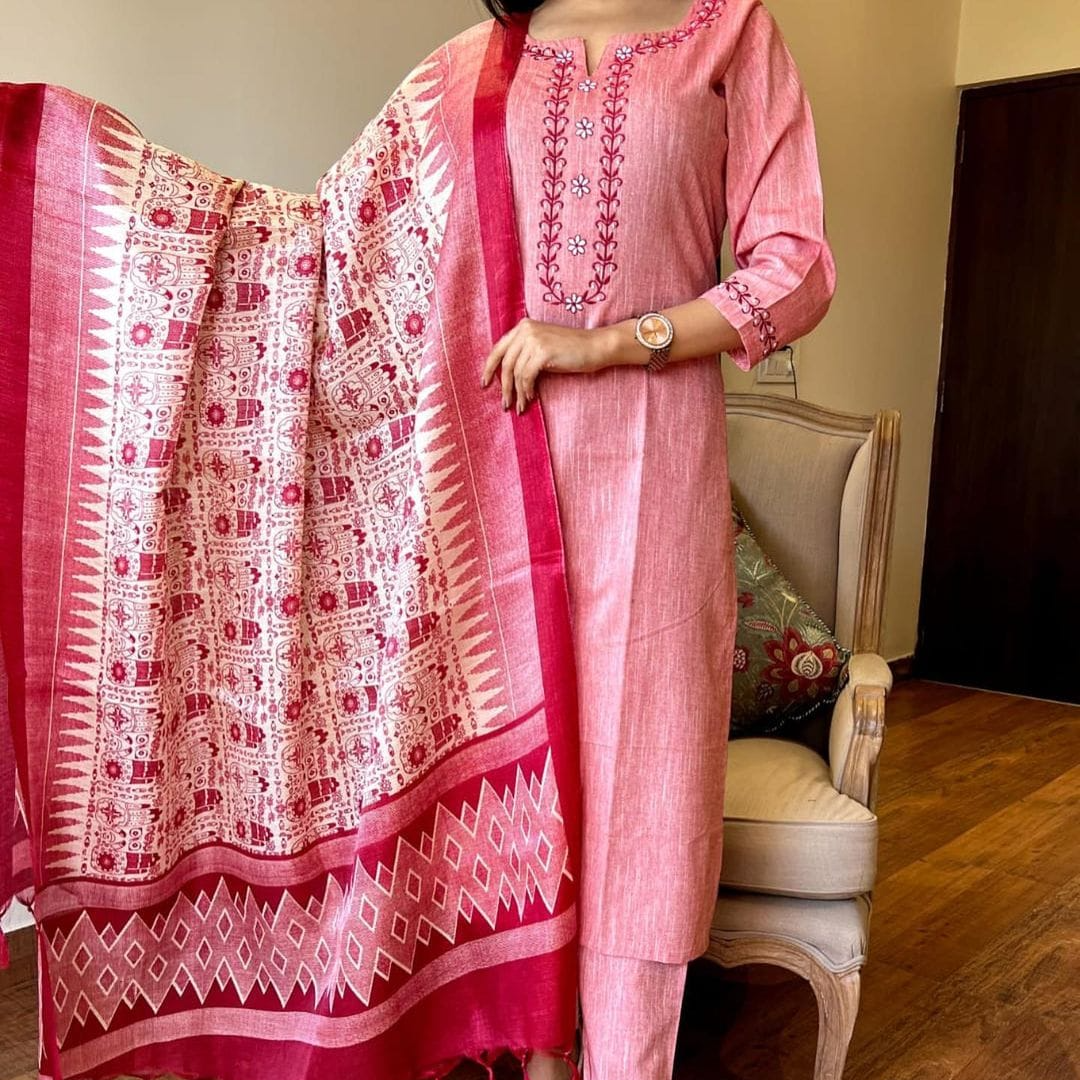 The uber classy sou khadi cotton embroidery suit and khadi silk dupatta sett give a classy look...❤💜