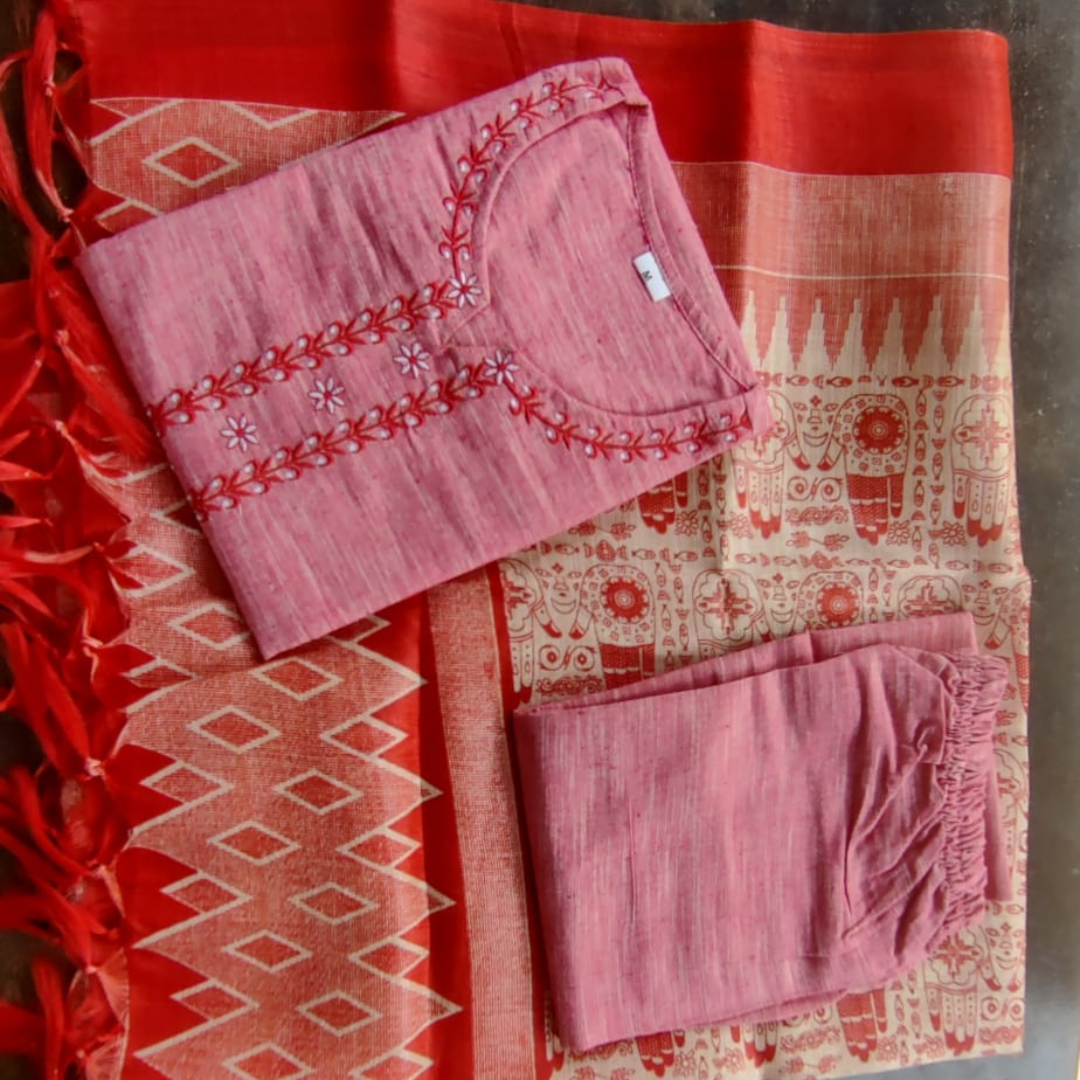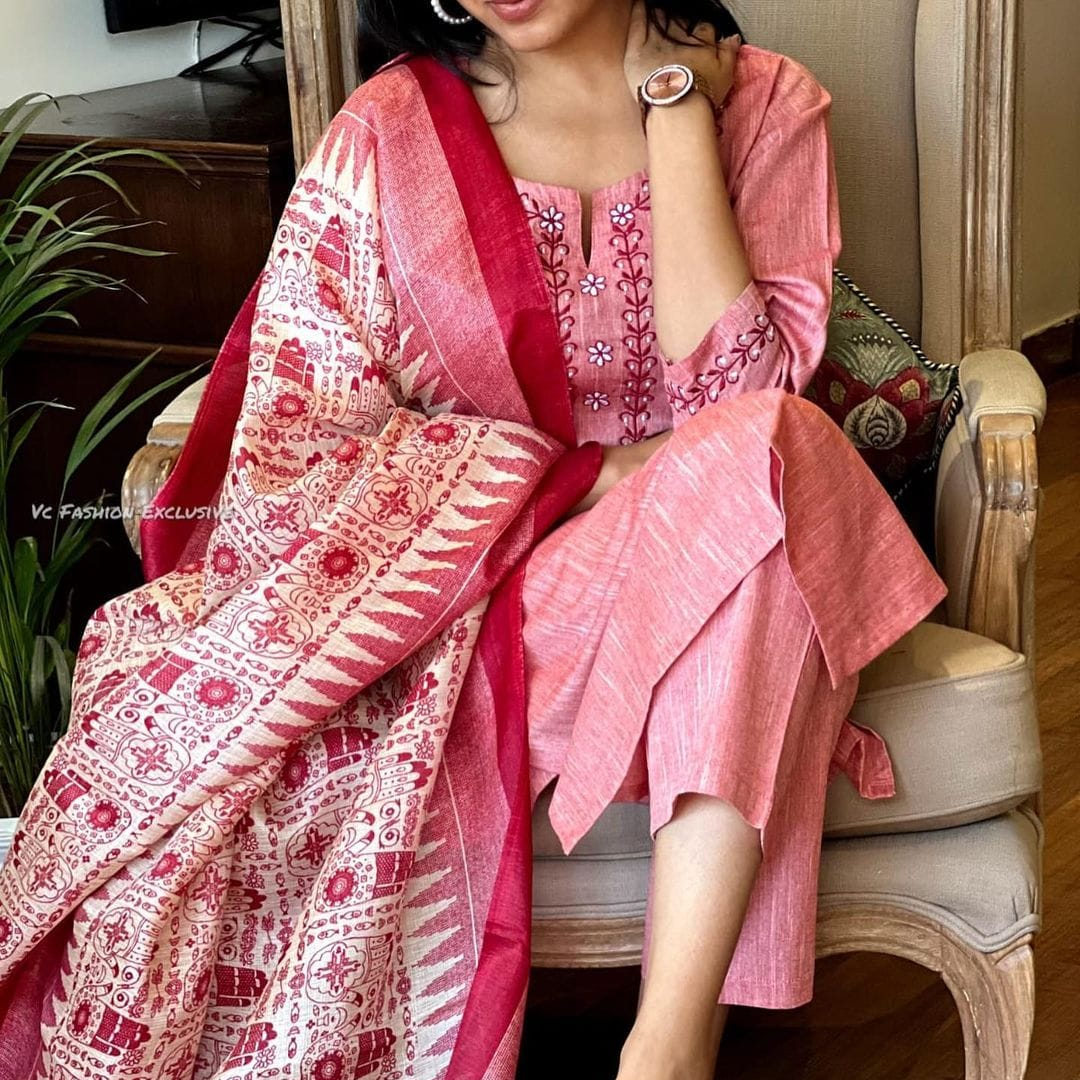 Pure HANDLOOM khadi cottonweaving-basedd fabric all over embroidery. Paired with straight cotton pants. Embroidery on hems and beautiful shadekhadii silk dupatta..👗👗